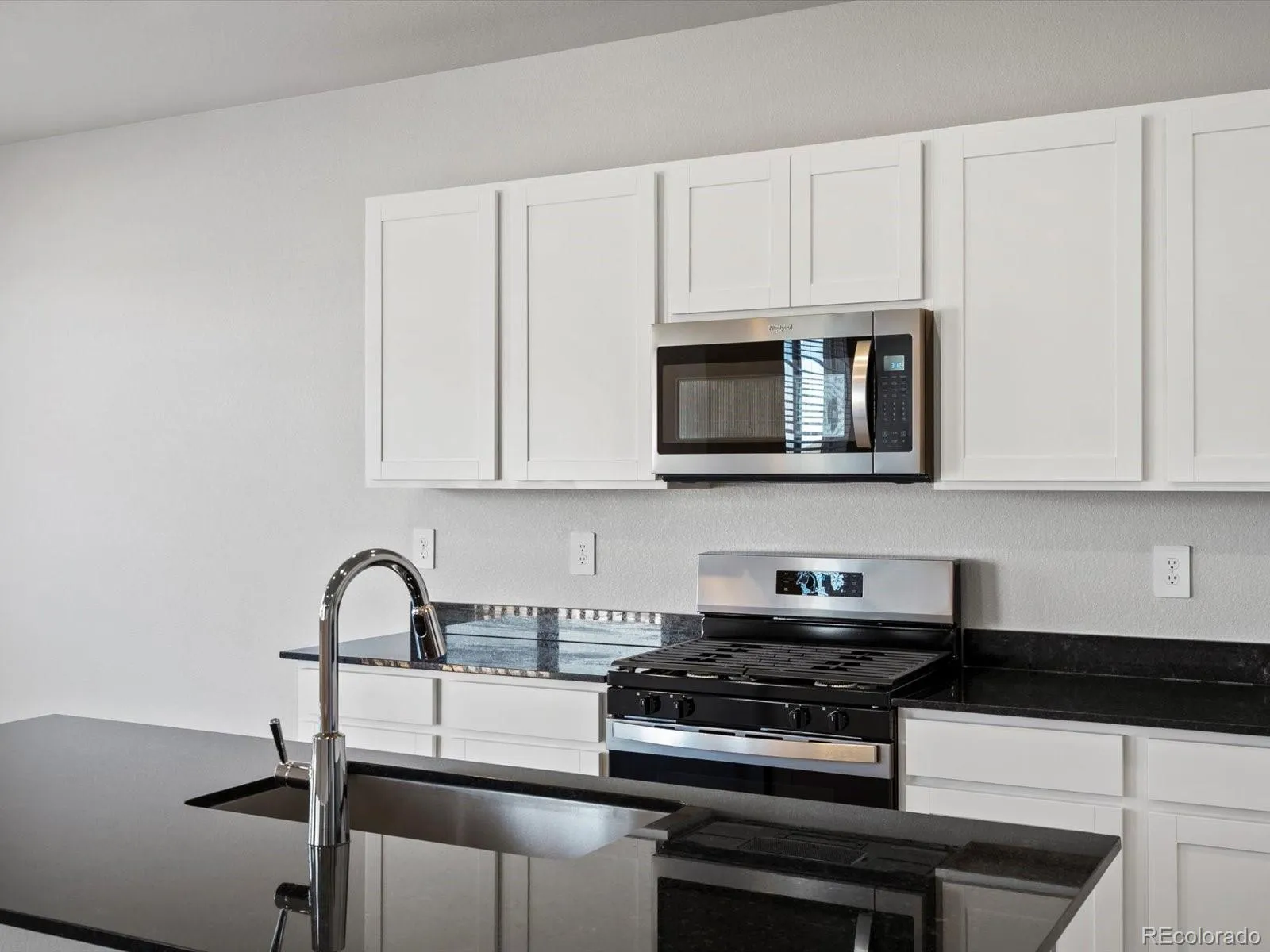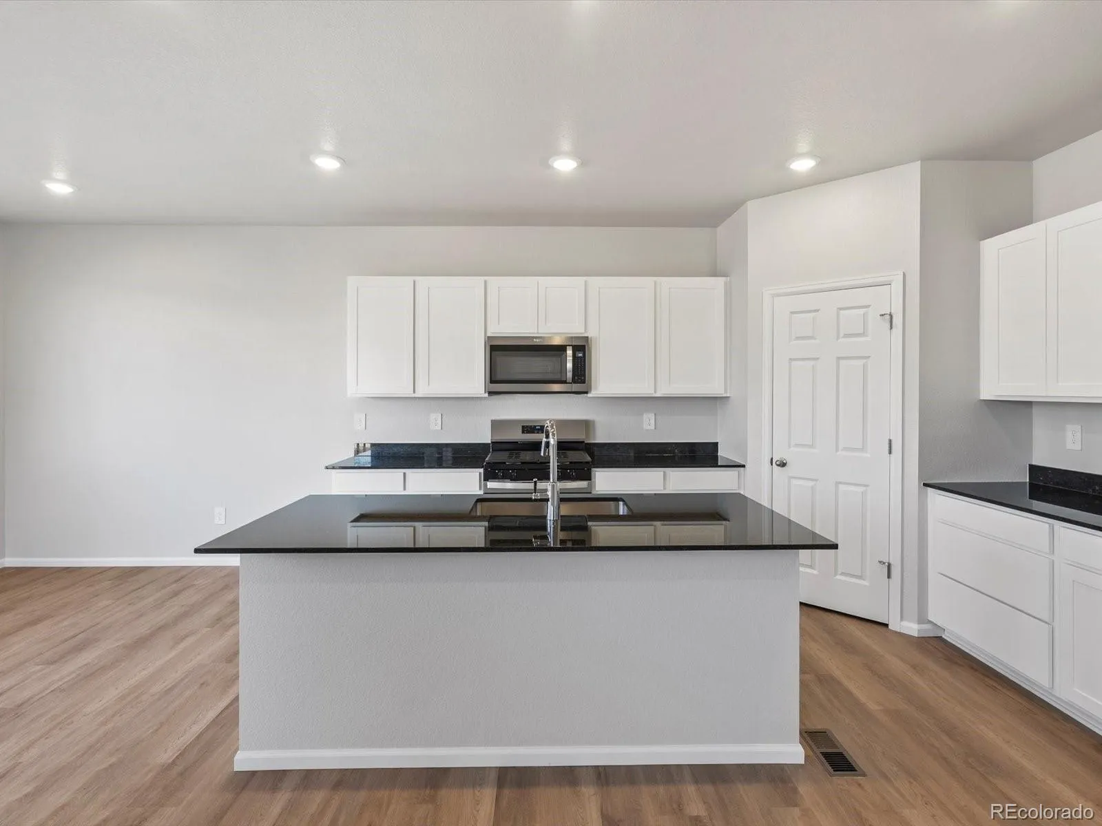 Open concept kitchen with granite countertops and white cabinets!