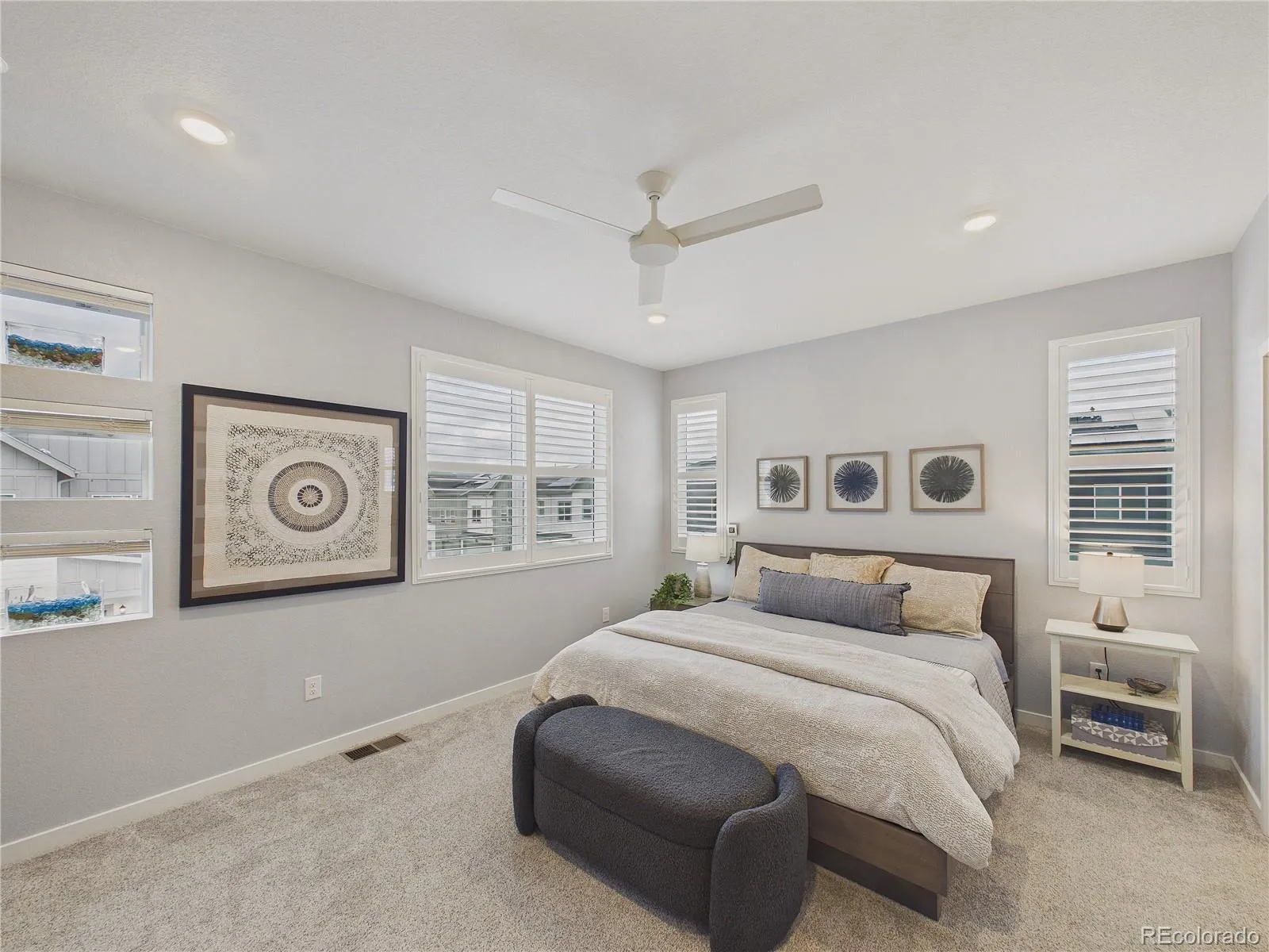 Welcome to this upgraded end-unit townhome in Whisper Village, where thoughtful updates, natural light & open-space views come together for elevated everyday living. With only one shared wall, this home offers added privacy along with sweeping views of the mountains & nearby open space from the inviting front porch. Step inside to a bright main level featuring luxury vinyl plank flooring & a seamless flow between the living & kitchen areas. The living room is equipped with a built-in TV mount & discreet cord management system for a clean, modern look. The kitchen has been extensively enhanced with abundant cabinetry, granite countertops, an extended island with an upgraded sink & bar seating—perfect for casual meals or entertaining. All appliances are new, including a gas range with a dedicated gas line. A convenient powder bath completes the main level. Upstairs, new carpet & padding on the stairs & throughout the upper level add comfort and freshness. The spacious primary suite features a walk-in closet with custom enhancements & a stylish barn door entry. The en suite bath includes dual sinks, slab quartz countertops & a new Euro-glass shower enclosure for a refined finish. Two additional bedrooms share a full Jack-and-Jill bathroom, each with its own barn door. An upstairs laundry room adds everyday convenience. Additional highlights include a new storm door, solar panels for energy efficiency & a two-car garage with recently coated & sealed flooring, overhead storage shelving & pre-wiring for a future electric vehicle charging station. Enjoy low-maintenance living with HOA-covered exterior maintenance & grounds care, giving you more time to explore the nearby recreation at Standley Lake, along with convenient access to shopping & dining. This is a rare opportunity to own a light-filled, move-in-ready home in one of Arvada’s desirable communities, combining modern upgrades, smart technology & an exceptional location!