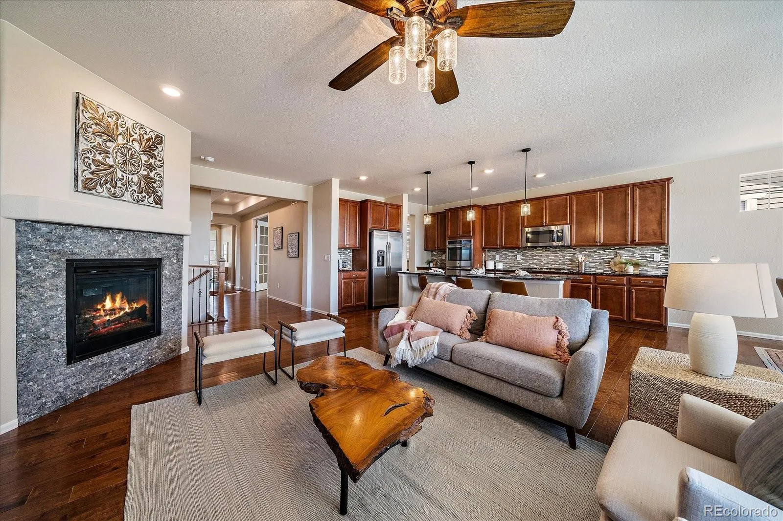 Live a maintenance-free and active lifestyle in this pristine paired home in one of CO’s most prestigious 55+ gated golf course communities. The kitchen has it ALL – tons of counter and cabinet space, SS appliances including double ovens & a gas range, 42-inch cherry cabinets, granite countertops, a huge walk-in pantry, & bartop seating at the oversized island. Open to the living & dining spaces, this kitchen truly is the center of the home. Nine foot ceilings & gorgeous high-end, water resistant hardwood flooring is showcased from the entry & throughout. Beautifully upgraded light fixtures & ceiling fans, large windows, a stacked stone fireplace, & high quality finishes create an inviting, upscale atmosphere. The private primary suite features one of the home’s many tray ceilings, an en-suite bathroom w/ double sinks & a huge walk-in closet with an impressive custom built-in organizing system. The laundry room, with utility sink & added storage cabinets, is conveniently located just off the primary closet for added ease. The main level also includes a secondary bedroom & bathroom, a bonus room with sprawling French doors, an office nook, & a mudroom off the attached 2-car garage. Recent updates include a new roof (2025), new exterior paint (2025), new interior paint (2024), & newer tankless water heater (2024). There’s over 2,000 additional square feet on the lower level, perfect for a workshop space, storage, or more living space in the future. Enjoy mountain views & sunsets from the covered back patio & dining room, plus a welcoming covered front porch that’s perfect for morning coffee. You really can have it all in Heritage Todd Creek, including indoor & outdoor pools, hot tub, clubhouse with on-site restaurant, tennis & pickleball courts, social events, clubs, golf course & driving range. This floorplan, featuring the most square footage out of any of HTC’s paired homes, rarely becomes available, and neither do homes that have been this meticulously maintained.