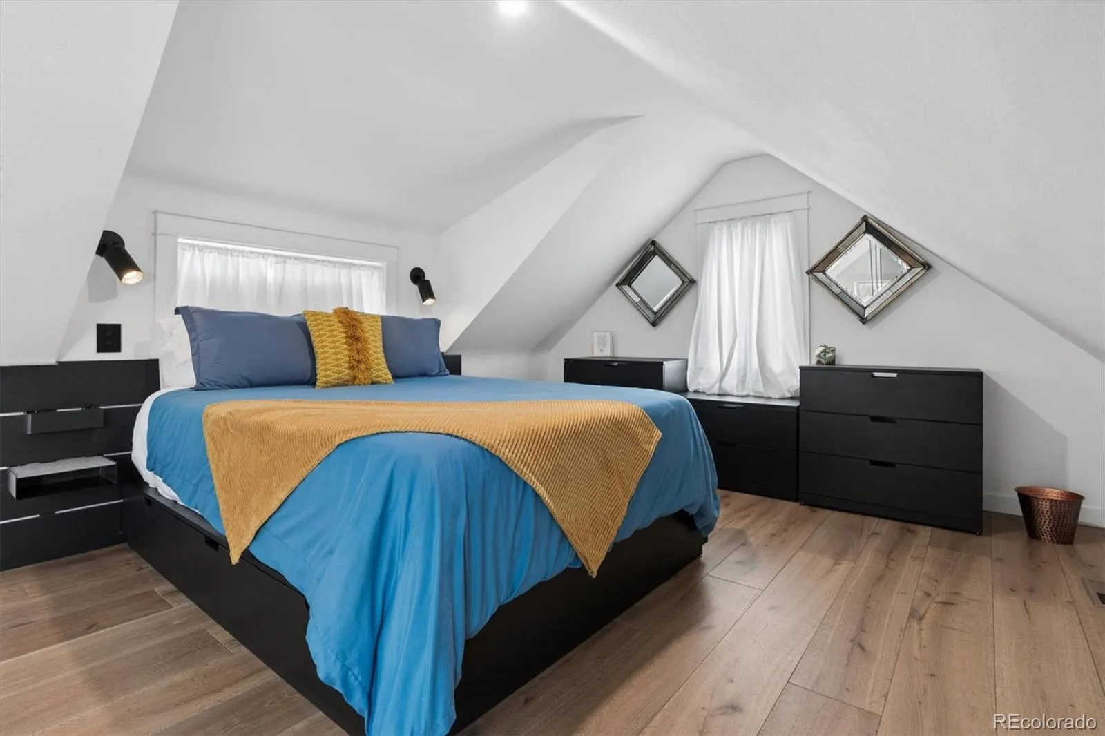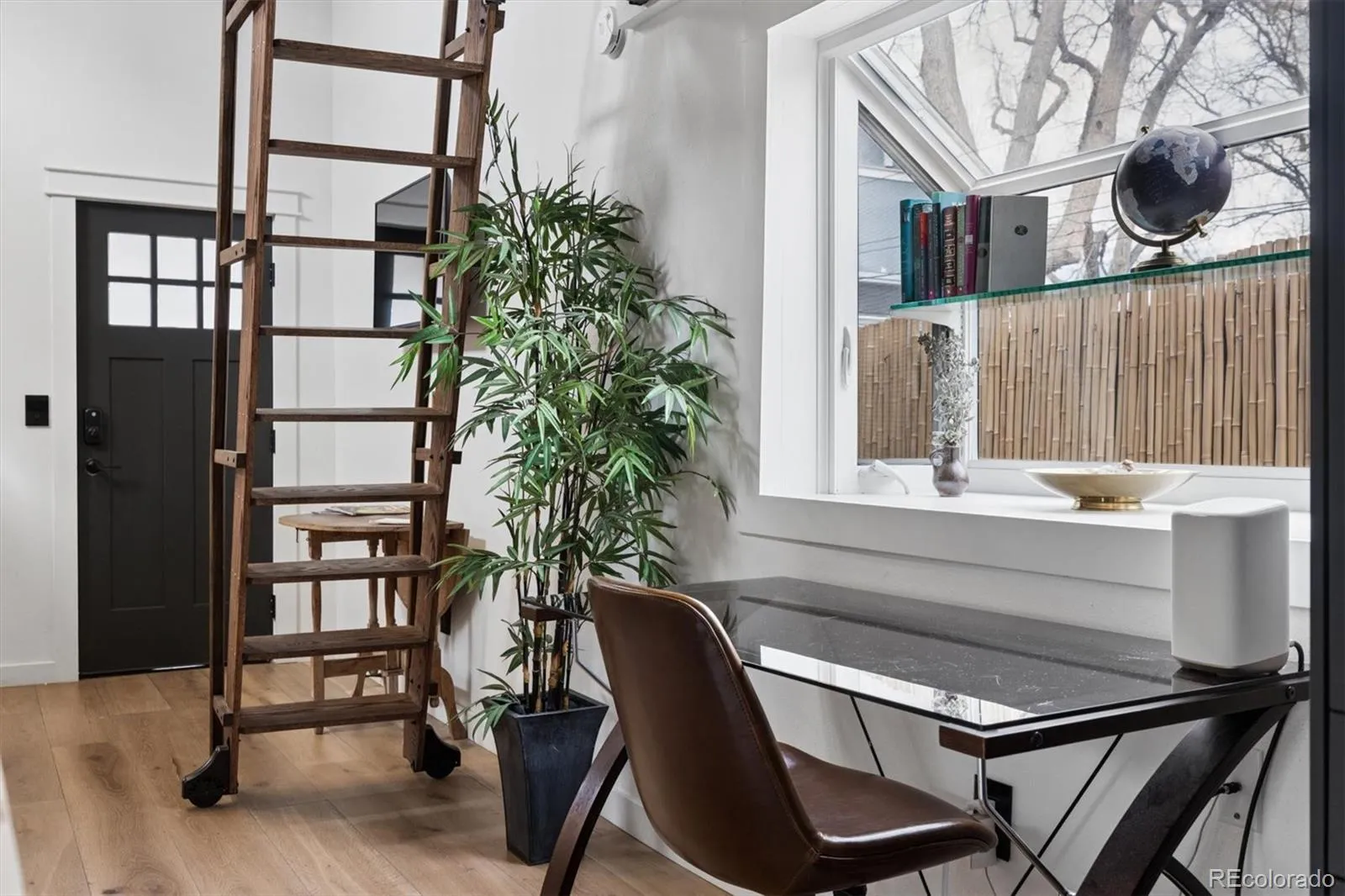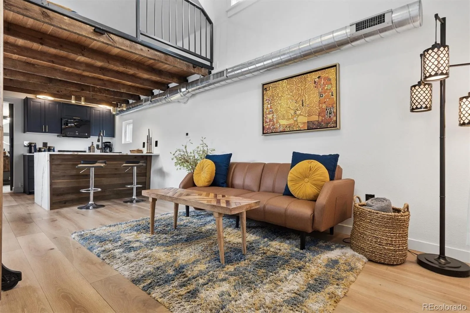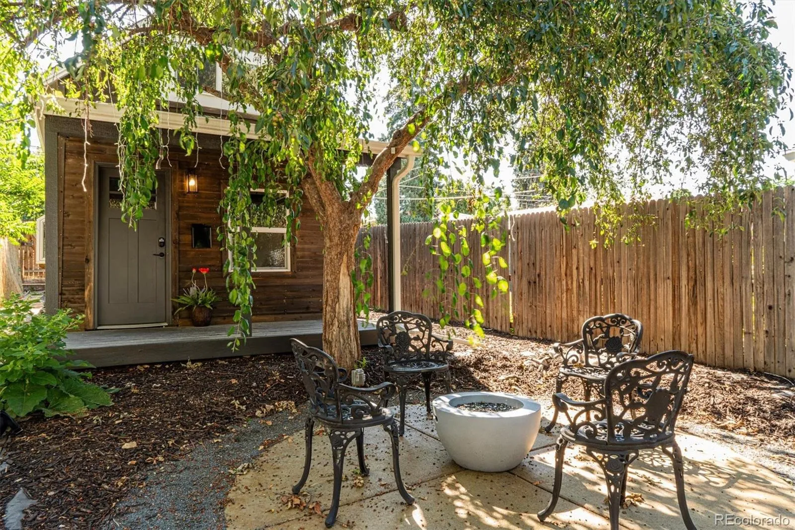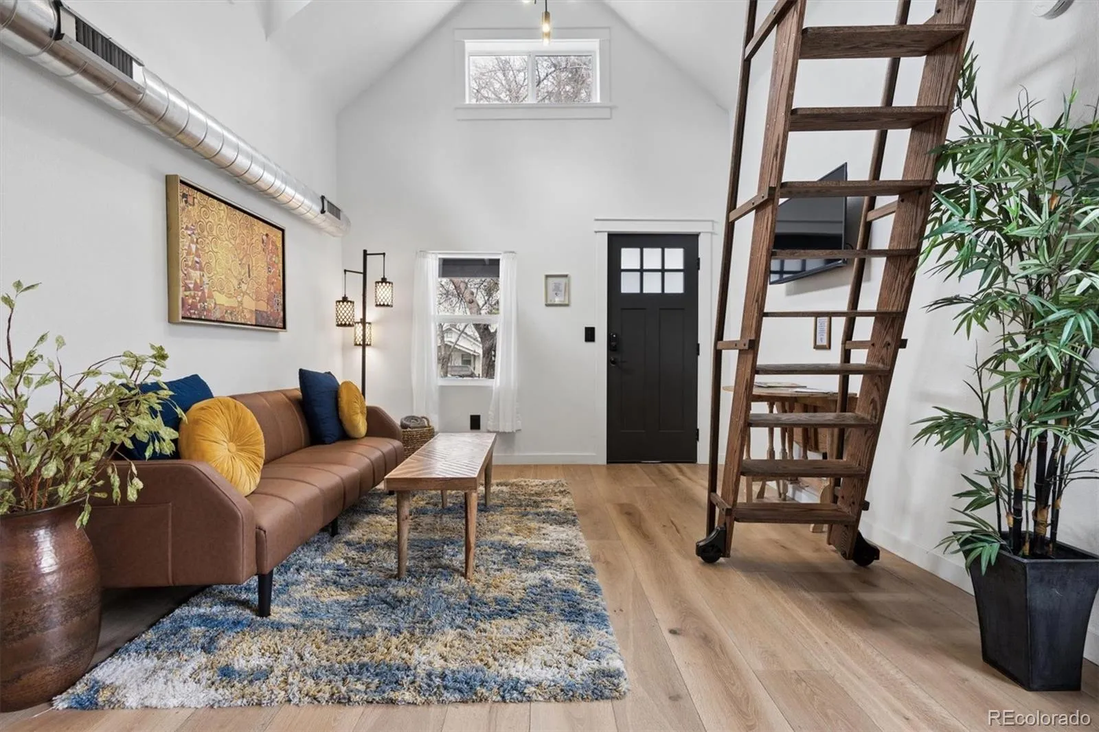 Welcome to the grown-up luxury treehouse you dreamed of as a child, nestled in the heart of Englewood! This charming 1921 home offers 597 square feet of thoughtfully designed living space, perfectly situated within walking distance to coffee shops, restaurants, and local favorites, while still providing quick access to hiking, skiing, mountain biking, and Colorado’s endless outdoor adventures. Full of character and upgrades, this enchanting home welcomes you with distinctive rough-cut cedar siding, an electronic entry, and a charming storage shed tucked behind the home. Step inside and immediately notice the cutting-edge Livolo glass touch light switches with wireless control, setting the stage for a sleek, modern living experience. The living room features soaring vaulted ceilings and original open beams that add warmth and architectural character, while the open-concept layout seamlessly connects the living spaces. The elegant kitchen is both stylish and functional, featuring rich navy blue cabinetry paired with stunning Calcutta Gold rainfall quartz countertops. A striking black granite sink and ZLINE black-and-gold gas range create a statement for the home chef, while hidden refrigerator and dishwasher panels maintain a clean, seamless look. Ample drawers and cabinetry provide generous storage, and subtle accent floor lighting beneath the cabinets adds a sophisticated touch. The bedroom, accessed by a custom walnut sliding library ladder, offers a cozy and thoughtfully designed retreat. A modern sliding barn door opens to the spacious, fully updated bathroom featuring a beautiful blue ocean-tiled shower, tile flooring, a backlit mirror, and a dedicated area ready for the washer and dryer of your choice. With newer A/C for comfort during Colorado summers and a highly walkable location, this one-of-a-kind Englewood gem offers modern living with distinctive character. Don’t miss the opportunity to make it your own!