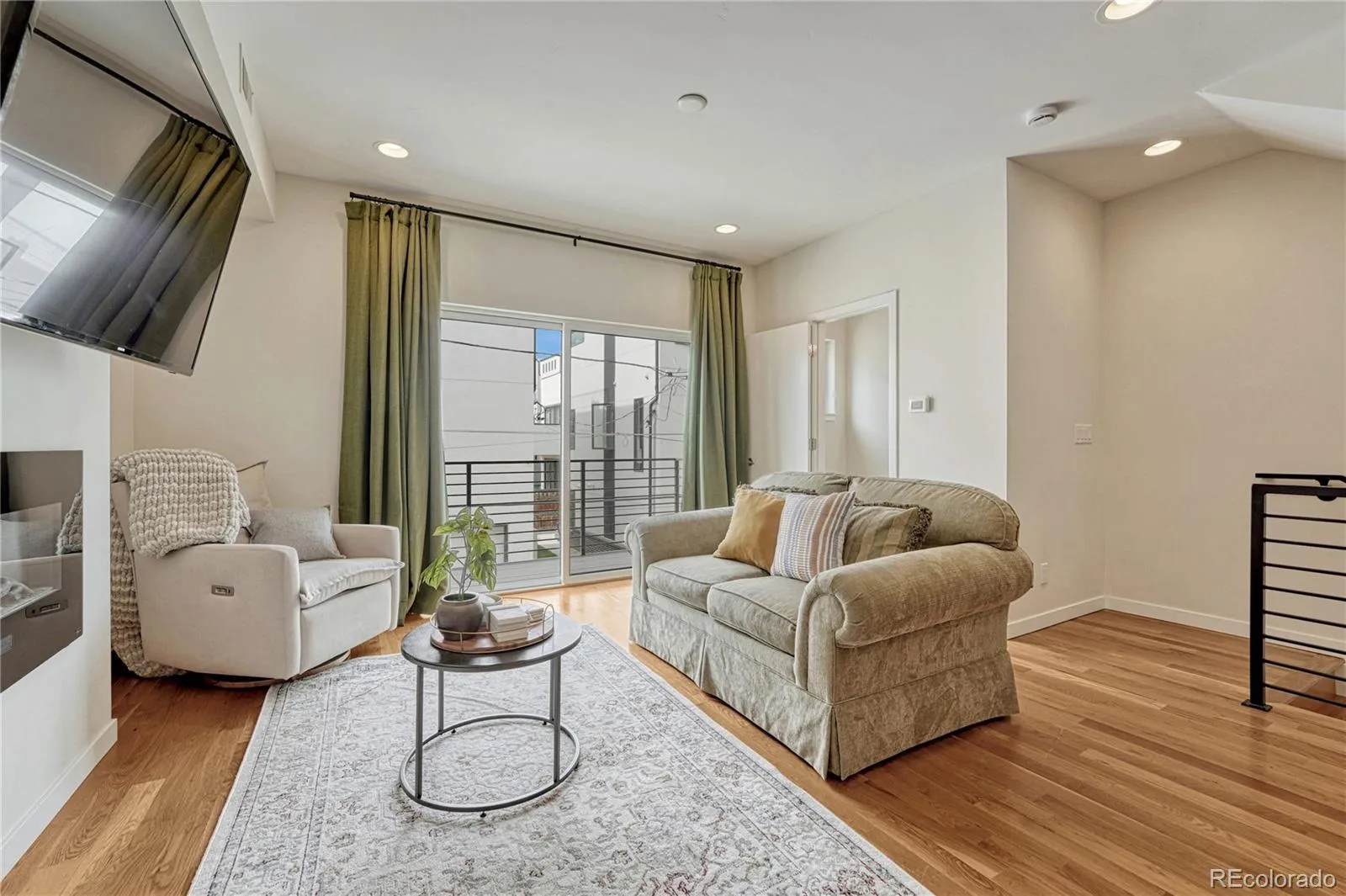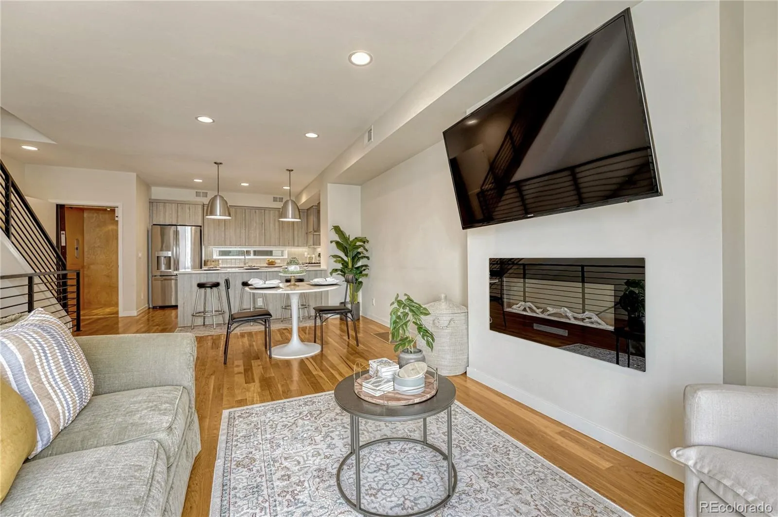The main level features an open-concept layout ideal for entertaining. The chef’s kitchen includes quartz countertops, an oversized island, gas cooktop, undermount sink, flat-slab cabinetry, designer tile, wide plank flooring, and high-end stainless steel appliances. The spacious living area offers an electric fireplace and access to a private balcony with seating space.