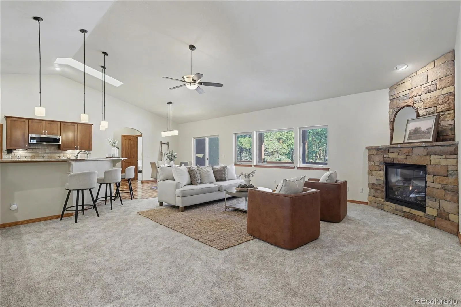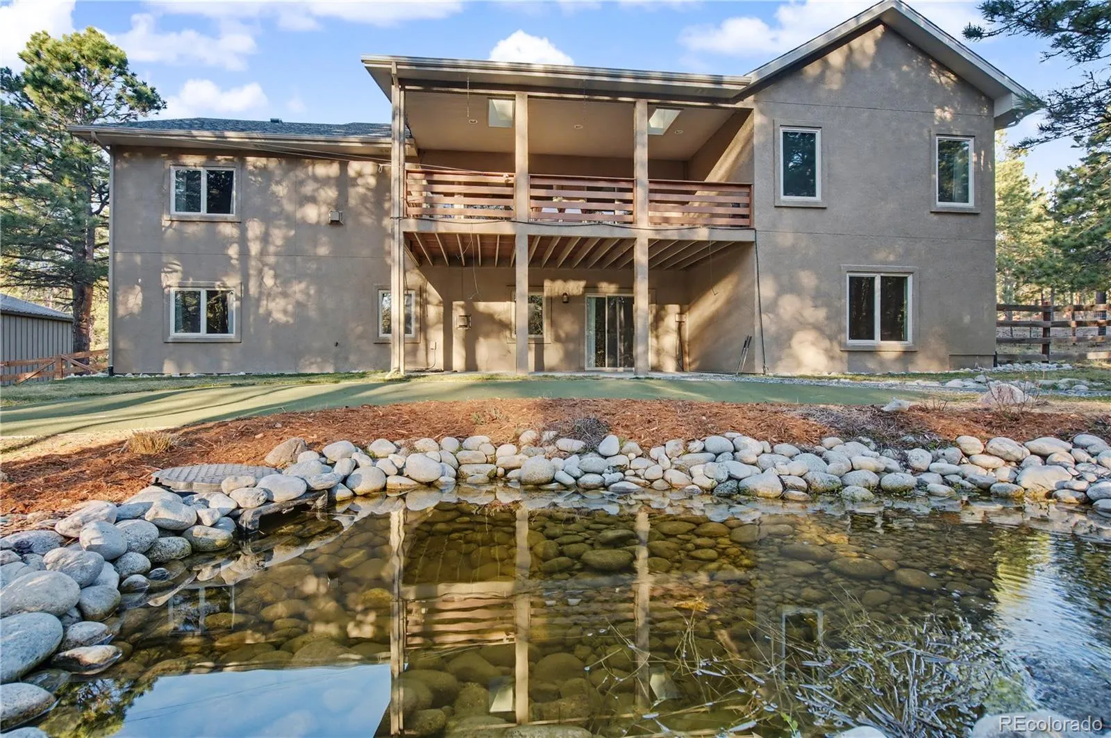 Tucked into a quiet, serene setting, this exceptional home offers the perfect blend of privacy, comfort, and modern luxury—all on 1.3 beautifully treed acres just minutes from Fox Run Regional Park. Boasting approximately 4,700 sqft, this thoughtfully designed ranch-style home with a walk-out basement features 5 spacious bdrms, 3 baths, 3 cozy fireplaces and ALL NEW CARPET. The open, light-filled floor plan creates an inviting atmosphere, ideal for both everyday living and entertaining. No detail has been overlooked. Enjoy high-end finishes throughout, including granite countertops, rich hardwood flooring and a stunning stucco exterior accented with wood and stone. French doors open toa flexible space for a guest bedroom, home office or study to suit your lifestyle. The gourmet kitchen, which features stainless steel appliances, a movable granite island and a double oven, flows seamlessly into the main living areas. Step outside to a covered deck overlooking a beautiful mix of mature trees, open space and a landscaped pond with a waterfall feature and putting green. The Primary bedroom located on the Main Level is the ultimate retreat with an ensuite 5-piece bath w/ jetted tub, fireplace and heated floors. The fully finished walk-out basement offers additional living space complete with a pool table, fireplace, wet bar and media/bonus room. Perfect for entertaining! Each bathroom offers an added touch of luxury with individual thermostats for radiant heated tile floors. The basement level walks out to a covered, concrete patio in a private, treed setting- pre-wired for a hot tub. Additional highlights include a circular driveway w/gates, a finished attached 3 car garage, fully fenced back yard, storage shed w/dog kennels, a chicken coop and a fabulous 36×40 Barn for additional vehicles, RV parking and more! This is a rare opportunity to enjoy peaceful, private living without sacrificing convenience. Truly a one-of-a-kind property – come experience it for yourself!