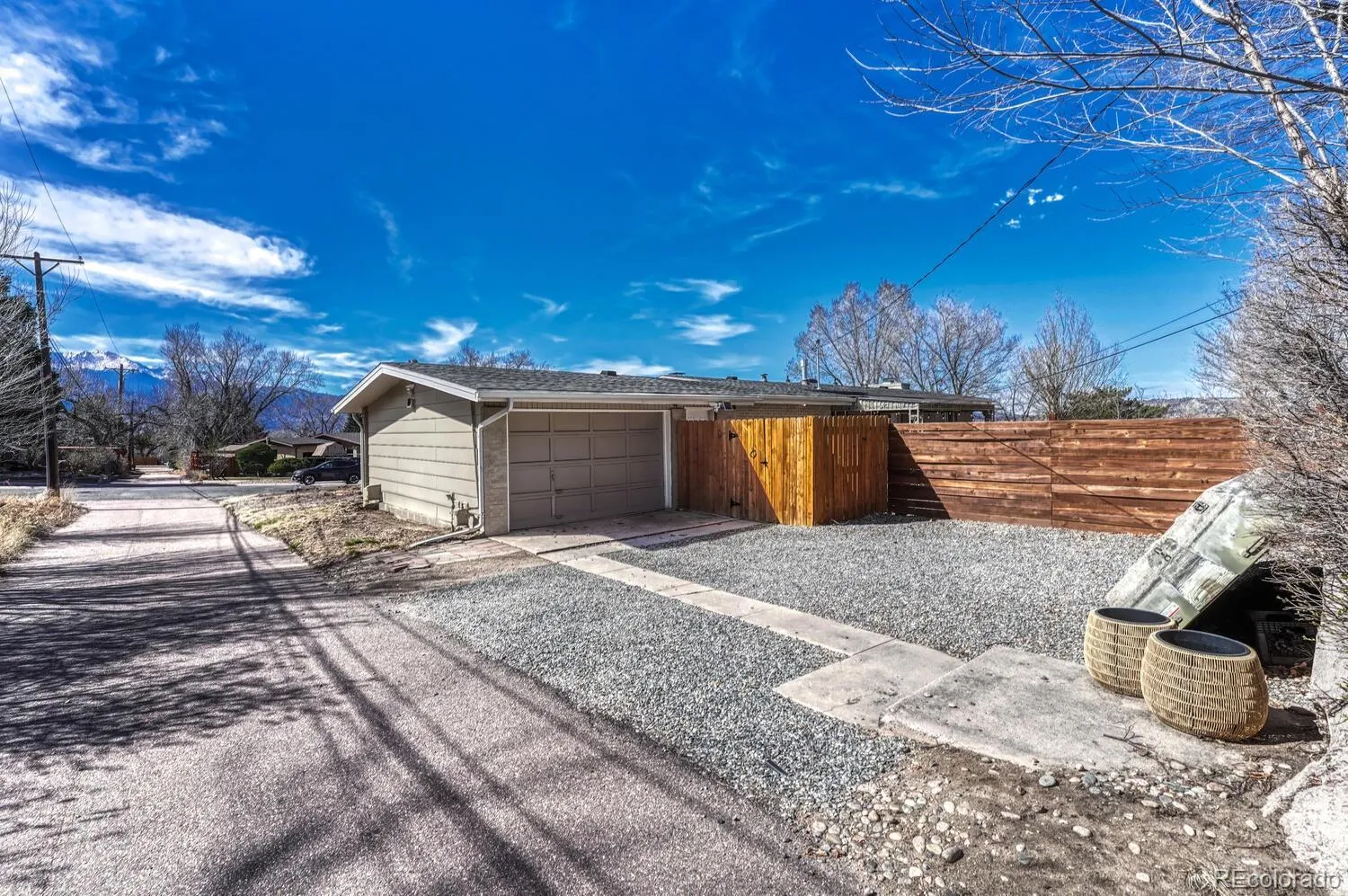 MUST SEE! Welcome to this charming four-bedroom, three-bath bungalow, thoughtfully updated and lovingly maintained, featuring an attached one-car garage in front PLUS an additional oversized alley-access garage bay with room for up to two cars. Step inside to a bright, inviting space that blends character with modern convenience. Natural light pours through updated windows into the living and dining rooms, highlighting beautifully refinished hardwood floors. A charming wood-burning fireplace with an updated tile surround and wood mantle serves as the centerpiece between the two spaces. The formal dining room features a new light fixture and stunning Pikes Peak mountain views. Just off the dining area and kitchen is an adorable breakfast nook with walkout access to the backyard. The fully updated kitchen is equipped with stainless steel appliances, a new sink, lovely upgraded blue cabinetry with black hardware, granite countertops, ample prep space, subway tile backsplash, and updated lighting. Large sliding patio doors open to the incredible backyard—perfect for indoor-outdoor living. Enjoy a covered concrete patio, a separate Trex deck, lush lawn, fire pit area, and a hot tub (yes, it is included!). Back inside, the spacious main-level primary suite features private deck access and an updated ensuite 3/4 bath with a double vanity. The main level also includes a second bedroom and a fully upgraded stunning full bath (brand new flooring and vanity!). Downstairs, the basement is designed for entertaining, featuring a second wood-burning fireplace, a chic retro wet bar, and flexible space for a home office, gym, playroom, or media area. Other perks are forced air A/C, a new fence, fiber internet installed, and upgraded electrical. Not only is this home stunning inside and out, but the location is stellar. Up the street is a great park, and you are just minutes from shopping, dining, and the bustling downtown lifestyle –this home truly has it all!