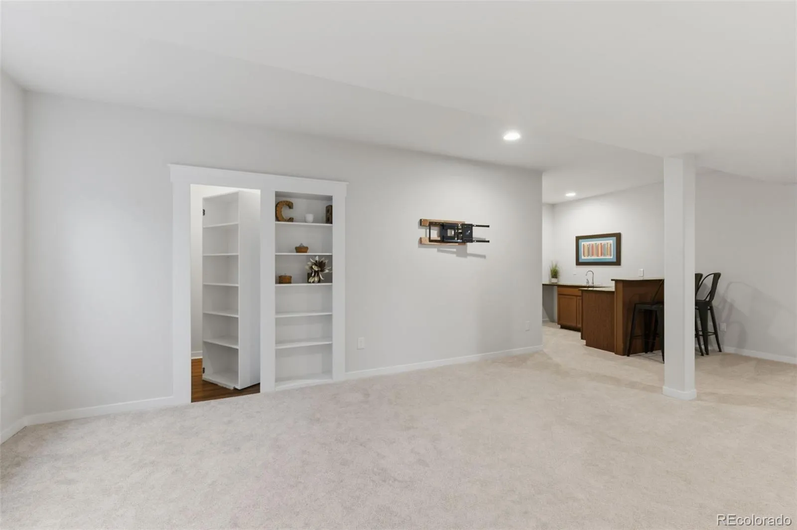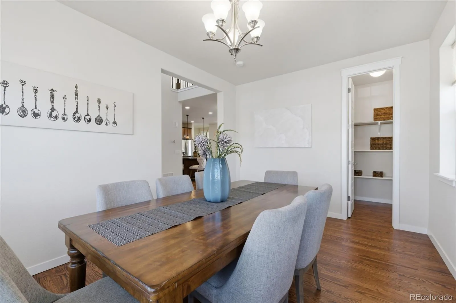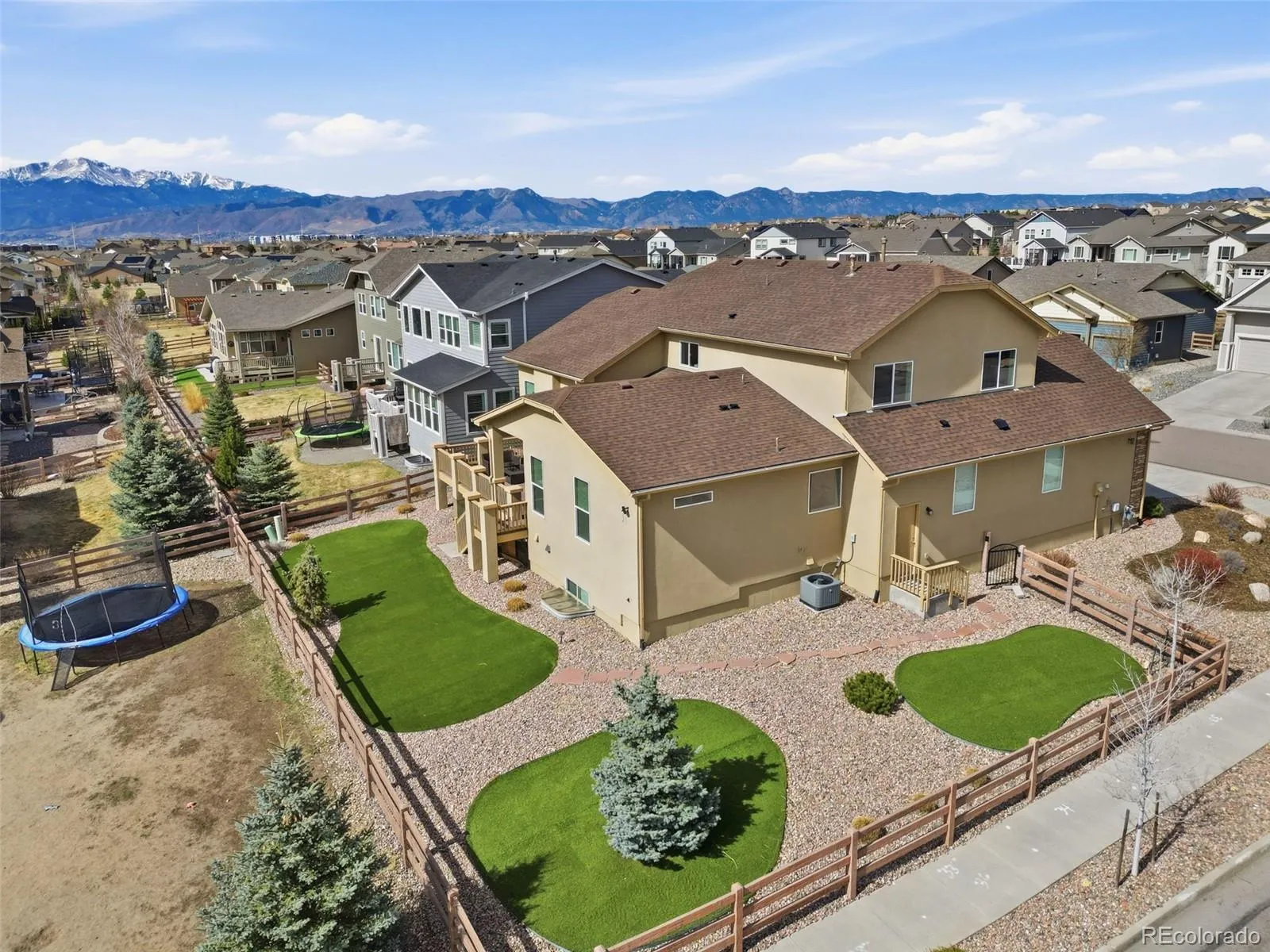 Amazing Wolf Ranch 6 bedroom, 5 bathroom, two-story with main-level primary suite and room for everything! This beautifully upgraded home features site-finished hardwood floors throughout the kitchen, great room, and formal dining room. The gourmet kitchen includes a massive island with built-in storage, upgraded cabinetry, granite countertops, custom pull-out cabinet system, upgraded appliances, five-burner gas range, and GE refrigerator with built-in Keurig. The kitchen nook walks out to an expanded deck, perfect for indoor-outdoor living. The great room offers vaulted ceilings and a fireplace, while the formal dining room with Butler’s pantry is ideal for entertaining and could convert to a large office or bedroom. A separate front office provides the perfect work-from-home space. The spacious main-level primary suite features a five-piece bath and custom closet system. The main floor also includes a large laundry room with sink, cabinetry, and two closets. Upstairs, the loft overlooks the great room and works well as a second living or study space. Three upper bedrooms include one with walk-in closet and another with walk-in closet and private full bath, plus an additional ¾ bath. The finished basement is huge with wet bar and hidden “secret room” behind a built-in. Two basement bedrooms (one with French doors), a large flex/hobby room, and a ¾ bath bring the total to five bathrooms. Enjoy the fully fenced yard with xeriscaping, artificial turf, mountain views, and a partially covered deck. Large corner lot adds openness. Oversized tandem garage, with EV charger prewiring, is perfect for multiple vehicles, storage, and a workshop. Extras include security cameras, metal spindles, and Hunter Douglas blinds. HOA dues include the pool, Community Center, dog park, and lake.