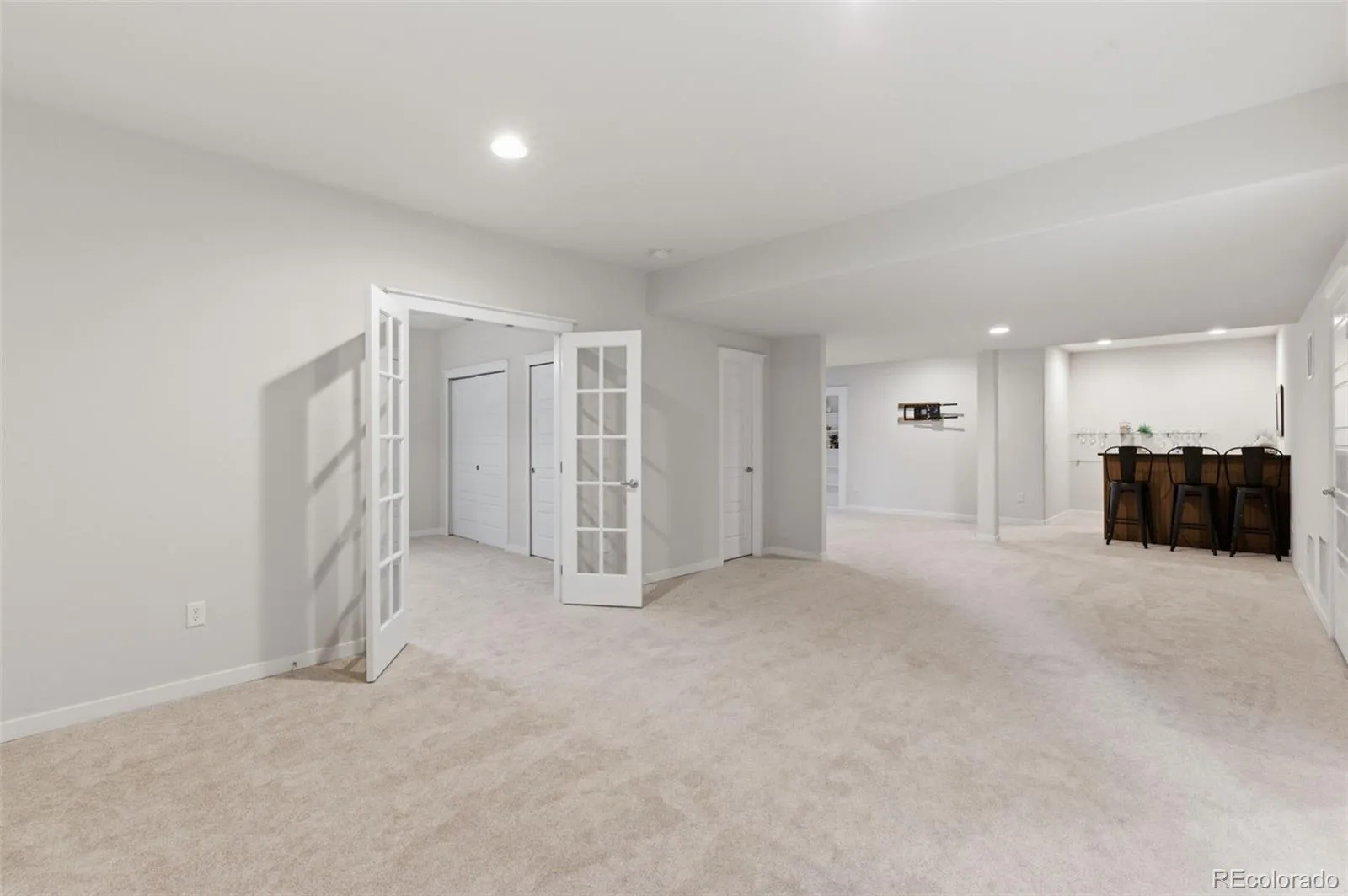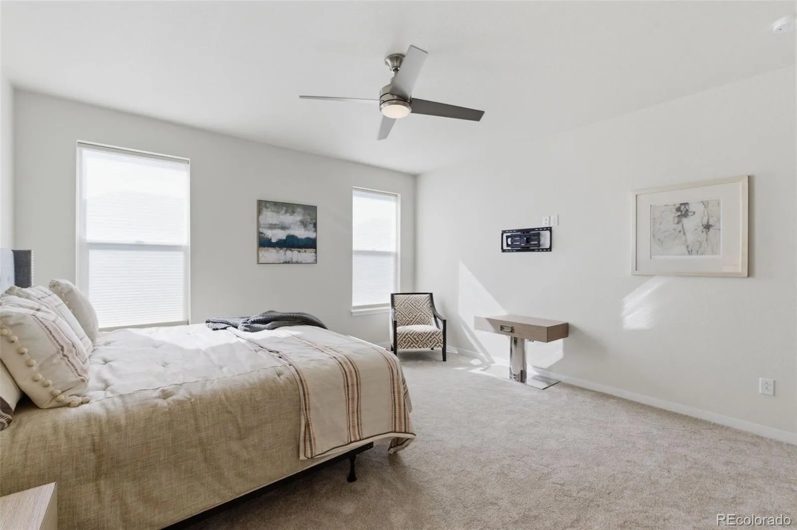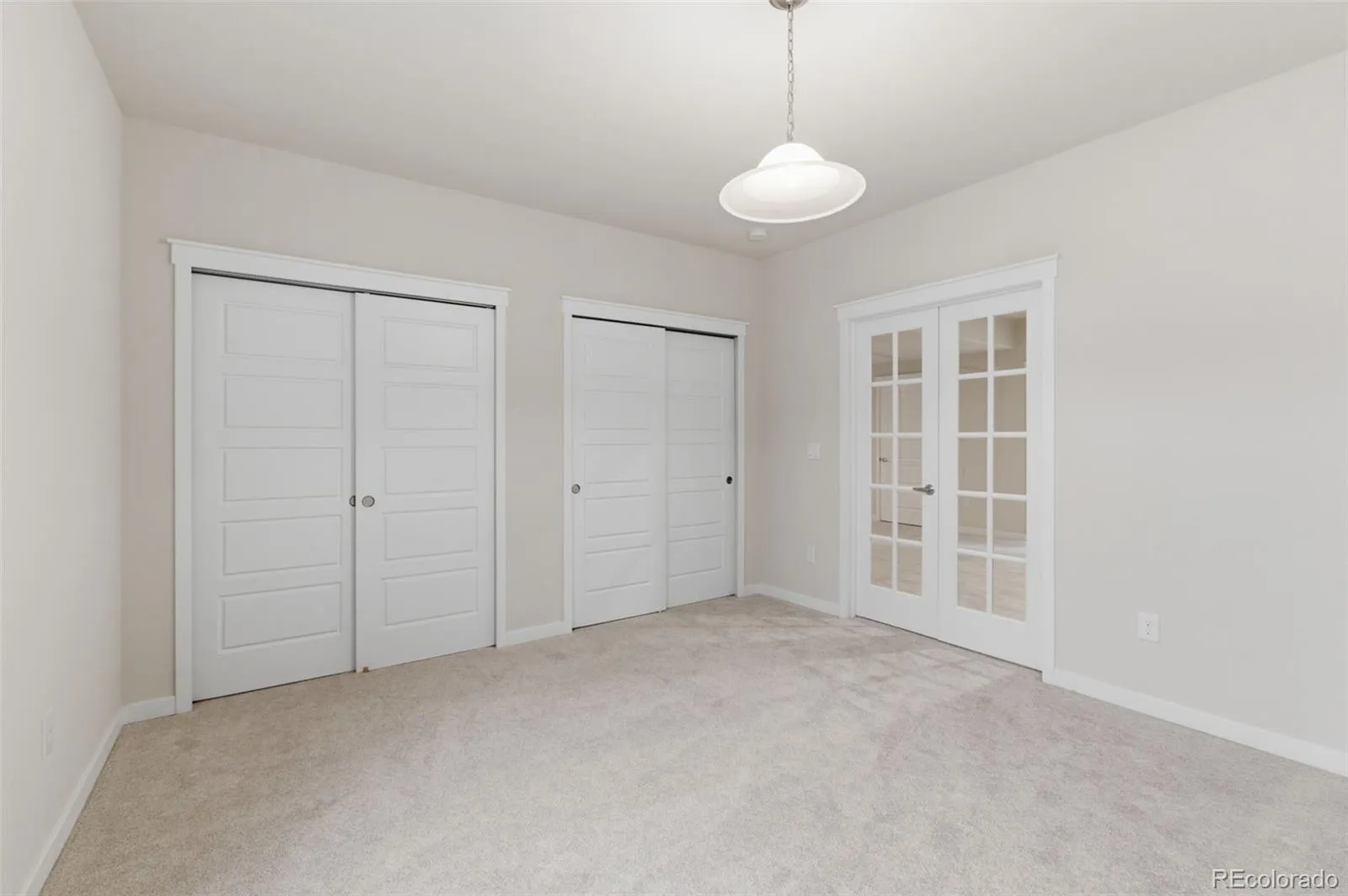Amazing Wolf Ranch 6 bedroom, 5 bathroom, two-story with main-level primary suite and room for everything! This beautifully upgraded home features site-finished hardwood floors throughout the kitchen, great room, and formal dining room. The gourmet kitchen includes a massive island with built-in storage, upgraded cabinetry, granite countertops, custom pull-out cabinet system, upgraded appliances, five-burner gas range, and GE refrigerator with built-in Keurig. The kitchen nook walks out to an expanded deck, perfect for indoor-outdoor living. The great room offers vaulted ceilings and a fireplace, while the formal dining room with Butler’s pantry is ideal for entertaining and could convert to a large office or bedroom. A separate front office provides the perfect work-from-home space. The spacious main-level primary suite features a five-piece bath and custom closet system. The main floor also includes a large laundry room with sink, cabinetry, and two closets. Upstairs, the loft overlooks the great room and works well as a second living or study space. Three upper bedrooms include one with walk-in closet and another with walk-in closet and private full bath, plus an additional ¾ bath. The finished basement is huge with wet bar and hidden “secret room” behind a built-in. Two basement bedrooms (one with French doors), a large flex/hobby room, and a ¾ bath bring the total to five bathrooms. Enjoy the fully fenced yard with xeriscaping, artificial turf, mountain views, and a partially covered deck. Large corner lot adds openness. Oversized tandem garage, with EV charger prewiring, is perfect for multiple vehicles, storage, and a workshop. Extras include security cameras, metal spindles, and Hunter Douglas blinds. HOA dues include the pool, Community Center, dog park, and lake.