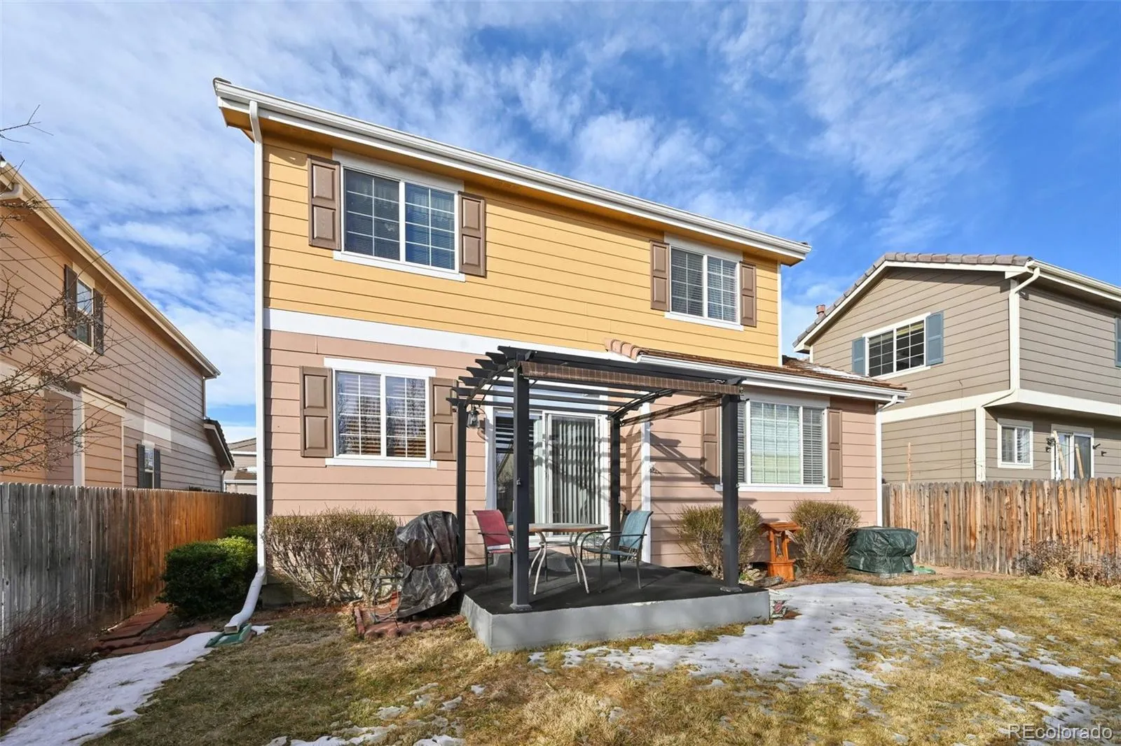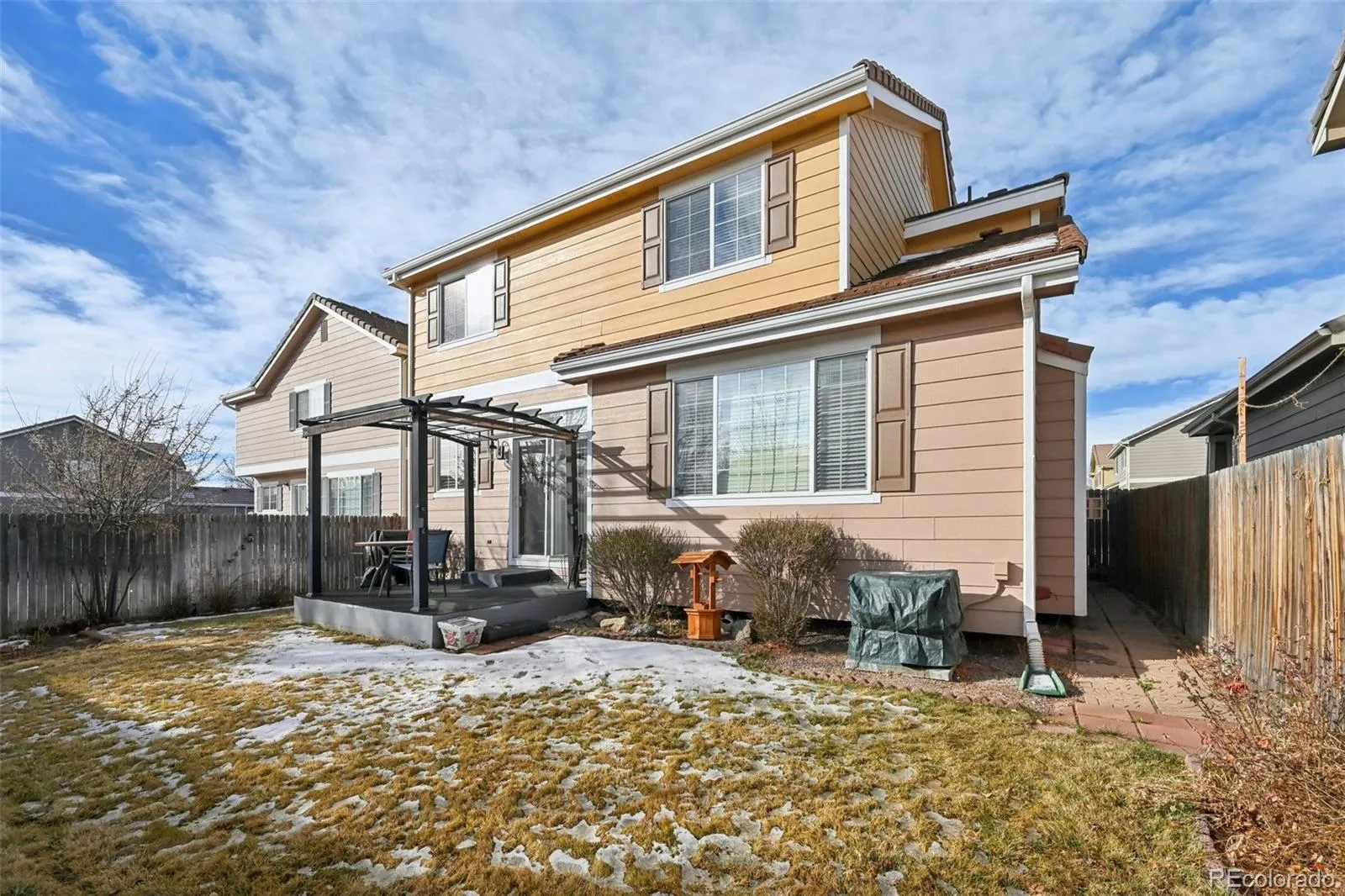 This spacious home has been lovingly and meticulously maintained by the original owners since it was completed. Boasting one of the larger floor plans in the neighborhood, this home features 5 bedrooms and 4 bathrooms. As you walk through the front door, you’re greeted by a large and bright living room, opening to the dining room and kitchen beyond. The kitchen features updated granite countertops and original wood cabinets, blending perfectly with the hardwood floors throughout the main and upper levels. The main level also features a half bathroom and laundry room. Upstairs is the large primary en suite with walk-in closet and 5 piece bathroom. 3 additional bedrooms upstairs that share a full bathroom. The finished basement features updated laminate flooring, additional bedroom and half bathroom, and a bonus room with fireplace. Backyard features a covered patio with pergola and fully fenced backyard, perfect for enjoying the outdoors. Furnace and AC were newly installed a few years ago. Newly installed driveway, 50 year concrete shingles, and new sump pump. Family friendly neighborhood that’s minutes from Arapahoe Crossings with numerous shops and restaurants, 5 minutes from the Broncos Dove Valley headquarters, 10 minutes from Top Golf, and minutes to multiple trails, open space, and parks. You’ll love living here!