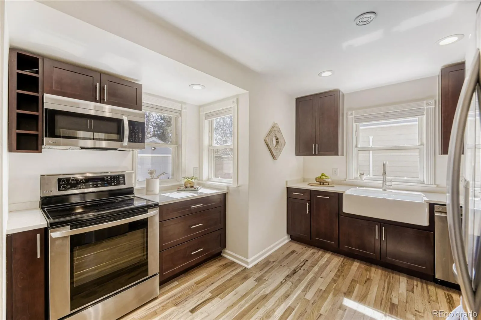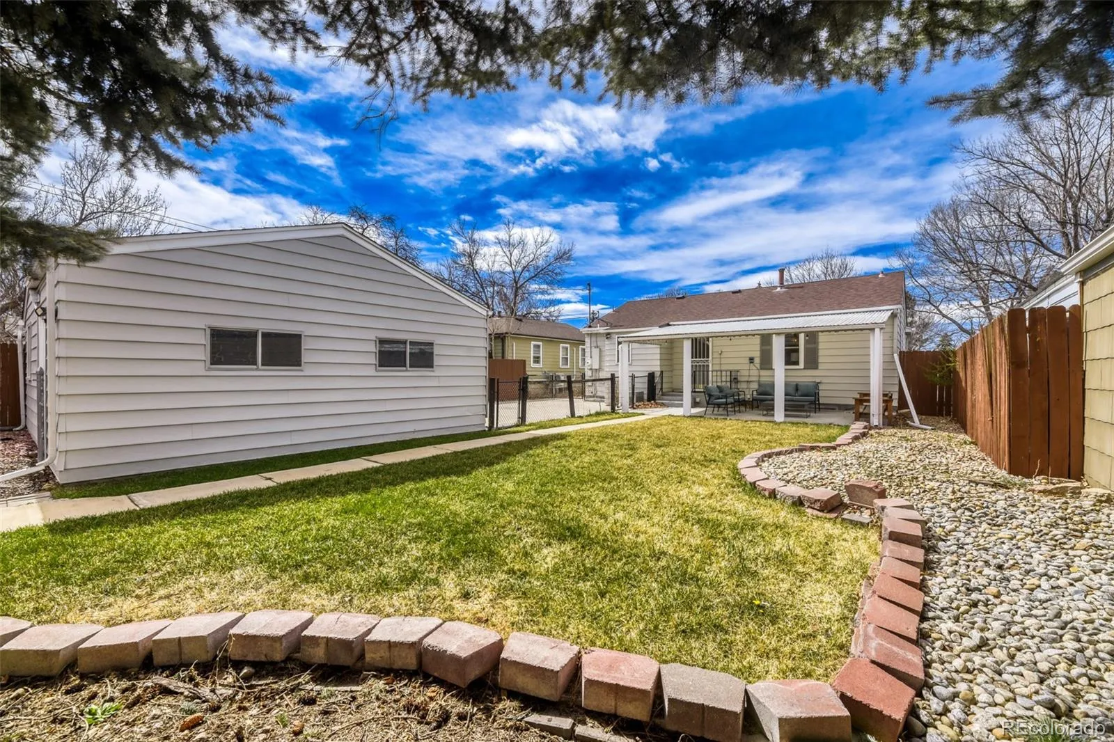 Perfectly located in the highly rated, Slavens K-8 school district, this darling Mid-Century home offers comfort, functionality, and character throughout. The large front porch is the perfect place to sit and watch the world go by. This home is flooded with sunbeams that dance on the beautiful hardwood floors through newer windows on the main level. The original MCM coved ceilings, glass block and rounded door trim remain. Quaint built-ins and niches add charm throughout. The kitchen is nicely updated with ample wood cabinetry including a built in pantry, quartz countertops and stainless steel appliances including an electric stove. The breakfast bar is the perfect place to set out a buffet dinner, catch a quick bite or to sit and chat with the cook. From the adjoining dining area, step out to a covered patio and a private backyard—perfect for relaxing or entertaining. Enjoy the new sod, sprinkler system and sunny garden area behind the 2 car garage. The main floor includes two bedrooms and a full bathroom. The finished basement expands the living space with a family room, two additional bedrooms with egress windows and closets, and a ¾ bath. A large, tidy finished laundry room offers abundant built in storage. The newer windows, the two-car detached garage, the tankless water heater, Nest thermostat and a private yard should make this home comfortable and carefree for many years to come. This move-in ready home truly delivers on location, location, location!
