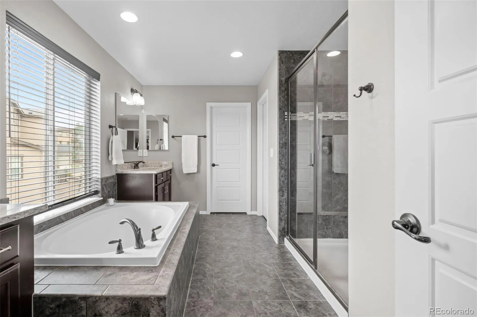 Welcome home to Castle Rock’s PARK PRESERVE Community. Spacious and beautiful this 5 bedroom, 4 bath home with a view of Philip S Miller Park features a full finished basement, and a massive 4 CAR TANDEM garage. The floor plan combines open concept with the traditional. Just off of the front entry is a private office w/French doors. Across the hallway you’ll find a main floor bedroom with easy access to a beautiful 3/4 bath. Warm engineered hardwood flooring leads you to the formal dining room surrounded by lovely wainscoting wall panels w/a coffered ceiling. Gourmet kitchen boasts Stainless Steel appliances, double convection oven, gas cooktop range, gourmet hood, microwave & oversized Kitchen Island. Enjoy meals in the eat-in kitchen area. Sliding glass doors provide access to an impressive outdoor covered living space w/a fenced backyard and pull down shades for privacy. An abundance of windows team together with a cozy fireplace to fill the adjacent living room. Wrought Iron railing leads you to the upstairs where you’ll be greeted by a roomy loft. The ample Primary bedroom hosts a second fireplace in your very own private retreat. The En Suite 5-piece bath offers separate vanities, large tub, and shower with two nozzles and TWO large walk-in closets! Across the hall, bedrooms #3 and #4 each have a walk-in closet and share a full bath w/separate vanities. Laundry Room is handily located upstairs. The beautifully finished full basement provides a second private living space complete with a bedroom large enough for a King size bed and walk-in closet. Down the hall you’ll find a 3/4 bath & a Great Room. The full wet bar comes w/a sink, dishwasher, microwave and full size fridge. Bonus room was used as a music room (acoustic panels) but can easily be used as a non-conforming 6th bdrm, a media room, gym, office or play area. There’s a second Laundry space in the storage area. **No Metro District so the property tax rate is lower than some surrounding communities**