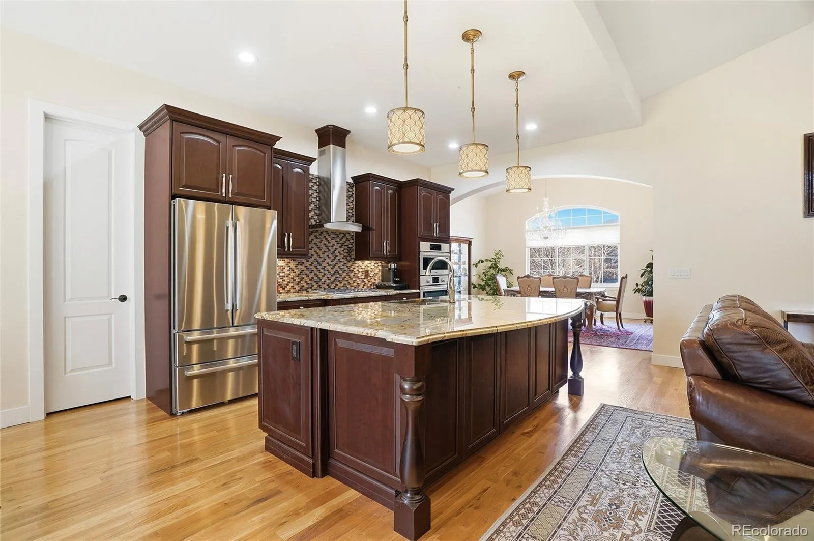 Step inside to appreciate the soaring ceilings, abundant natural light, warm hardwood floors, and spacious open layout that create an inviting atmosphere. The heart of the home is the stunning kitchen, open to the living and dining areas, featuring custom cabinetry, stainless steel appliances, granite countertops, a large island, pantry, and ample storage—perfect for everyday living and entertaining.
