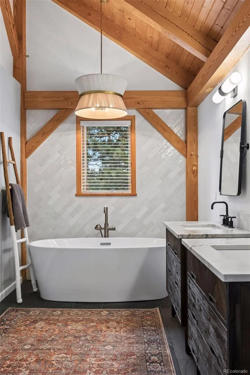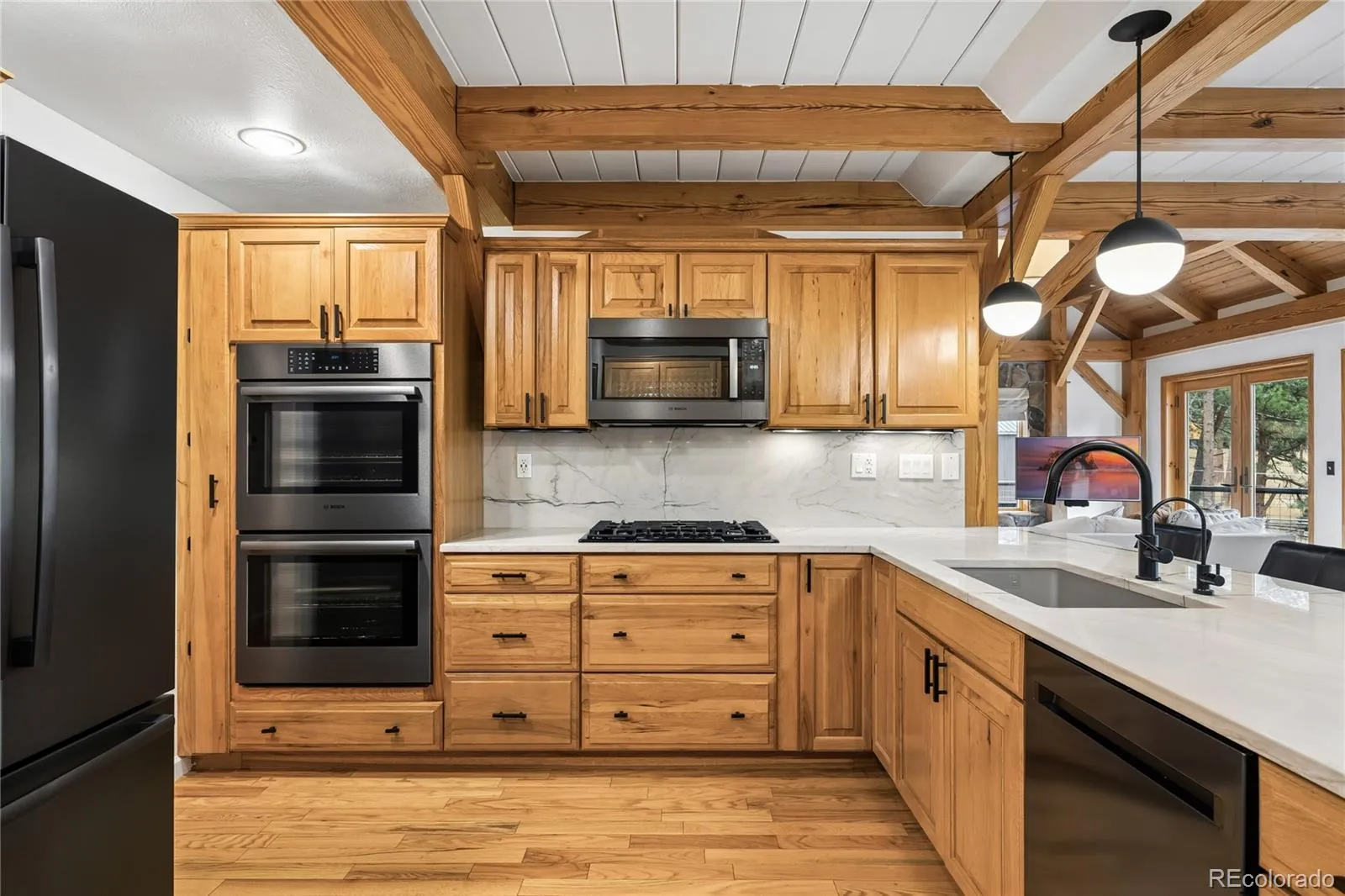 Lovingly updated over the years, this home highlights a mountain contemporary design and offers a true owner’s retreat. The main living area features vaulted ceilings, hardwood floors, a gas fireplace, and an open-concept layout. The kitchen has been thoughtfully renovated with quartz countertops and Bosch appliances.