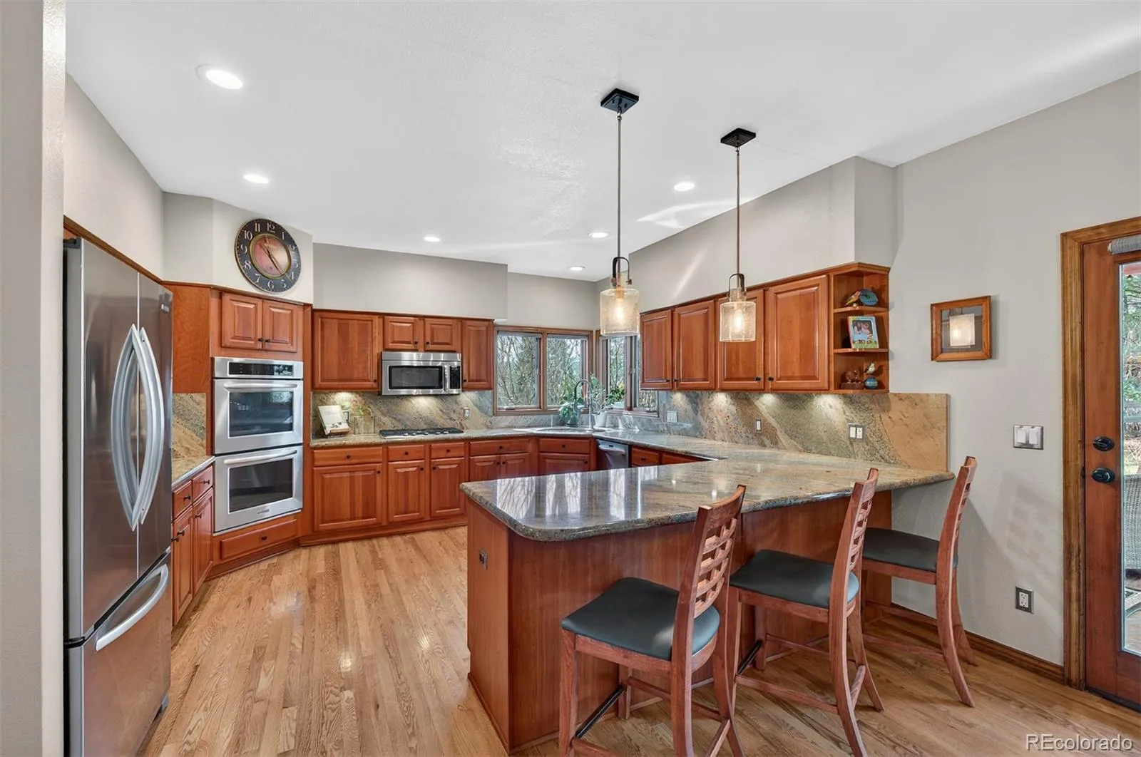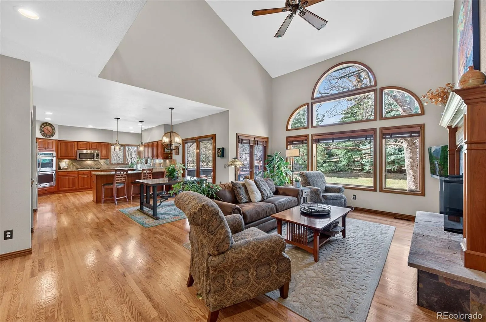 The kitchen is warm and inviting, featuring rich cherry cabinetry, a pantry, abundant storage, an eat-in dining area, and a generous breakfast bar—perfect for gathering with family and friends.