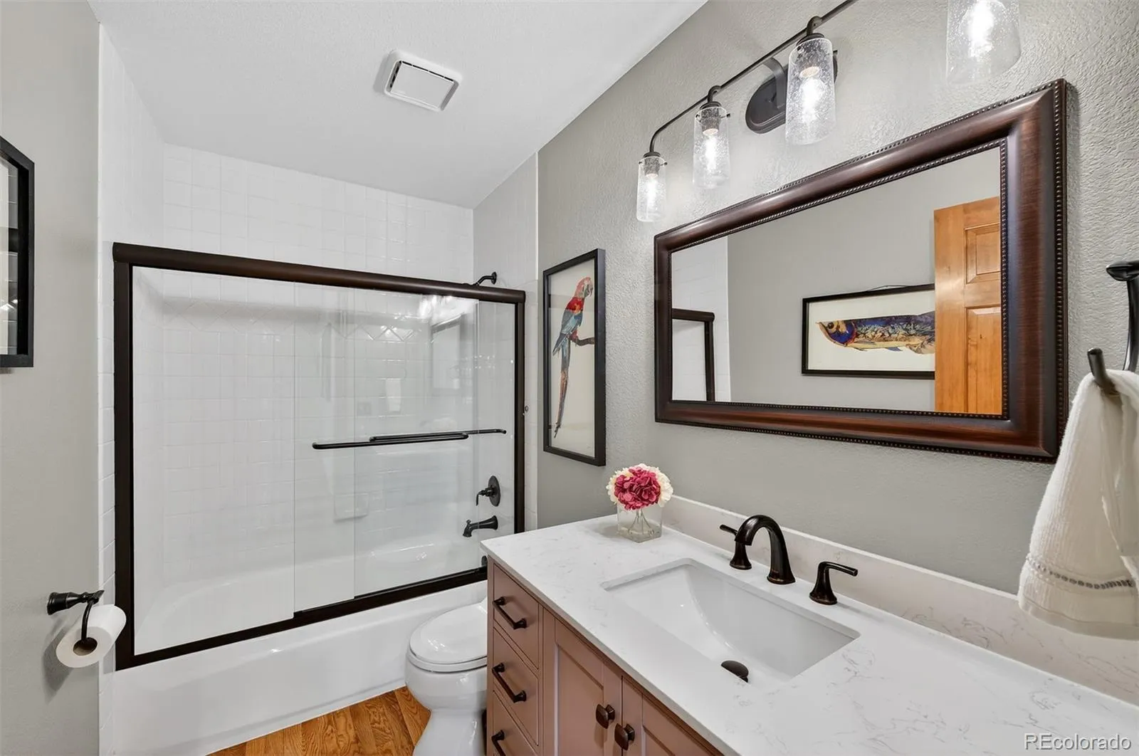 Upstairs, the luxurious primary suite serves as a true retreat, complete with dual closets and a spa-inspired bath featuring dual vanities and heated floors. Three additional bedrooms and two well-appointed (newly remodeled?) bathrooms provide ample space for family and guests.