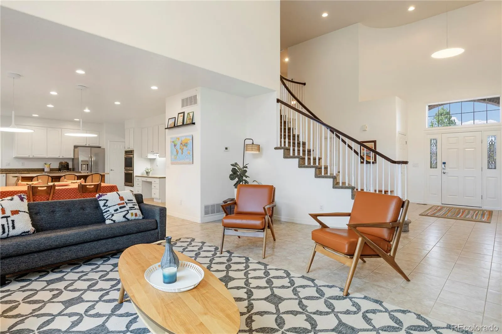 Inside, a soaring two-story great room is filled with natural light and anchored by a warm fireplace, creating an inviting space that feels both expansive and comfortable. The open-concept layout flows seamlessly into the kitchen and dining areas, perfectly suited for both entertaining and everyday living.