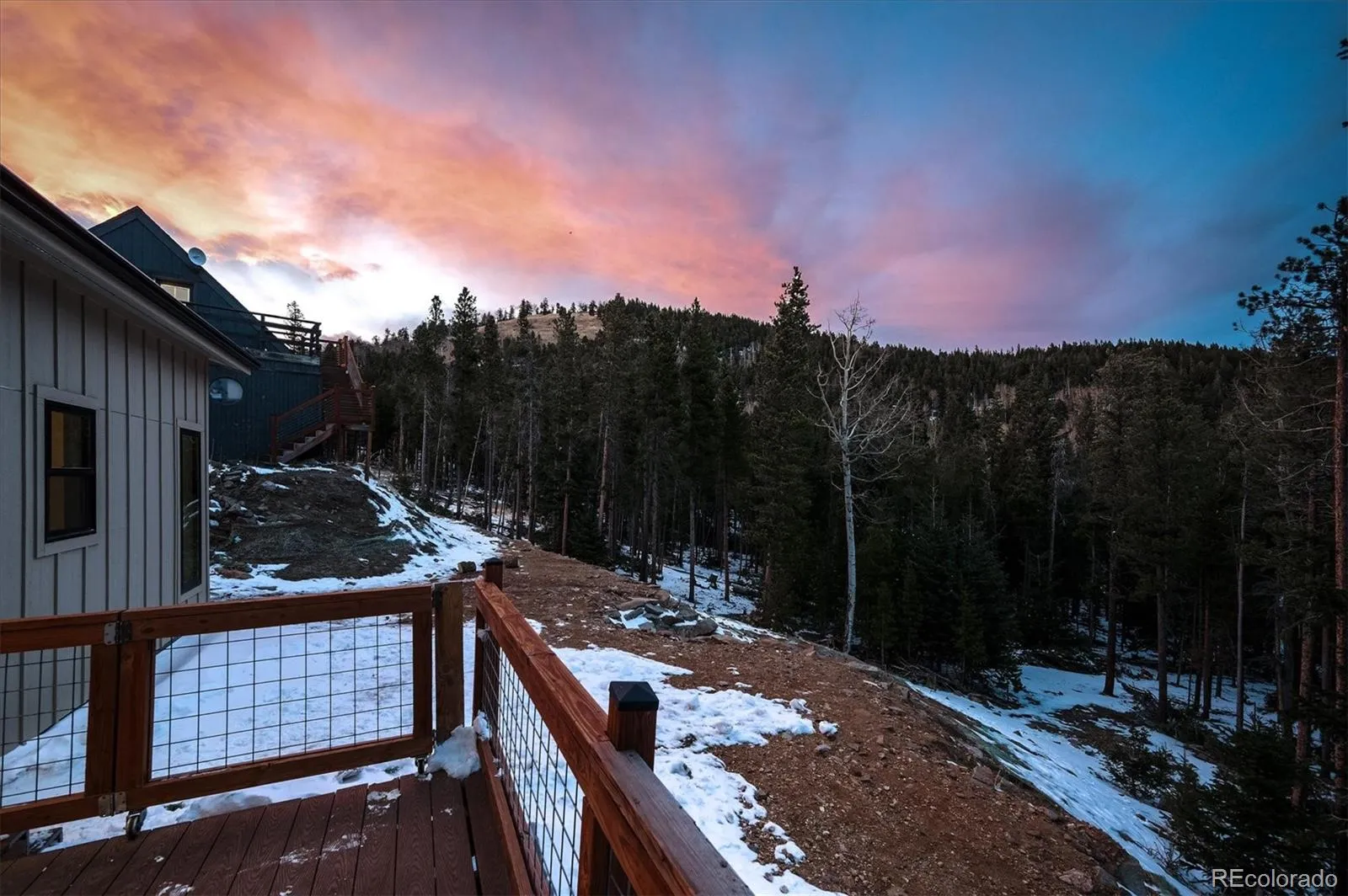 Perched at 9,400 ft in the mtns of Evergreen, this beautifully renovated home offers a rare blend of luxury design, peaceful privacy, & modern mtn living. Surrounded by towering pines & expansive CO skies, the property feels like a true mtn oasis: a place where mornings begin slowly w/coffee on the deck & evenings end watching breathtaking sunset colors dance across the landscape. Completed in May 2025, the home underwent a $350K+ interior reno/addition designed by an award-winning Denver-based designer. Beyond the refined finishes, renos incl system upgrades; new wiring/electrical panel & Andersen windows, knotty alder wood int doors, new siding/gutters/roof, providing beauty & long-term peace of mind. Inside, thoughtful space transforms areas often overlooked into purposeful features. Built-ins & creative storage solutions appear throughout the home, incl two integrated desk spaces; entry coat cabinet; vertical shoe storage, bookshelves, linen storage, beverage bar, hidden mop closet, & a charming dog nook tucked beneath the wood-paneled staircase. The kitchen blends warmth & craftsmanship w/cabinetry outfitted w/custom drawers & door inserts for exceptional organization. Unlaquered brass hardware adds timeless character & will naturally patina over time, giving the home a subtle sense of history and depth. Lighting was professionally designed to layer task, accent & ambient illumination throughout the home. The main bath showcases this approach w/an anti-fog illuminated mirror, shower downlights & a striking statement pendant, while architectural lighting highlights prime art locations. A whole-home Lutron Caseta lighting system allows app-based control from anywhere. Above the garage flex space w/unobstructed views of the Denver city lights offers a versatile retreat perfect for a studio/office or creative space. The 561 sq ft basement complete w/egress window, laundry & rough-in plumbing for a third bath provides an exciting opportunity for future expansion.