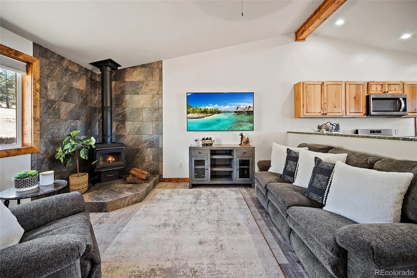 Built in 2021, this custom home still feels like new and showcases an open-concept layout with soaring 11-foot ceilings, abundant natural light, and luxury vinyl plank flooring throughout. The kitchen and living area flow seamlessly together, featuring stainless steel appliances, a cozy wood-burning stove, and large windows that capture stunning mountain views and unforgettable sunsets.