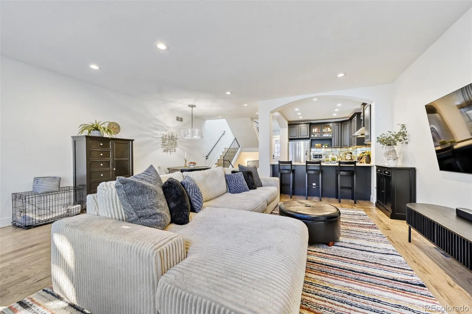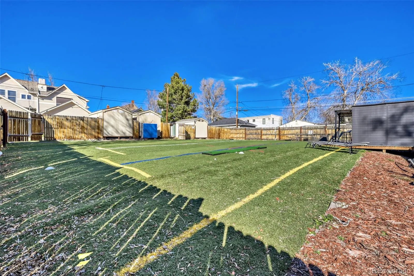 Beautifully designed townhome near Sloan’s Lake, offering the perfect blend of space, light, and location. Step inside and experience nearly 3,000 finished sq ft that lives like a single-family home. This thoughtfully built home features an open floor plan, soaring ceilings, and abundant natural light from numerous windows and skylights. The gourmet kitchen includes granite countertops, custom wood cabinetry, Frigidaire appliances, a generous breakfast bar, and dining area. The spacious living room with gas log fireplace opens to a private, pergola-covered patio—perfect for outdoor dining, relaxing, or letting your dog out with ease. Upstairs, the primary suite offers vaulted ceilings, French doors, and a five-piece bath with jetted tub, dual-head shower, and custom double vanity. All three upstairs bedrooms have vaulted ceilings and transom windows, and the upper level features skylights and new carpet throughout. The finished basement boasts rare 10′ ceilings, a large rec area, and wet bar—ideal for entertaining—plus a guest bedroom and full bath. A main level office with French doors works well as a home office or 5th bedroom. Enjoy a rare ~2100 sq ft fenced astroturf yard, shared with just two neighbors—perfect for large gatherings, cornhole, or birthday parties. Walk to Sloan’s Lake (~10–12 min) or Empower Field at Mile High. Parking is easy with a 2-car detached garage off the wide back alley, an additional dedicated space, and ample street parking. Blocks from Highland Square, minutes to downtown, and near Brown Elementary. One of three well-built units with no HOA, offering quiet living and great neighbors. A rare opportunity to own this much indoor and outdoor space in one of Denver’s most sought-after locations—homes like this don’t come along often. Schedule your showing today!