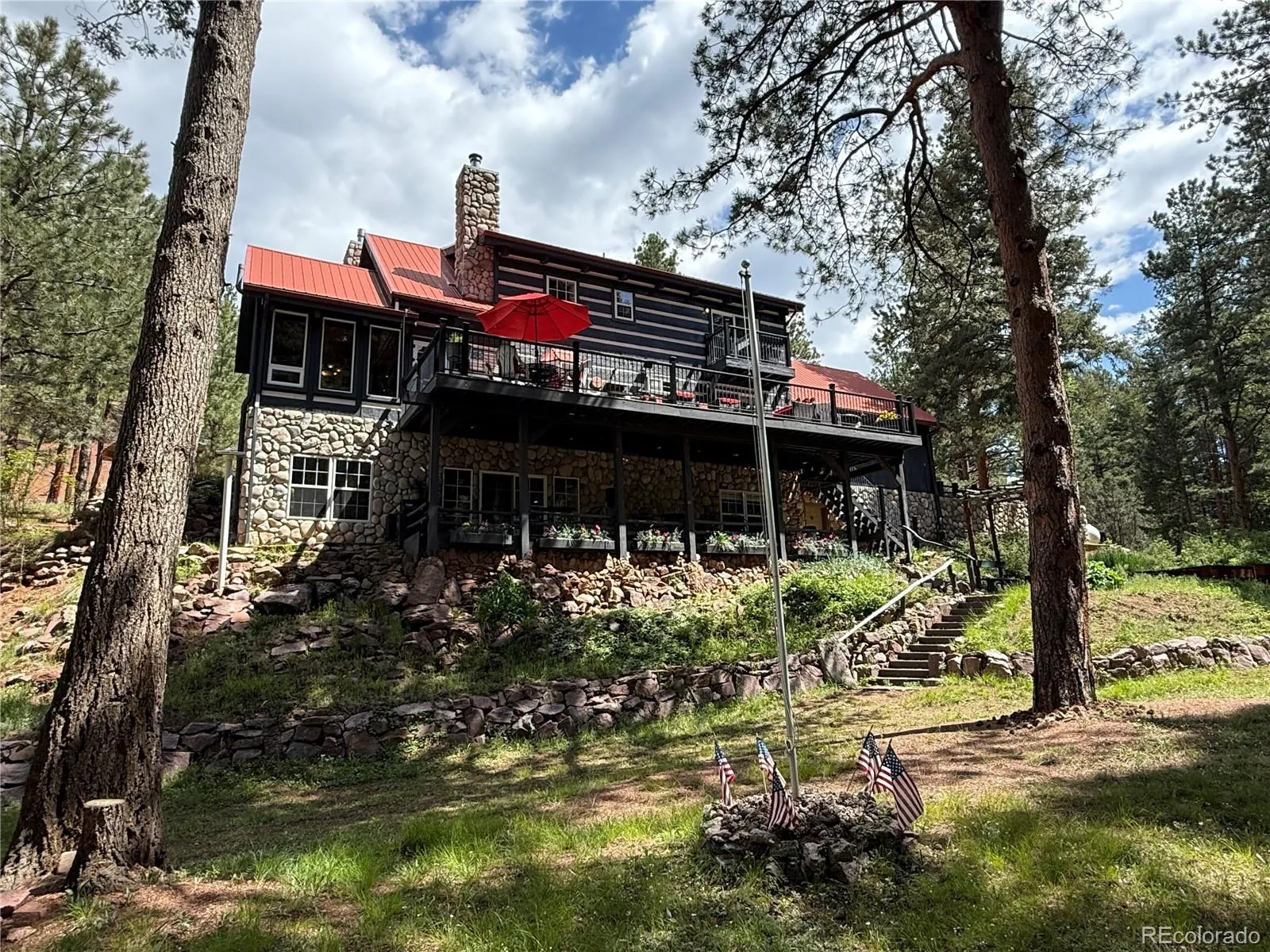A dream home in the Colorado mountains. Unique hand hewn square log home with many custom features and lots of character. Located on 1.13 acres in a private gated community that is only 45 miles from the Denver Metro area. The property has a small stream and pond and the home is over 3,200 sq ft of finished space plus almost 1,500 sq ft of decks, patios, porches. Currently only two bedrooms, but it is set up to sleep 12 guests in beds and 18+ including sofa beds and sofas. Possible to add a third or fourth bedroom if needed. The entry and living room have soaring 24′ ceilings and a gas fireplace. The gourmet kitchen has antique beadboard cabinets and granite and quartz countertops. Professional gas range and mixer and a restored and fully functioning Acorn wood cook stove. The dining room looks out over the pond. The main floor also includes a bedroom with a sink and shower, as well as a connecting powder room. There is also a 12×46 foot deck that overlooks a large flat area behind the house that is perfect for entertaining. The upstairs has the primary bedroom and bathroom and a loft with custom bookshelves. There is also a large attic for storage or could be finished at some point. The lower walk-out level has a spacious family room with built in entertainment area that can be converted to another fireplace if desired. There is also a library with custom 10 foot shelves and an antique bathroom with a 100+ year old clawfoot tub. A bunk area that has four full size beds, and a dedicated office. A 500+ sq ft wine cellar and cold storage pantry (not included in the official sq ft). Radiant in floor heating. Two garden sheds. A bridge and a dock. Amazing entertaining space. 22 miles from Woodland Park. 40 miles from Colorado Springs. Community has private stocked lakes and is only one mile from the Platte River with world class fishing. Additional adjoining lot available for even more privacy. Available fully furnished at no extra cost if desired.