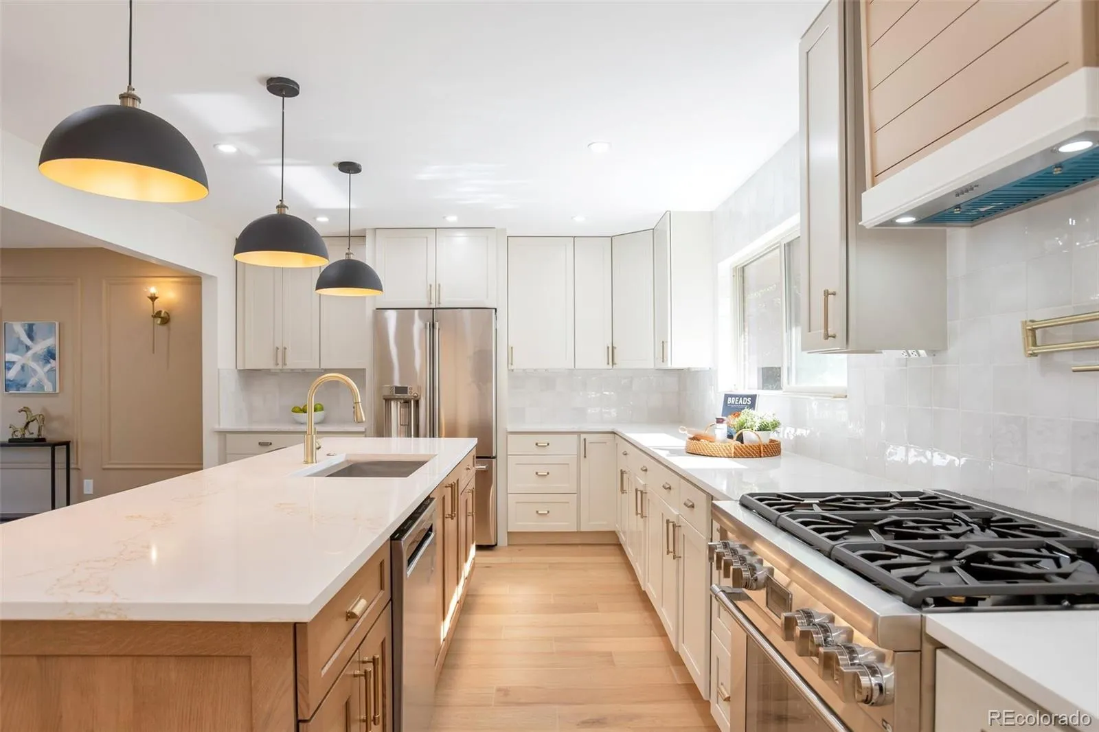 Tucked away in the highly sought-after Bow Mar South neighborhood, this stunning 3,546 square foot, 5-bedroom, 3.5-bathroom home has been fully renovated to offer the perfect blend of luxury and modern convenience. The home features hardwood floors that flow through the open living spaces. The kitchen is a masterpiece, boasting quartz countertops and professional-grade appliances, including a Thermador gas range and speed cook oven that doubles as both a microwave and second oven. The main level includes integrated in-ceiling speakers, allowing for easy entertainment.