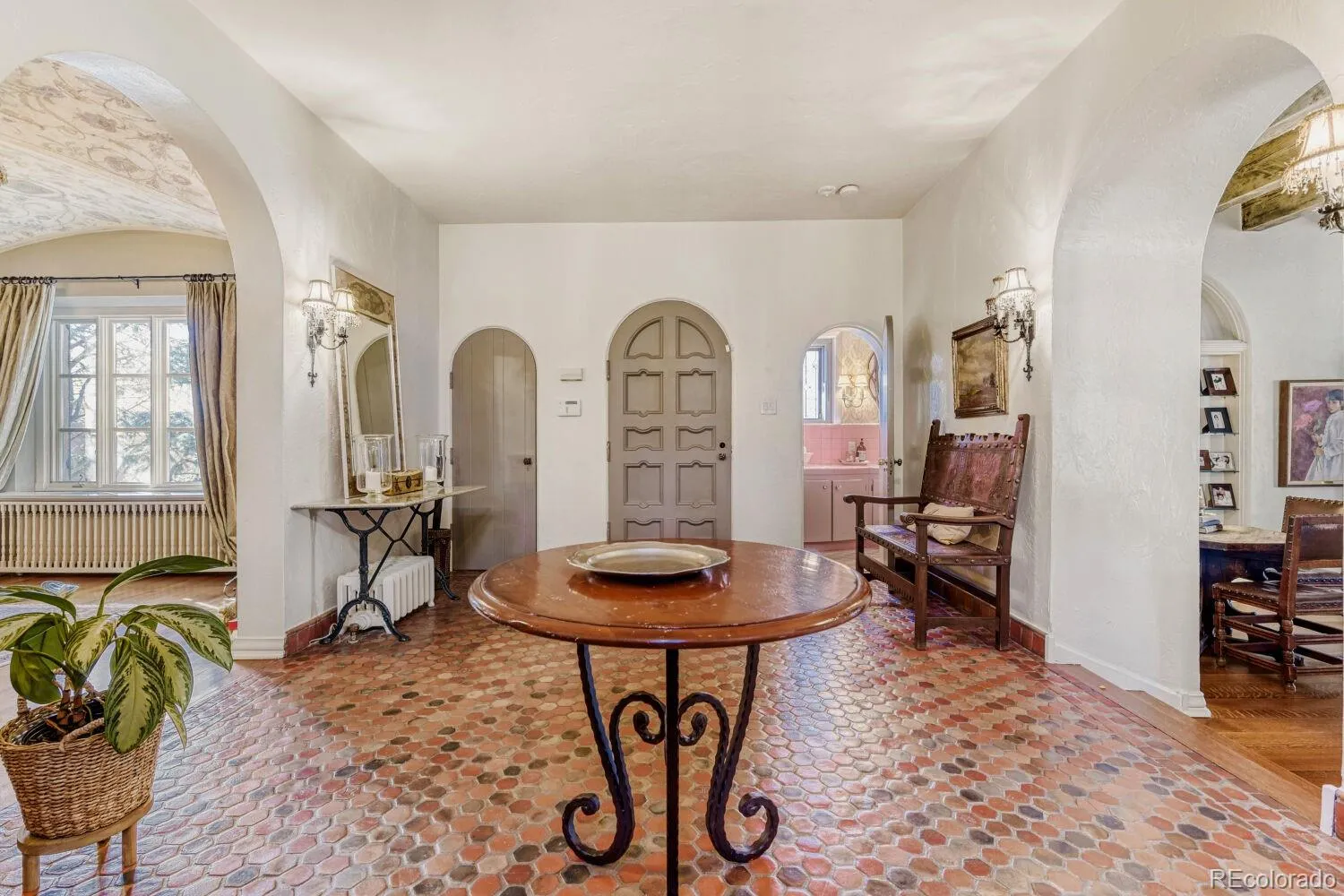 Step into the golden age of 1920s Hollywood glamour with this beautiful Mediterranean revival mansion, situated in the prestigious and highly sought-after Denver Country Club neighborhood—one of Denver’s most exclusive historic enclaves. From the moment you approach, the property captivates with its commanding street presence (a perfect 10) and magnificent wrought-iron fence framing the grounds.Enter through an intricately carved stone vestibule into a grand foyer boasting original tile floors, elegant arched doorways, and a breathtaking curved staircase that sets the tone for the home’s rare, intact historic charm. Flanking the foyer are two show-stopping formal spaces: a dramatic step-down living room featuring rich wood-beam ceilings and a striking stone fireplace, and an expansive dining room crowned by a groin-vaulted, stenciled ceiling—perfect for sophisticated entertaining.The updated kitchen offers modern convenience with crisp white cabinetry, sleek black counters, and stainless steel appliances. Adjacent, a two-car attached garage connects to a generous driveway, providing seamless potential for future expansion without sacrificing the beautifully landscaped yard.This rare find sits on an impressive over-one-third-acre lot (14,500 sq’), offering exceptional privacy and space amid mature landscaping—a true luxury in this coveted area. Upstairs, 4 generously sized, air-conditioned bedrooms are served by 4 baths, complemented by a convenient main-floor powder room for guests.In an era where true historic elegance is increasingly rare, this home stands as a cherished gem—retaining its original architectural integrity while blending seamlessly with contemporary living. Walk to the vibrant shops, boutiques, and acclaimed restaurants of Cherry Creek, and within the Bromwell Elementary and East High boundaries. If you’ve always dreamed of owning a piece of Denver’s storied architectural heritage, this is the distinguished residence you’ve been searching for.