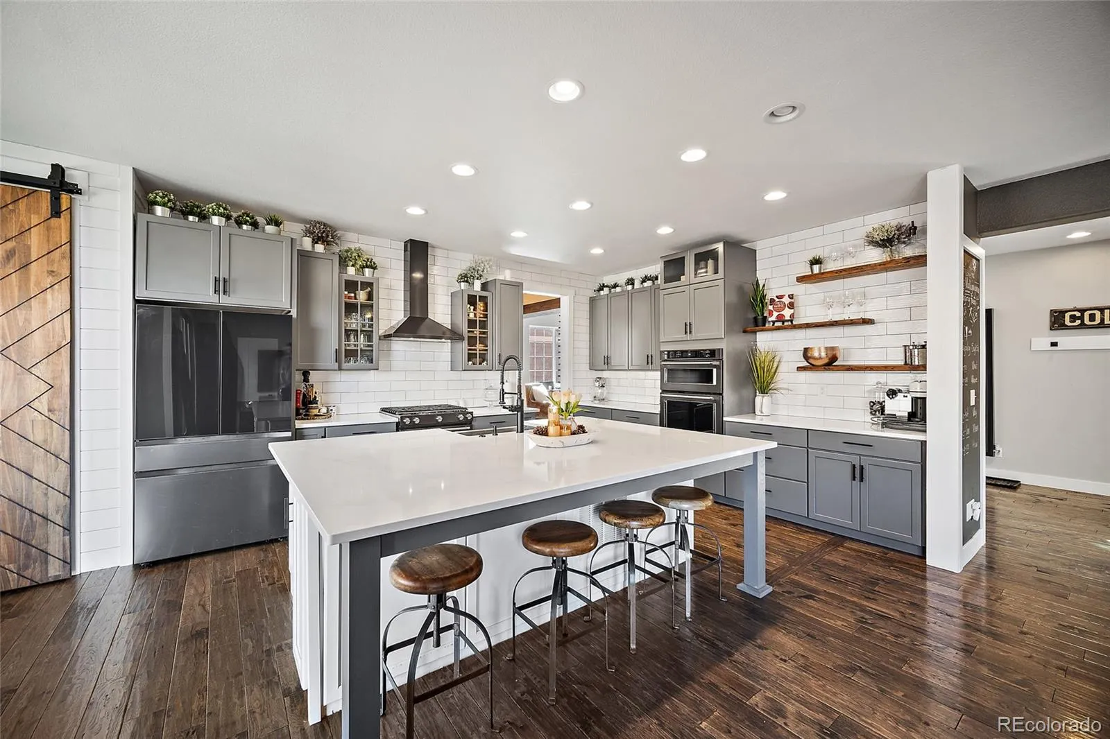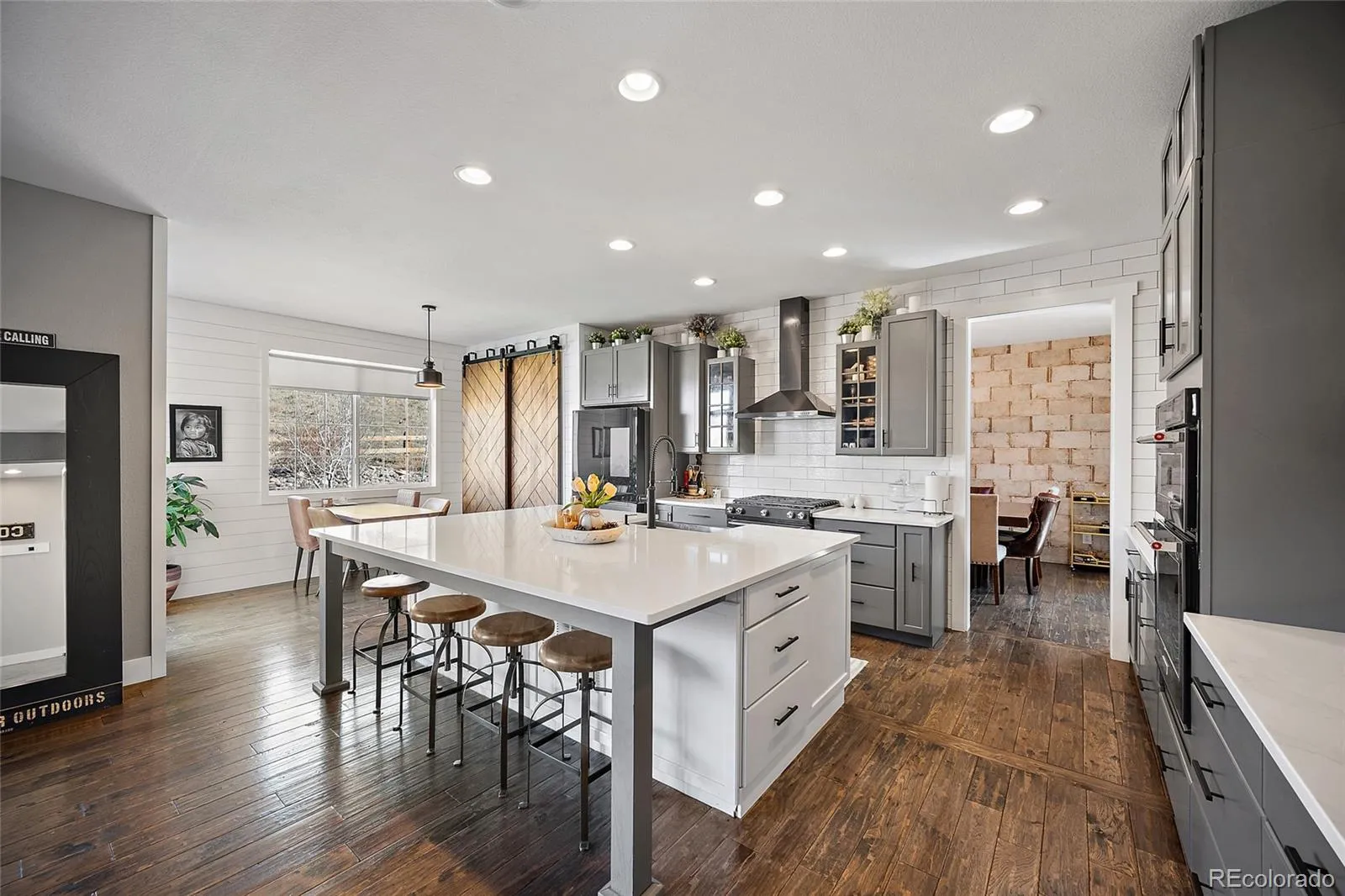 Fully remodeled and thoughtfully designed, this stunning two-story home in The Meadows offers refined finishes and natural tones throughout, all set on a beautiful lot backing to peaceful natural open space. Mature trees and a professionally xeriscaped front yard create striking curb appeal, while the backyard features low-maintenance turf for year-round green space and easy outdoor living. Inside, the home has been completely updated with modern style and thoughtful functionality. A welcoming living room at the front of the home creates a warm space to gather, while the family room just off the kitchen serves as the comfortable heart of the home and flows seamlessly with the main entertaining spaces. The truly gourmet kitchen is the centerpiece, featuring modern cabinetry, cooktop, double ovens, and generous workspace ideal for everyday cooking or hosting guests. The adjacent dining room is enhanced with custom built-ins and a wine rack that add function and character. The main level also includes a private study —perfect for a home office—along with a convenient main-floor laundry room. Upstairs, four spacious bedrooms provide flexibility for family or guests. The primary suite is a relaxing retreat with a luxurious five-piece bathroom. Two bedrooms share a Jack-and-Jill bath, while the fourth bedroom has access to its own nearby hallway bathroom. The finished basement expands the living space with a bright home theater, exercise room, bathroom, and a Murphy bed that easily converts the area into a guest suite. A three-car garage offers plenty of room for vehicles and storage. Located in the highly desirable Meadows community, residents enjoy miles of trails, parks and neighborhood pool. The home is also ideally positioned near top-rated schools, I-25, the Promenade, and the charm of historic downtown Castle Rock. With its extensive remodel and open space setting, this home offers a rare blend of style, comfort & location—it truly stands apart in the neighborhood.