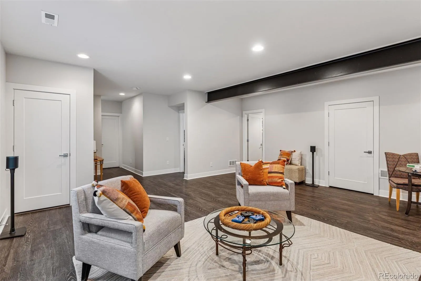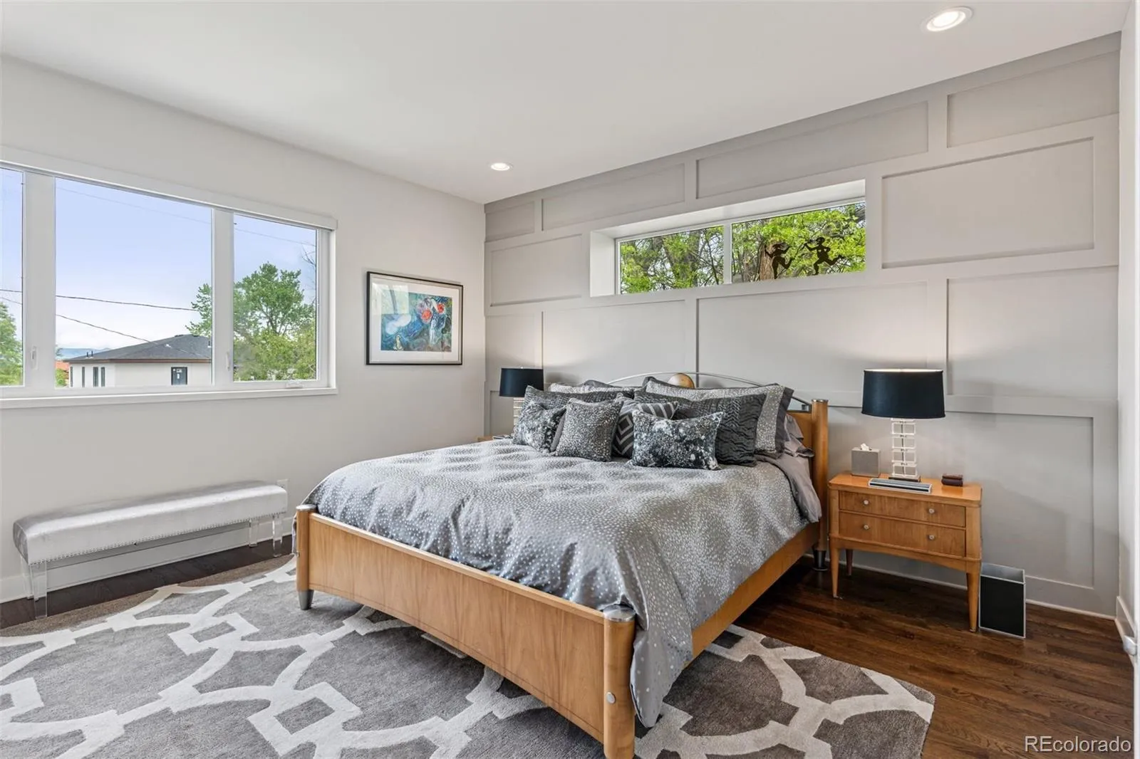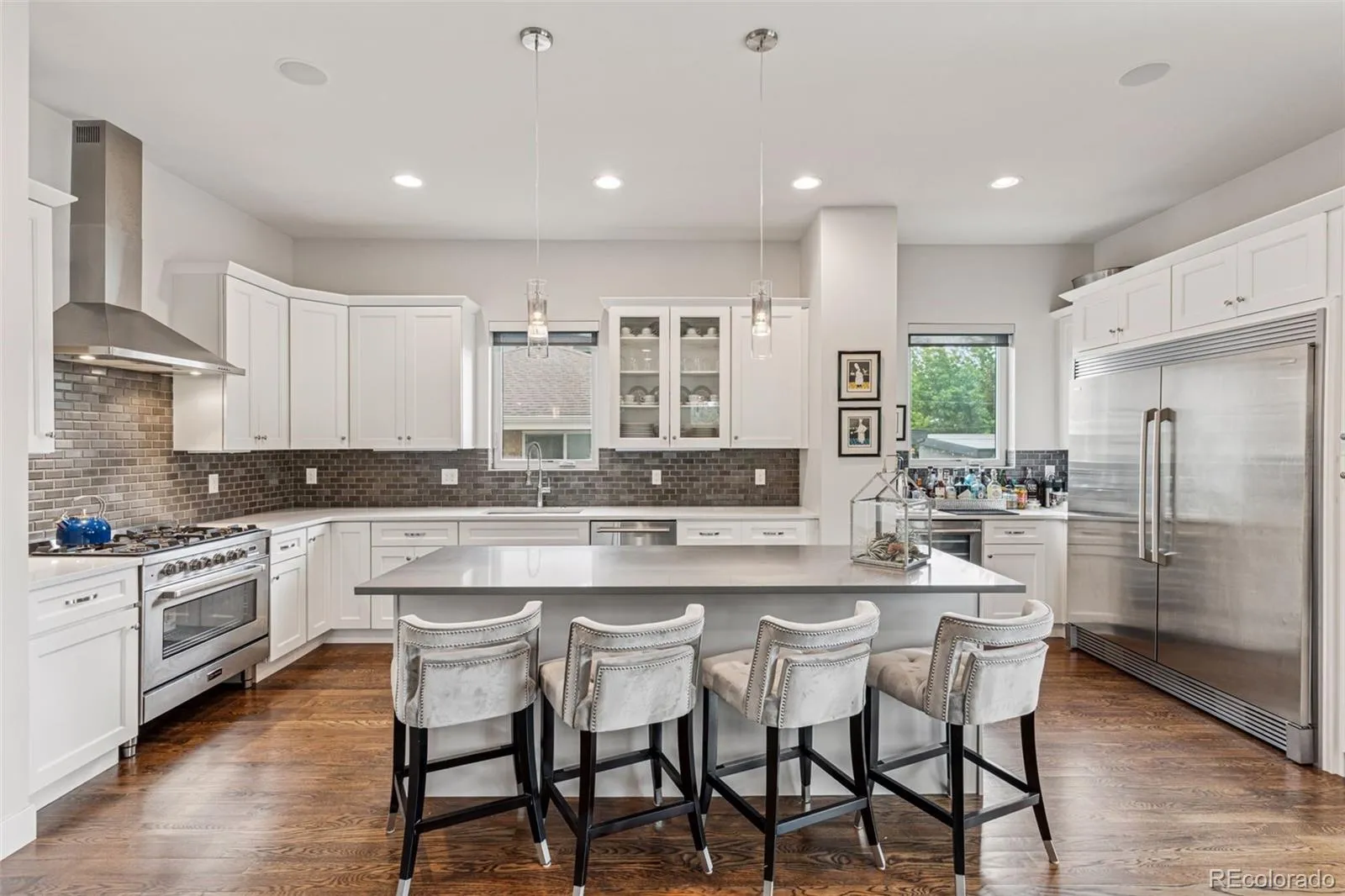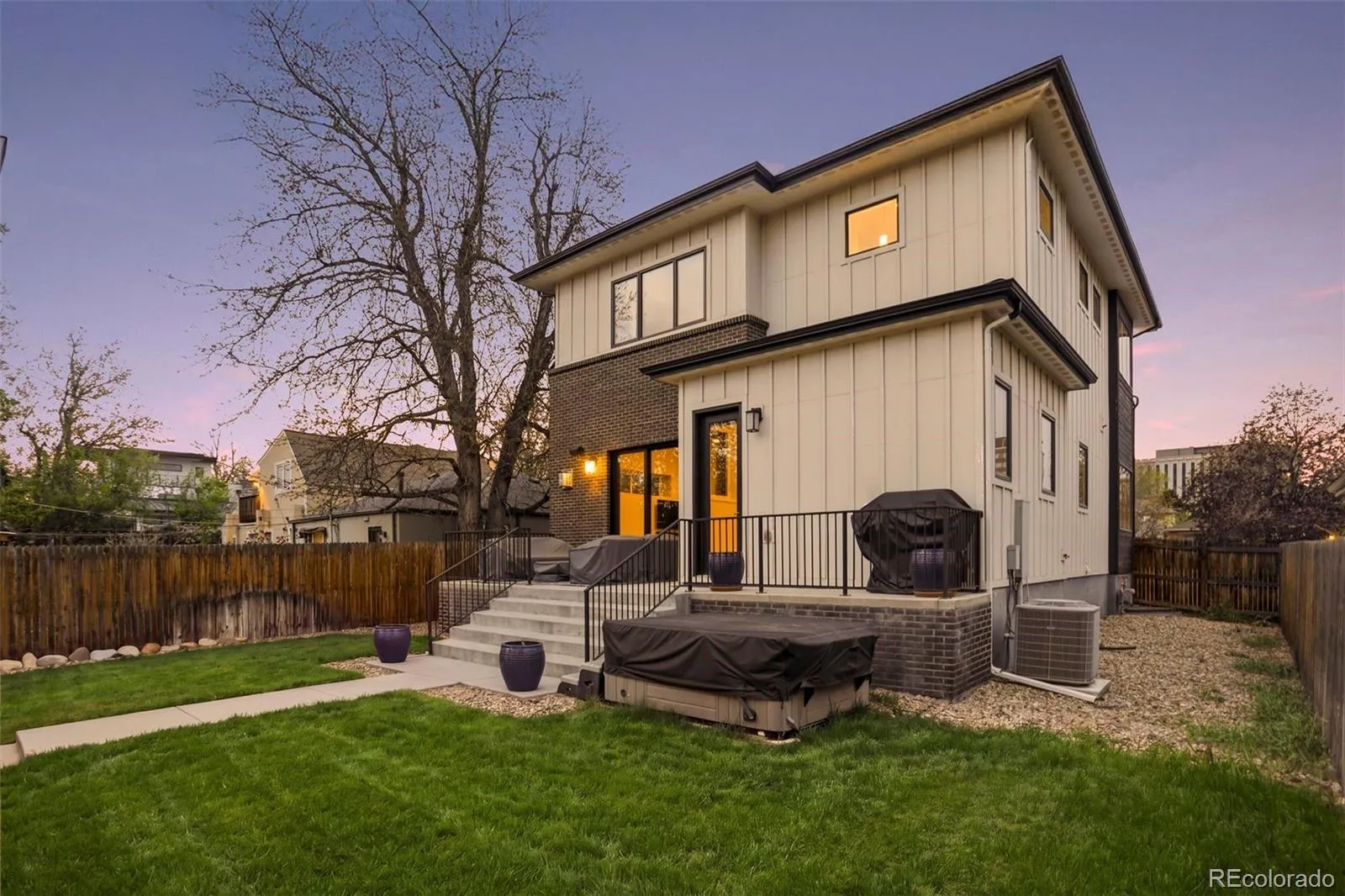 This well priced modern Denver Square in the Cory-Merrill neighborhood offers 3400 square feet of well-designed living space. Built in 2017, the home features thoughtful upgrades throughout. The main floor includes an office, dining area, and great room with a built-in gas fireplace. The kitchen is designed for both function and style, with modern white cabinetry, an expanded island, gas stove, side-by-side refrigerator and freezer, beverage/bar refrigerator, built-in microwave, and plenty of storage. Large windows throughout provide abundant natural light, and the layout flows easily from the house into the private backyard. Upstairs, you’ll find three bedrooms, including a spacious primary suite with a walk-in closet and a five-piece bath complete with a free-standing tub and oversized shower. The primary bedroom also features a custom paneled wall that adds a clean, modern accent. Two additional bedrooms, a full bath with double sinks, and upstairs laundry complete the second floor. The finished basement has high ceilings, a large bedroom, stylish bathroom, and a large family room that adds great flexibility for entertaining or relaxing. Additional highlights set this home apart with its cohesive blend of modern style and thoughtful craftsmanship. Wood floors run throughout the home, complementing the sleek quartz countertops and clean-lined modern fixtures. Custom tilework adds subtle personality to each bathroom and living space, while exposed steel architectural beams introduce a modern feel. Single-panel doors and glass shower enclosures contribute to the clean, streamlined aesthetic. The home is also equipped with a tankless water heater, built in speakers, and is finished in a neutral, contemporary palette that lets the quality finishes and design details take center stage. Located just a short walk from Cory Elementary and Merrill Middle, with easy access to Washington Park, and Bonnie Brae.