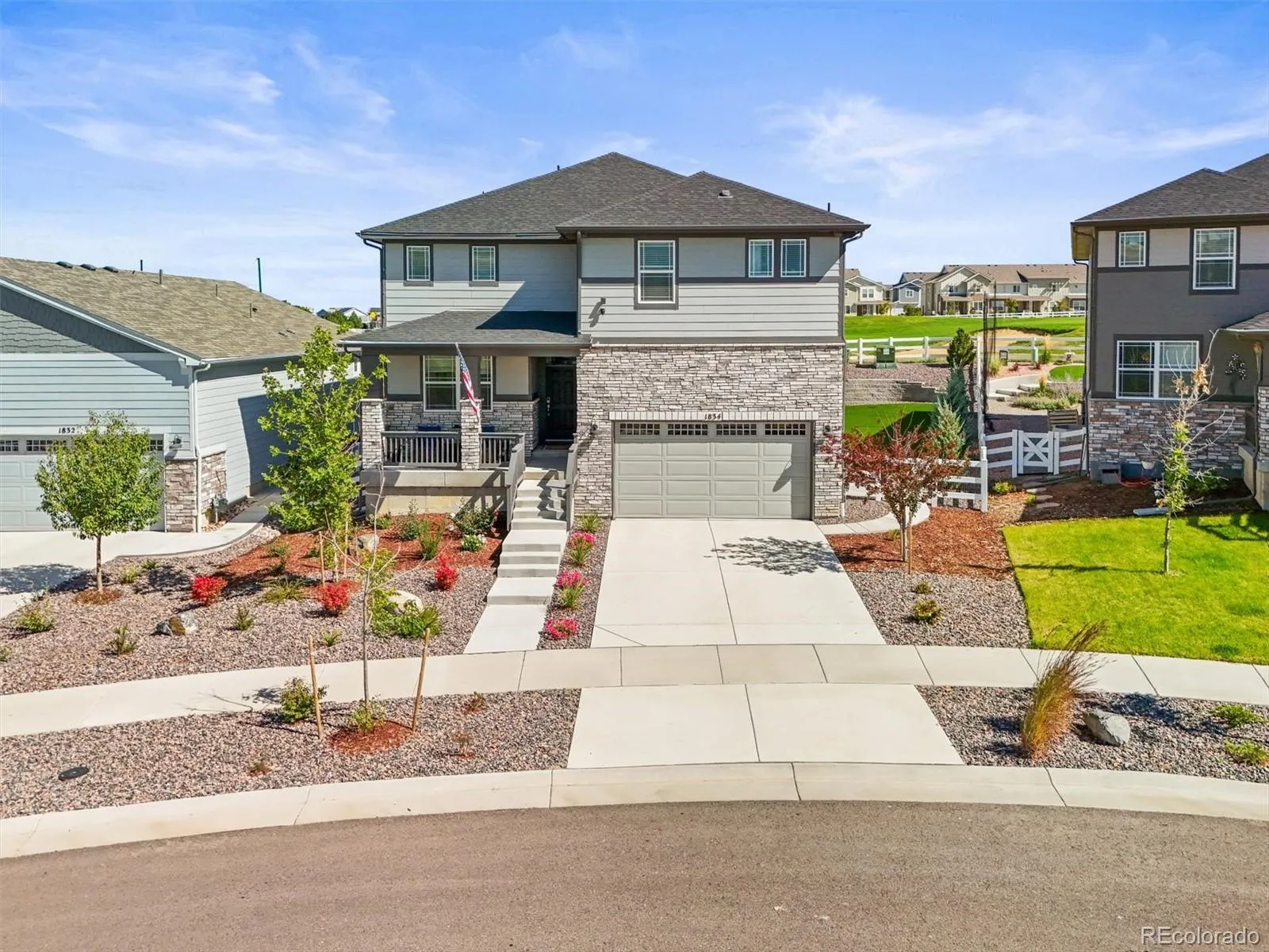 The backyard opens directly to the golf course and is professionally landscaped with a large concrete patio, turf, decorative rock, and a mix of trees—offering a low-maintenance outdoor setting with open views. A golf ball stop net and post system is already installed. The 3-car tandem garage provides flexible space for vehicles, storage, or hobbies.