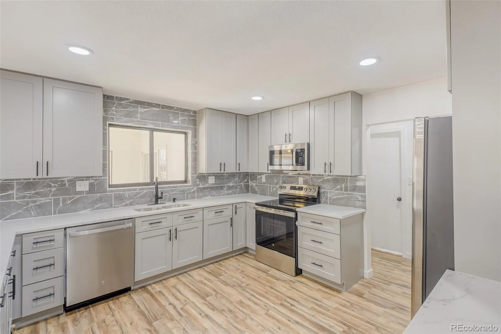 Enjoy the comfort and convenience of true one-level living. This completely remodeled ranch style home showcases a bright, open concept design. The layout creates seamless transitions between living spaces, ideal for both relaxing and entertaining. Located in a beautiful, quiet neighborhood next to Aurora Hills Golf Course. Wide plank laminate flooring runs throughout the entire home, complemented by upgraded lighting, designer paint, and custom built-in cabinets in the living room. The modern kitchen showcases brand new custom cabinets, 42” upper cabinets, quartz countertops, and stainless steel appliances, perfect for everyday living. This thoughtfully updated home features 4 bedrooms and 3 bathrooms. Including a spacious primary bedroom with en suite that has been completely remodeled. The three additional bedrooms share a beautifully renovated bathroom, offering both comfort and convenience. This updated bathroom features stylish finishes including all new vanity with double sinks, making it easy for multiple people to get ready at the same time. The sunroom leads to a private backyard with perennials beginning to pop-up and along with raised flower beds. Homes in this great neighborhood don’t come for sale that often, so don’t miss this opportunity!