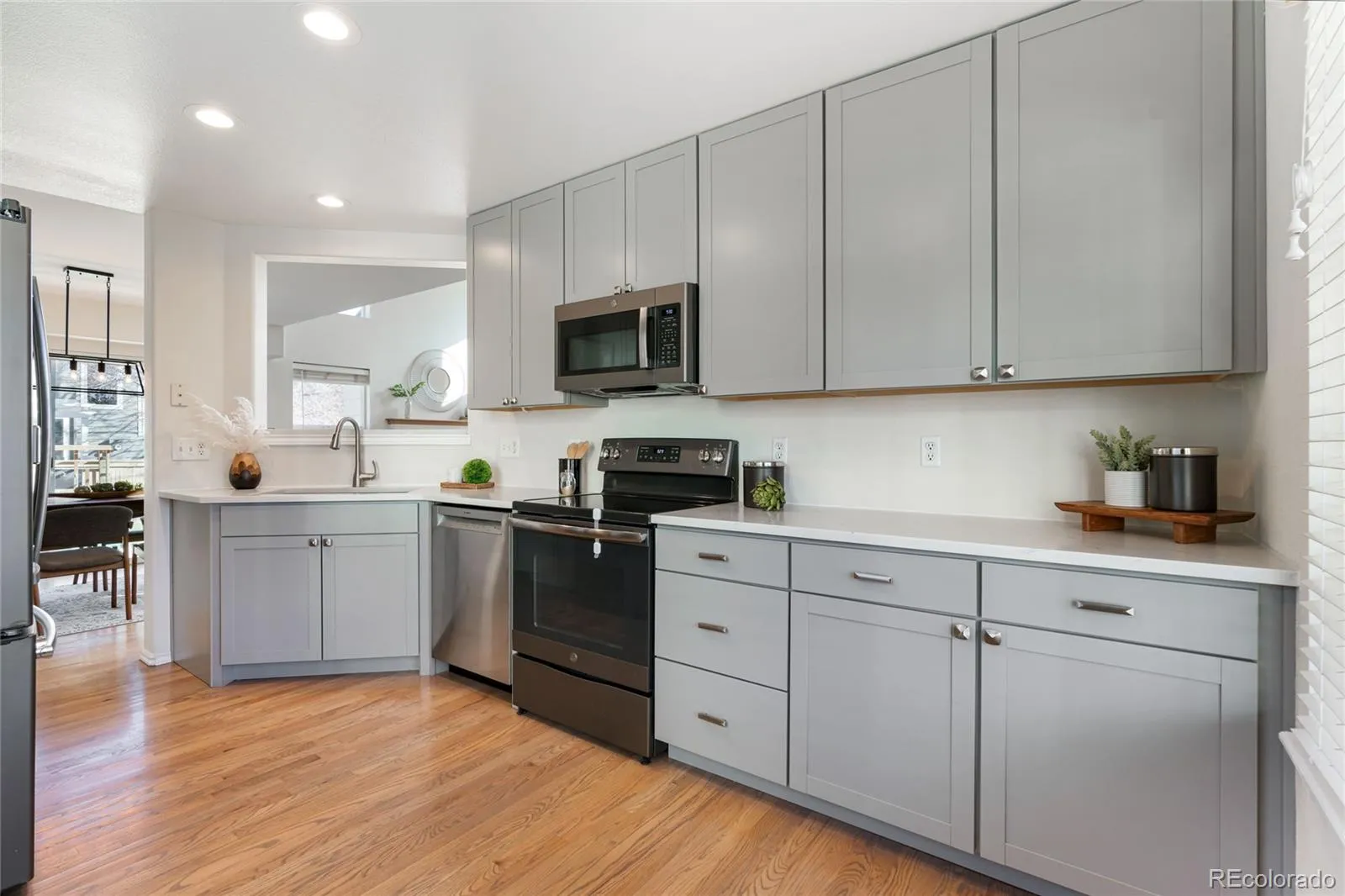 Step inside to a bright, open floor plan featuring vaulted ceilings, warm wood flooring, and inviting gathering spaces throughout. The updated kitchen showcases quartz countertops, modern finishes, and seamless flow into the dining and living areas.