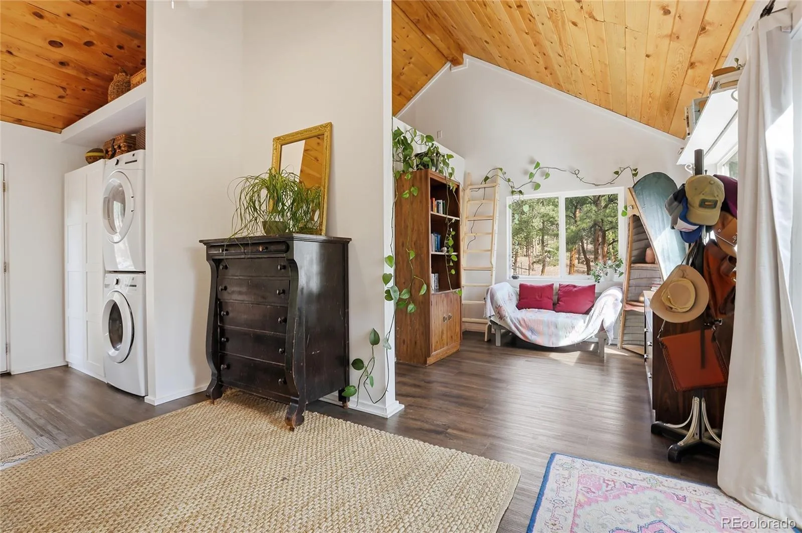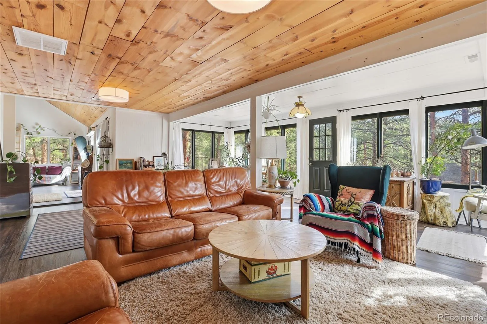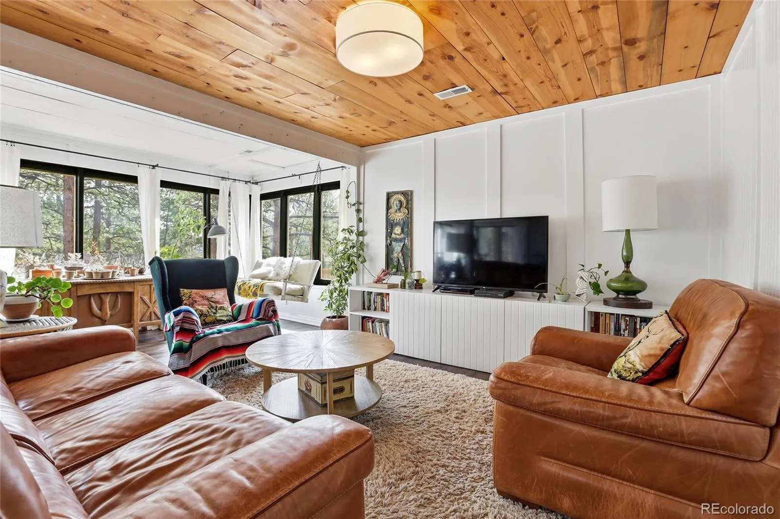 The living room is filled with natural light from a wall of windows overlooking the yard, creating a bright and inviting space to gather. A charming original swing adds a unique touch of character and reflects the home’s historic personality.