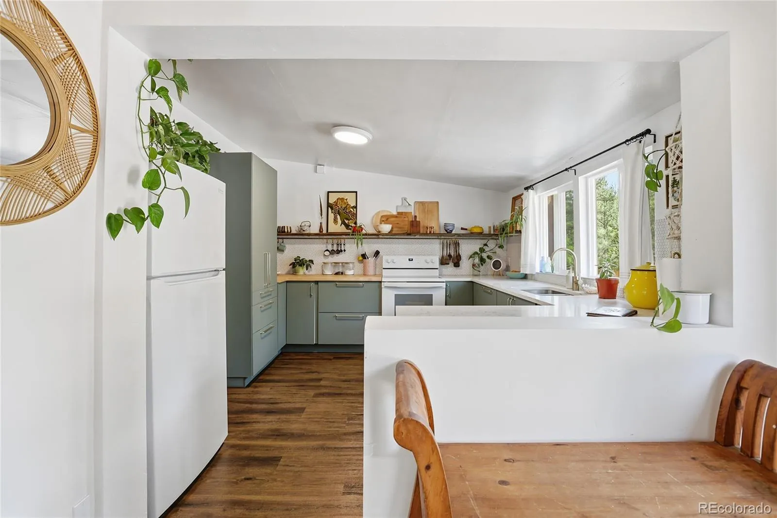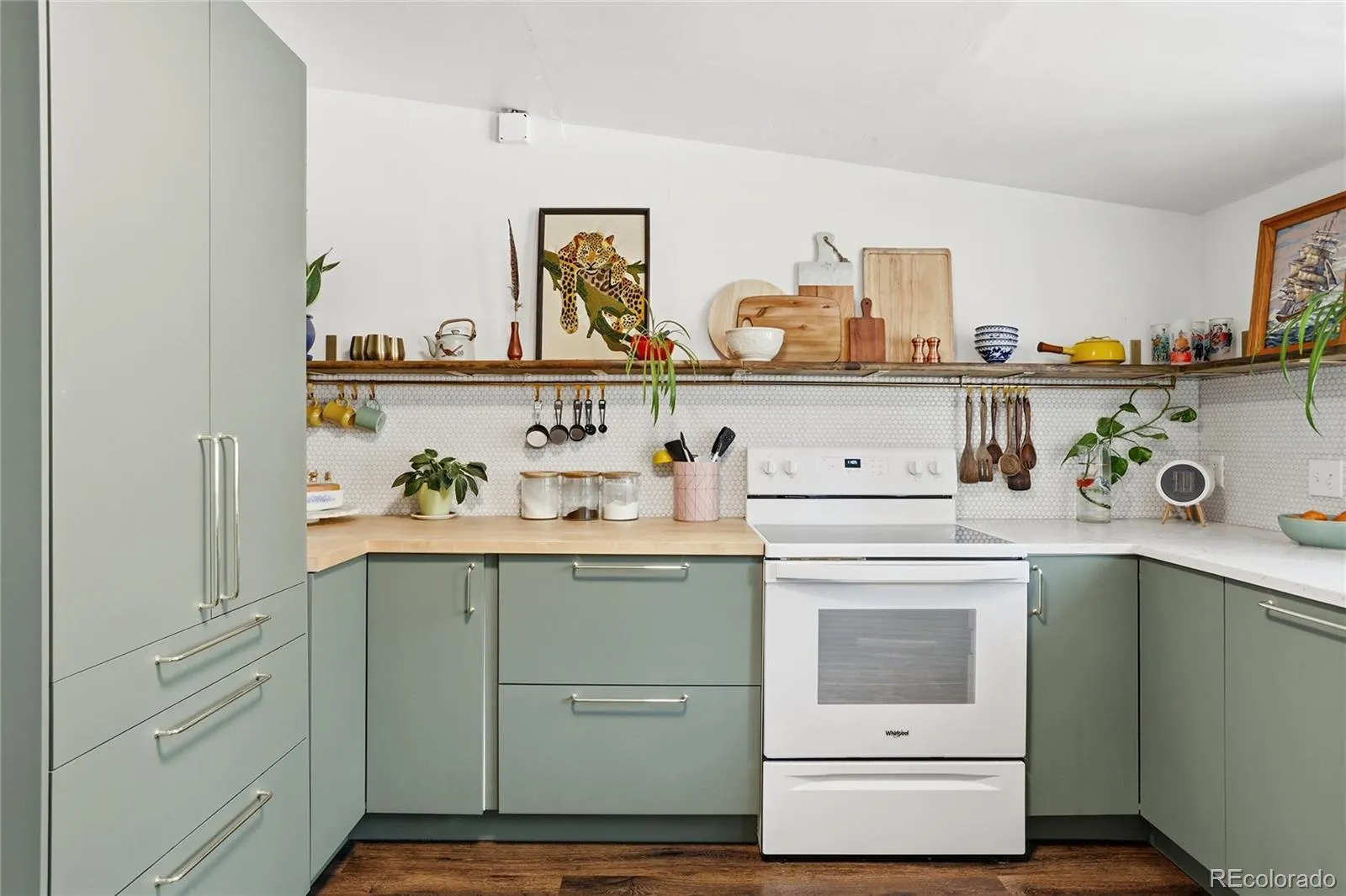The fully remodeled kitchen features new cabinetry, quartz countertops paired with butcher block accents, and new backsplash. New engineered wood flooring runs throughout the home, complemented by fresh interior and exterior paint, and updated lighting that give the space a clean, cohesive feel.
