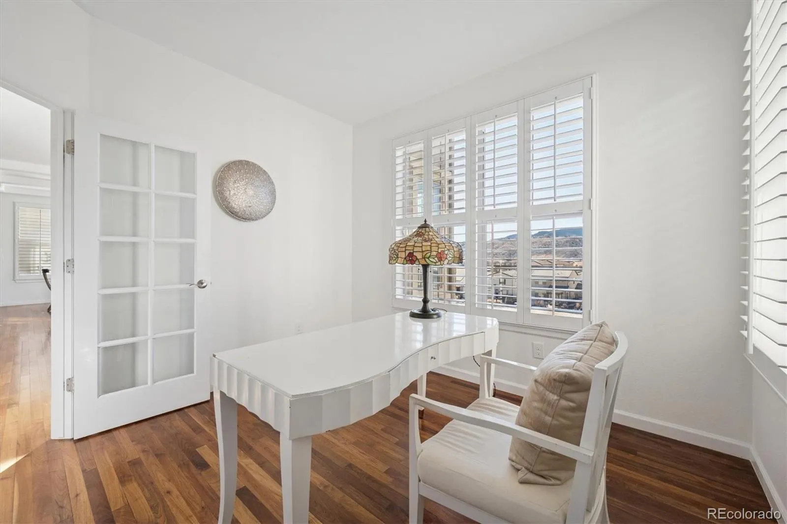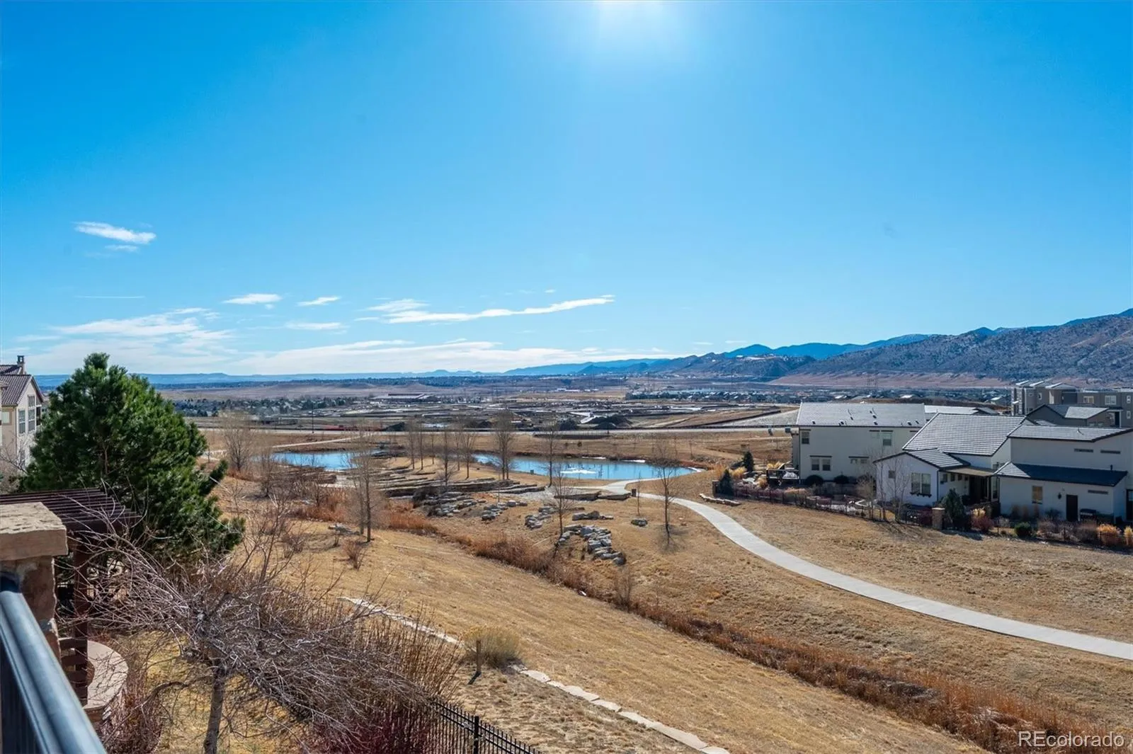 This Solterra residence sits on an elevated premium lot backing to open space with beautiful views of Red Rocks. A dramatic two-story foyer opens into a spacious great room anchored by a striking 17-foot floor-to-ceiling stone fireplace surrounded by windows. The patio door extends the living space onto an elevated, oversized deck overlooking the neighborhood and mountain views—an ideal setting for indoor/outdoor entertaining. The chef’s kitchen features stainless steel appliances, granite countertops, upgraded cabinetry, a coffee bar, and a walk-in pantry. Upgraded walnut hardwood flooring flows throughout the main-level living room, kitchen, dining room, and office, creating a warm and cohesive aesthetic. Upstairs, the primary suite captures mountain views and includes a luxurious marble five-piece bath and dual closets. Two additional bedrooms each offer walk-in closets and share a Jack-and-Jill bath. The walkout basement adds exceptional versatility with a fourth bedroom and en-suite bath, a powder room, a spacious bonus area perfect for movie or game nights, a large storage room, and more exceptional views of the mountains and neighborhood. Recent updates include: 2025: exterior paint, 2024: new carpet and interior paint throughout.