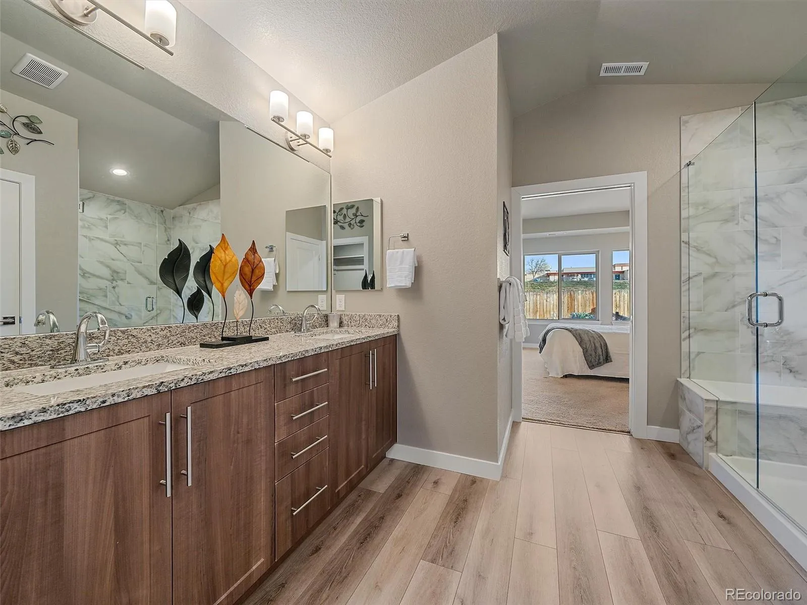 Welcome home to effortless living in one of Arvada’s newest and most desirable 55+ communities. This beautifully designed ranch-style residence offers true main-level living with thoughtful finishes and an open, inviting layout perfect for both everyday comfort and entertaining. At the heart of the home is the spacious great room where the kitchen, dining area, and living room flow seamlessly together. The kitchen features a large center island with ample seating, high-quality 42-inch cabinetry, granite countertops, and stainless steel appliances – creating an ideal space for gathering with friends and family. The living room is warm and inviting with a gas log fireplace and striking surround, while expansive windows and a patio door fill the home with natural light. The primary suite is a true retreat featuring an elegant coffered ceiling, a wall of windows, and a spacious en-suite bath with executive-height vanity, dual sinks, a large walk-in shower, generous storage, and a huge walk-in closet. Privately situated on the opposite side of the home are a comfortable second bedroom, the hall bath, and office – perfect for guests, hobbies, or a quiet workspace. Step outside to enjoy the oversized, partially covered curved patio that complements the landscape and is perfect for entertaining or day-to-day living while enjoying the fenced backyard, raised garden beds, and professionally maintained lawn.