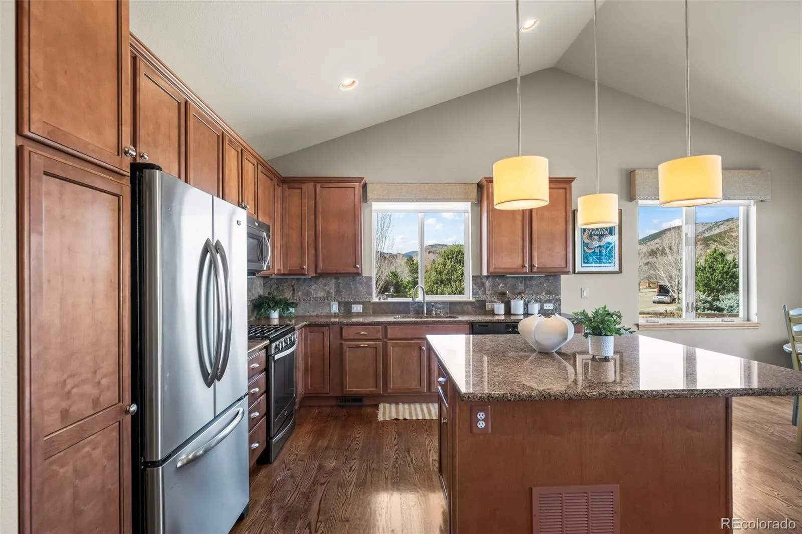 Enjoy effortless main-level living in this thoughtfully designed ranch-style home, ideally situated on a corner lot in the sought-after Lyons Valley Park neighborhood. A welcoming covered front porch sets the tone, leading into a bright, open-concept floor plan highlighted by vaulted ceilings and abundant natural light. The well-appointed kitchen features warm maple cabinetry, slab granite countertops, stainless steel appliances, a gas range, and an oversized island-perfect for gathering and entertaining. It flows seamlessly into the spacious living and dining areas, complete with a cozy gas fireplace and custom built-ins. The main level offers two bedrooms, including a generous primary suite with vaulted ceilings, a luxurious five-piece bath, and a large walk-in closet. A versatile office or flex space with French doors provides the ideal setting for working from home or accommodating guests, while a convenient main-level laundry room adds to the home’s functionality. Step outside to a large backyard and patio perfect for outdoor enjoyment, or furry friends. The full, unfinished basement presents endless possibilities for expansion, recreation, or additional storage. Perfectly located, Lyons Valley Park offers easy access to neighborhood parks, ponds, a dog park, scenic trails, the St. Vrain River, and local schools. Just minutes away, the charming Town of Lyons invites you to explore its unique shops, restaurants, and vibrant summer music festivals. Love Where You Live!
