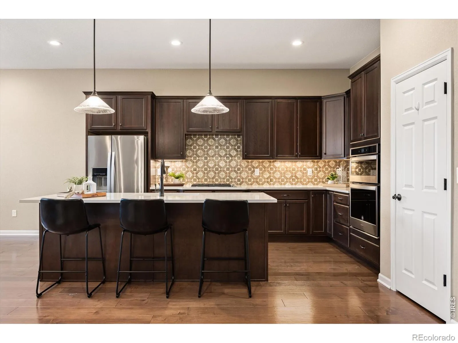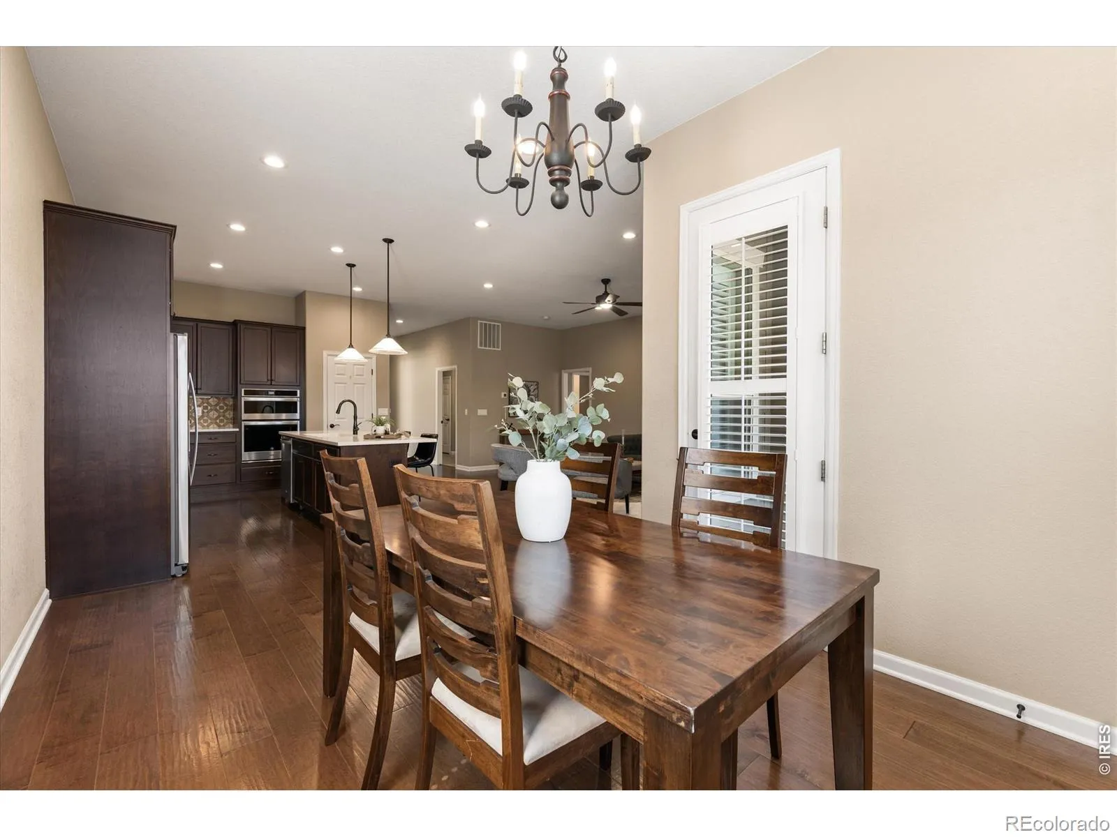 Beautiful, well-maintained home in Kechter Farm offering true main-level living with a thoughtful, functional layout. From the moment you enter, the home feels elevated yet comfortable, with 10-foot ceilings, plantation shutters throughout, and an open-concept main living area centered around a cozy fireplace. The kitchen is designed for both everyday use and entertaining, featuring quartz countertops, a gas cooktop, and ample storage. Just off the main living space, you’ll find a spacious mudroom and laundry room with a sink for added convenience. The primary suite offers a quiet retreat with a large walk-in closet and bathroom with double vanities and a generous shower. Outside you’ll find a covered patio that feels private and peaceful, complete with iron railing and a low-maintenance, well-landscaped backyard with mature shrubs for added privacy. Located in the highly desirable Kechter Farm neighborhood, with access to a pool, clubhouse, and fitness space, and just minutes from parks, schools, South Fort Collins amenities, and I-25.
