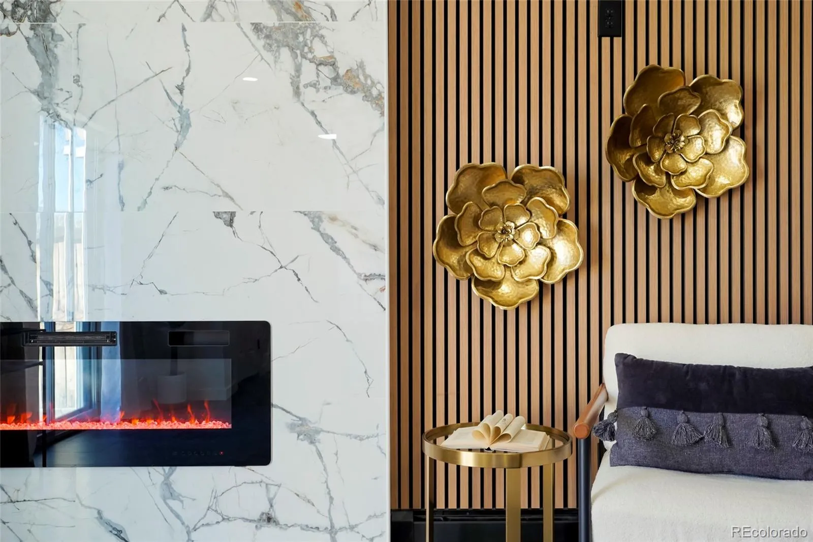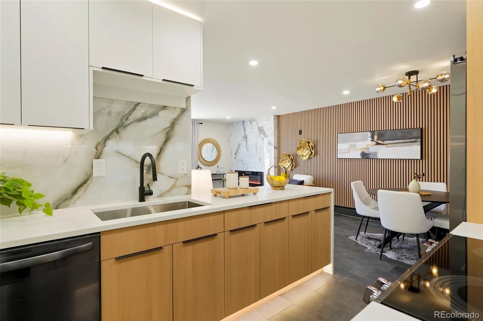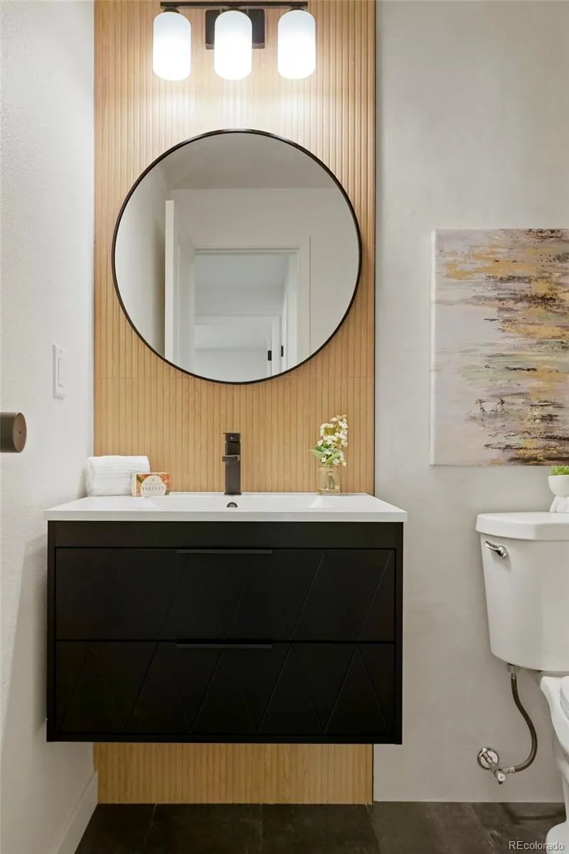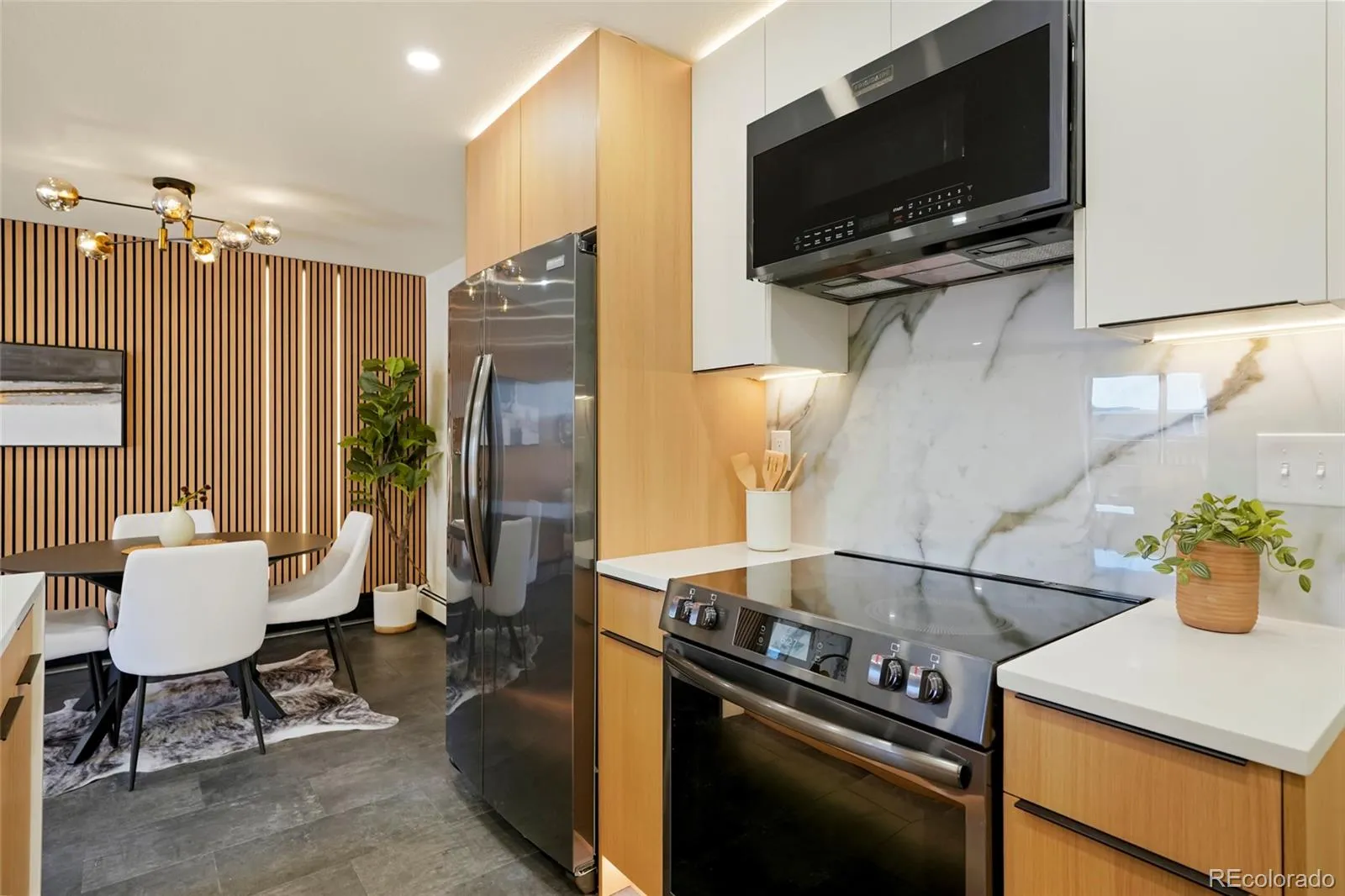 Step into modern living! Don’t miss out on this stunning updated townhome with convenient access to a range of amenities. Custom features abound throughout beginning with a stunning accent wall that runs the length of the condo incorporating a porcelain marble fireplace with electric insert and slat wall with accent lighting. Outlets have been placed to accommodate 2 different tv mounting locations. The kitchen features modern euro style cabinets, a waterfall countertop and amazing accent lighting on the top of the cabinets, the countertop work surface and even along the toe kick. New black stainless appliances accent the space with the seamless 1 piece porcelain backsplashes pulling it all together and making clean up a breeze. The washer and dryer areas have been neatly tucked behind 2 bifold doors. The staircase features mid-mod styled wood slats with a soaring wallpaper accent wall. Upon entering, cozy nook is the perfect place to remove your shoes, hang your jacket and keep other items in quick reach when heading out. Dark slate LVP flooring anchors the space and is completely waterproof and mops and cleans easily. Upstairs you’ll find your spa inspired bathroom complete with floating vanity, wood accent tile and sleek microcement shower surround. The unit includes a private attached garage space and an outdoor patio area thats shaded in the afternooon and is great for relaxing or opening the doors and letting the fresh air in. Mere steps from your unit is the expansive Highline Canal, perfect for daily exercise or access on a bike to the entirety of the Denver path network. You’re also a 10 minute drive to Anschutz. New garage door to be installed. Agent owner.