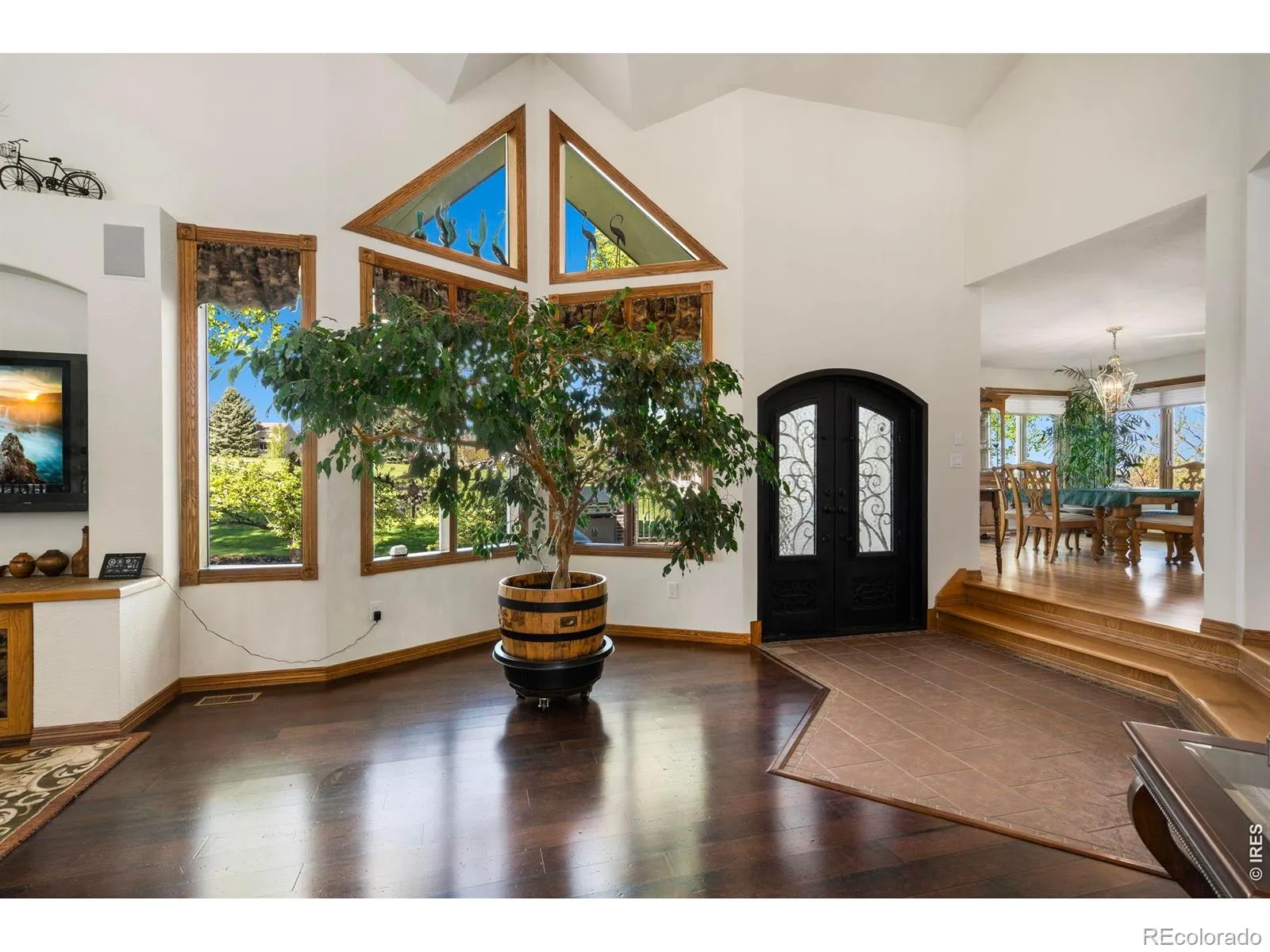 Backs to the 2nd hole at Ptarmigan Golf Course, this beautifully designed custom 2-story home sits on an estate-sized lot just under half an acre, surrounded by mature, lush landscaping. From the inviting covered front porch, step into an open floor plan featuring dramatic vaulted ceilings, gleaming wood floors throughout most of the main level, and stunning views from nearly every room. The chef’s kitchen offers quartz countertops, stainless steel appliances, an island, and a cozy nook. The living room features a corner fireplace and flows seamlessly into the sunroom and media room. Upstairs, you’ll find a spacious primary suite with an adjoining flex space, along with two guest bedrooms, and full guest bathroom. The finished basement includes a second fireplace, rec room, theater room, wet bar, and a fourth bedroom. Relax on the deck at sunset or unwind in the hot tub on the patio. You’ll love calling Ptarmigan home!