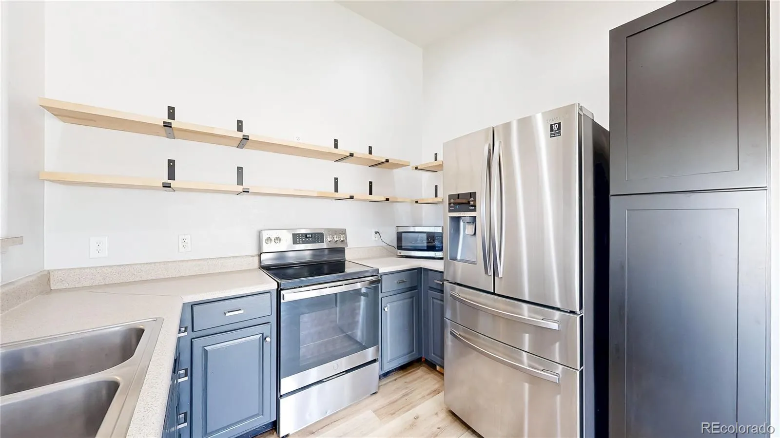 The kitchen flows seamlessly into the dining and living areas, featuring a modern, open-shelving design that creates a light and contemporary feel. This unique layout offers a clean aesthetic and easy access, while the tall pantry next to the refrigerator provides additional storage.