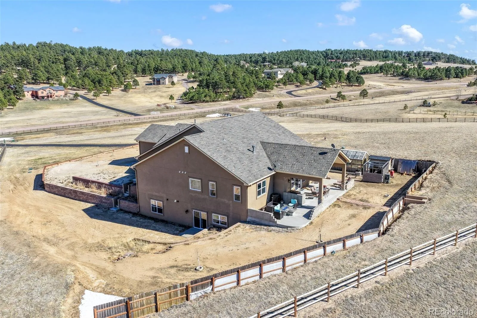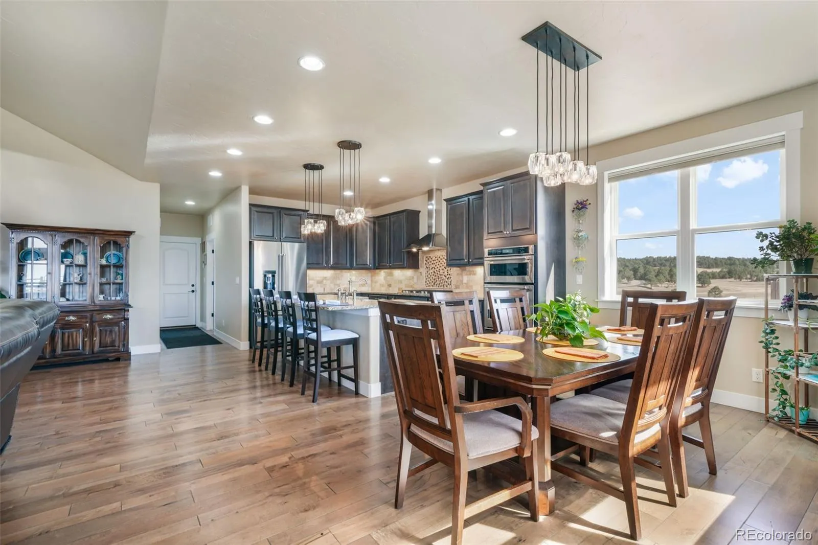 Nestled in a quiet cul-de-sac on nearly 4.5 acres, this immaculately maintained ranch style home with a finished walkout basement offers space, comfort, and exceptional quality throughout. Pikes Peak views, stunning natural light, hand troweled walls, hardwood floors in main living areas, upgraded Pottery Barn light fixtures, and soft-close cabinetry elevate the home’s warm, inviting feel. The kitchen features stainless steel KitchenAid appliances including a wall oven, convection microwave, dishwasher, refrigerator, and gas range with hood, plus granite counters, upgraded cabinetry, a large island with single basin sink, and a walk in pantry with wood shelves. The living room is anchored by a gas fireplace with a beautiful mantle and granite hearth. The spacious primary suite includes a luxurious ensuite with dual vanities, an expansive shower with dual shower heads, tile to the ceiling and frameless glass door, a freestanding soaking tub, and a walk in closet customized by California Closets. In addition to the powder room, there is a full hall bathroom and 2 additional main level bedrooms with huge closets. The laundry room includes cabinetry, single basin utility sink, granite counters and the washer and dryer are included. The finished walkout basement is ideal for entertaining or multigenerational living with three massive secondary bedrooms with walk in closets, two full bathrooms, a large family room/rec room with pool table and shuffleboard, and an incredible bar with sink, abundant cabinetry, and granite counters. Outside, enjoy the west facing covered poured concrete patio spanning the width of the home, an asphalt driveway, oversized 4 car garage with an extended height bay door, chicken coop, greenhouse and split rail fencing along the perimeter. Dependable high speed fiber optic internet and Wi-Fi are available. Less than 10 mins to Peyton schools and 15 mins to King Soopers, Walmart and dining. Approximately 15 mins to Hwy 83 and 25 mins to I-25.