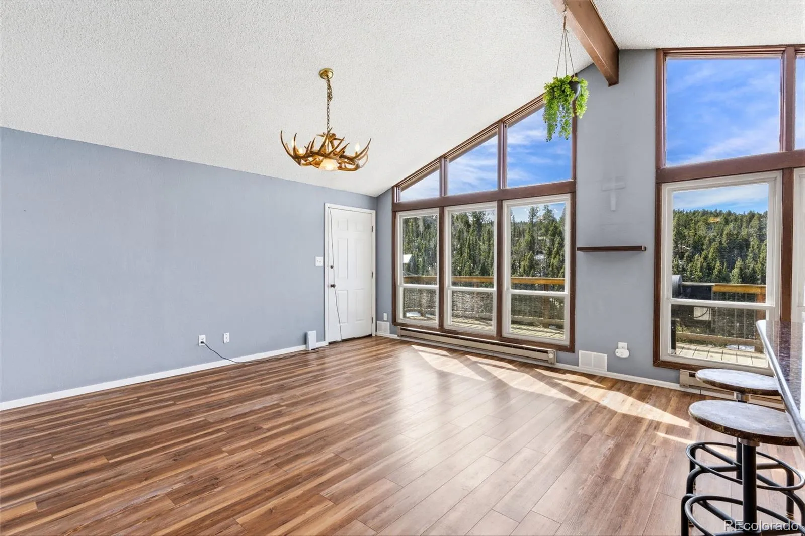 Tucked into the scenic Highland Lakes community, this inviting raised ranch offers a blend of Colorado charm, everyday comfort, and space to truly spread out. Set on 1.39 acres with views toward Elk Lake, the setting feels peaceful and private while still being conveniently located hear Highway 24 for an easy drive to Woodland Park, Colorado Springs, or even a quick trip to Cripple Creek. Inside, the home welcomes you with vaulted ceilings, exposed beam accents, and a wall of windows that brings the outdoors in. The main living area feels open and connected, with the living room flowing into the kitchen, where granite countertops and included appliances make it easy to settle right in. Laminate flooring runs throughout, creating a cohesive and low-maintenance feel. The lower-level family room offers a cozy retreat with a pellet stove and walk-out access to a sunroom that adds even more flexible living space. With tile flooring and a tongueand-groove ceiling, it’s the kind of room you’ll find yourself using year-round—perfect as a sitting area, home office, workout space, or playroom. With four bedrooms and two full bathrooms, there’s room for everyone, and the updated baths add a fresh, modern touch. Step outside and take in the expansive wraparound deck, ideal for morning coffee, evening sunsets, or simply enjoying the quiet surroundings. Rustic yet refined, the home also features natural gas and high-speed internet, giving you the best of mountain living without sacrificing modern convenience. Located within the RE-2 Woodland Park school district and close to stocked fishing at Elk Lake, this is a property that offers both lifestyle and livability in one of Divide’s most desirable communities.
