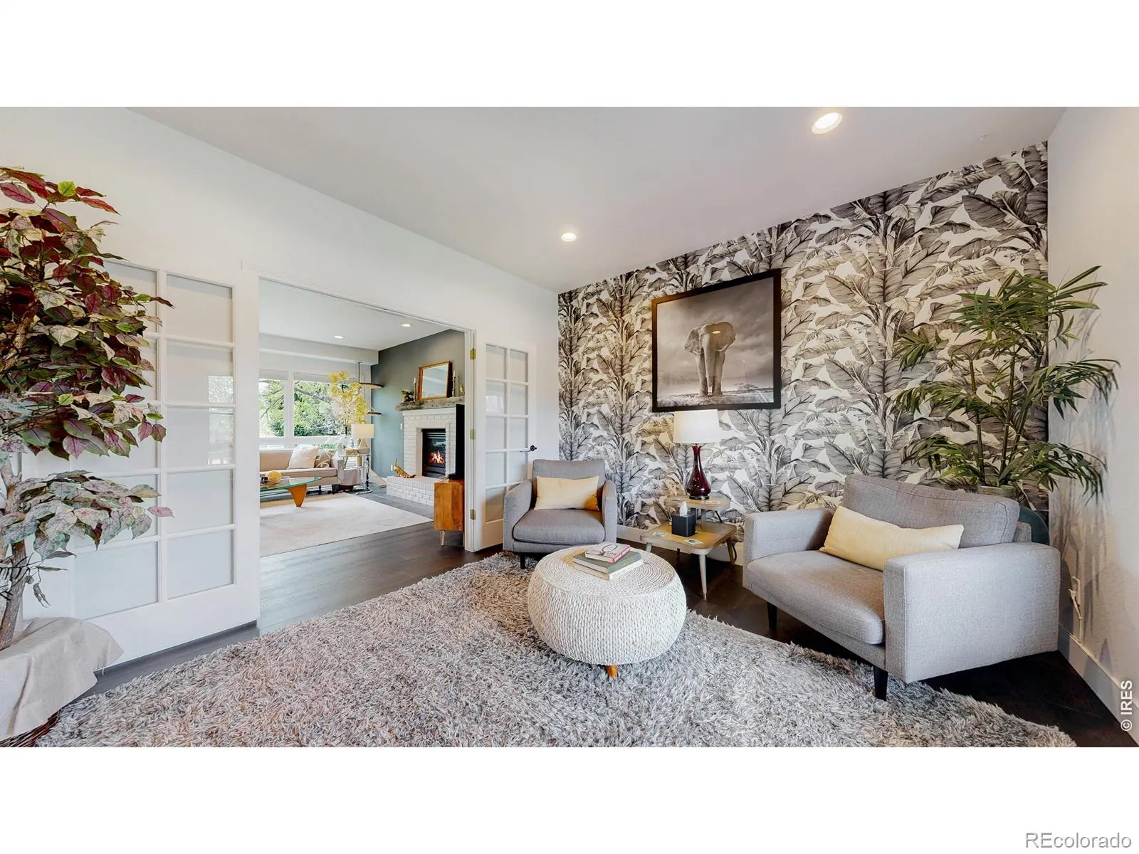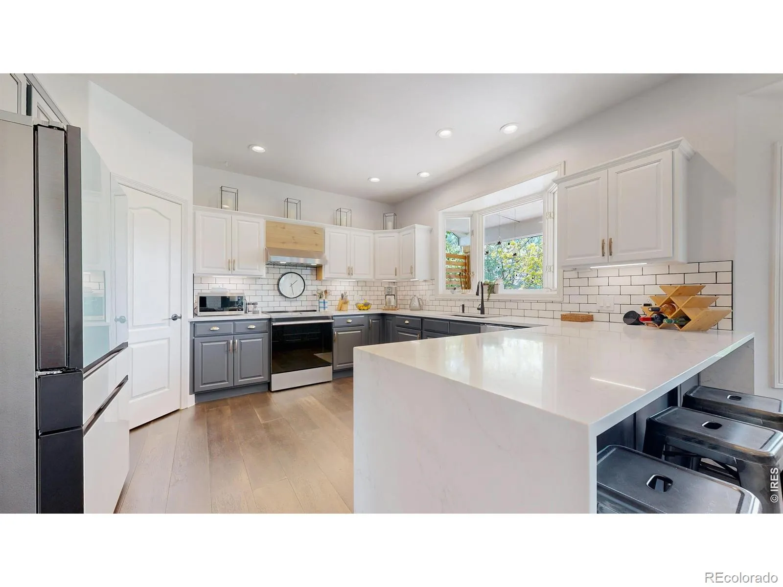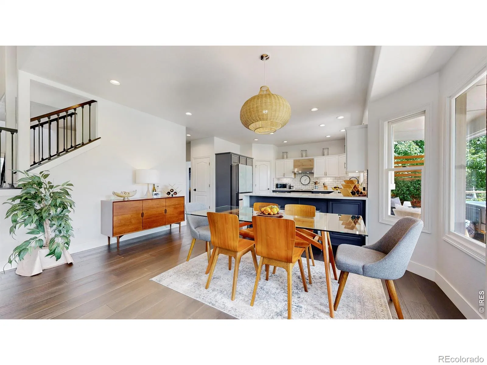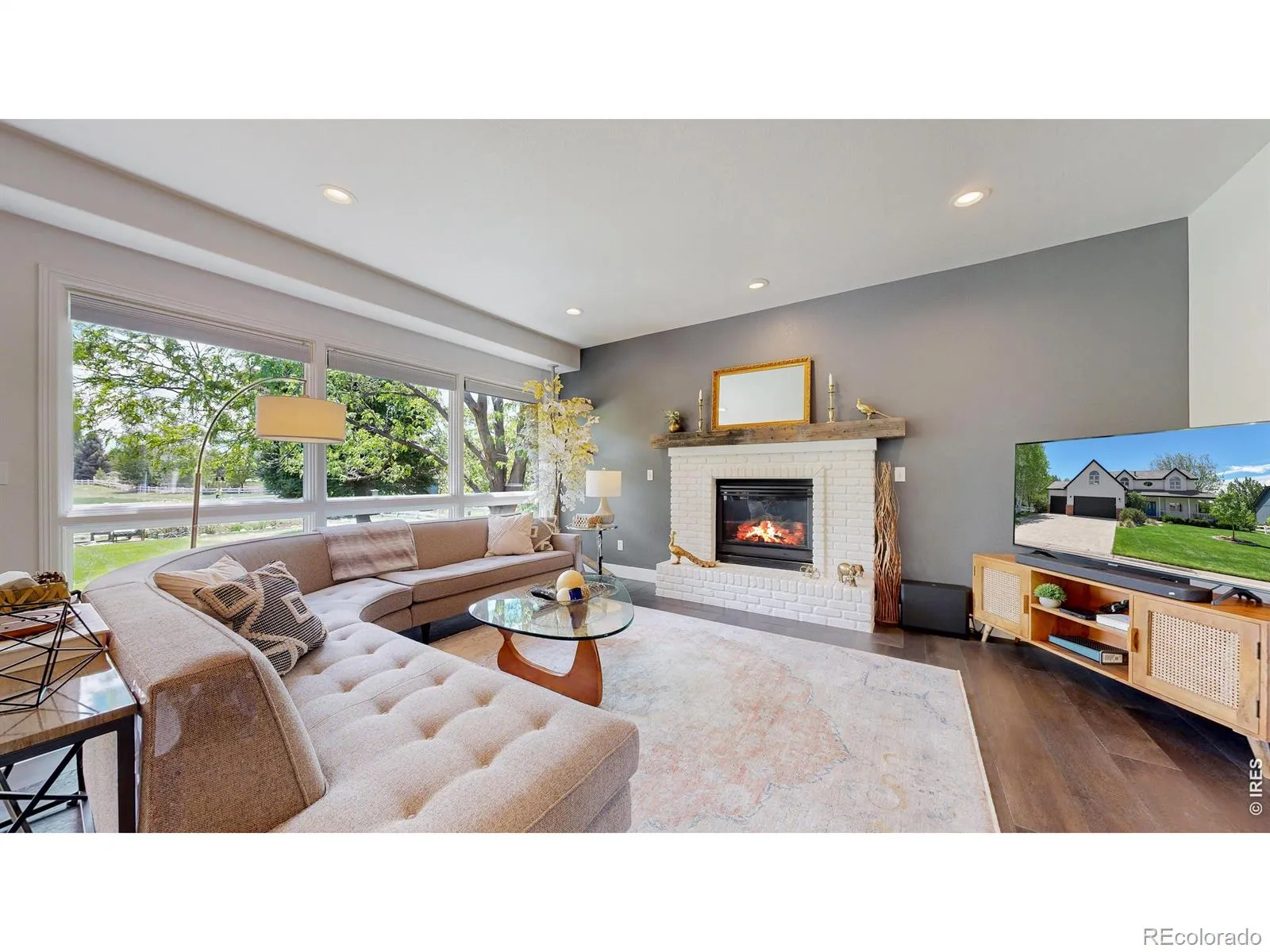 Welcome to this beautifully updated home in Country Meadows, ideally positioned near trails, golf, medical, shopping, and commuter access. Set along a quiet residential loop and backing to an unobstructed greenbelt view, this home blends refined style, natural light, and flexible living spaces designed for the way people live today. The inviting main level features a bright, open living area with a modern flow and expansive windows, French oak wide-plank floors, and a gas fireplace. The kitchen is stylish and functional, with quartz countertops, resurfaced cabinetry, subway tile backsplash, generous prep space, and easy flow for everyday living and entertaining. Upstairs, the spacious primary suite offers a fully remodeled spa-inspired bath with designer finishes, soaking tub, and walk-in shower. Two additional bedrooms share a full bath, while the upgraded laundry room and hidden bookshelf door open to a versatile flex room ideal for an office, studio, guest retreat, or 5th bedroom option. The recently finished basement adds exceptional livability with a welcoming entertaining space, stylish wet bar with beverage fridge, cozy under-stair office or reading nook, additional bedroom, full bath with walk-in shower, and flexible open area for movie nights, workouts, or casual gatherings. Outside, the professionally landscaped backyard opens to a private and bucolic view with protected open space framed by classic white pasture fencing, creating a rare sense of privacy and connection to the outdoors. Near Bamford Elementary and within the Fossil Ridge High School district, this home offers thoughtful updates, memorable design, and everyday functionality in a highly convenient location.