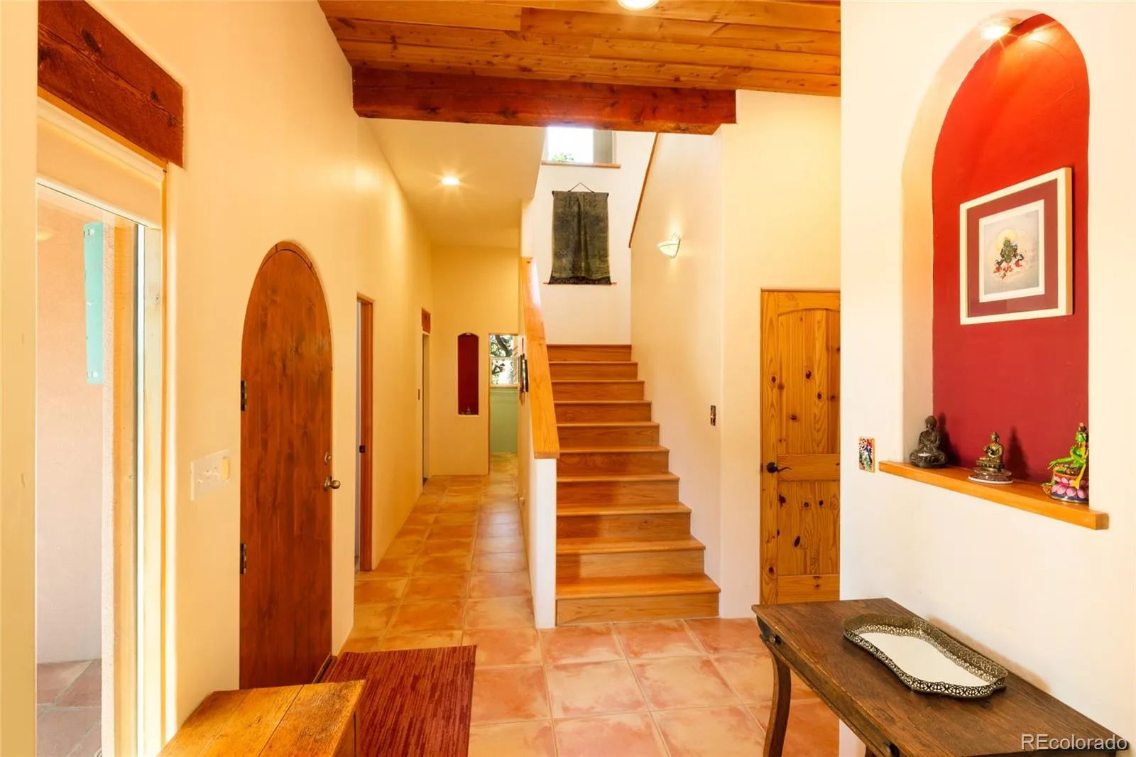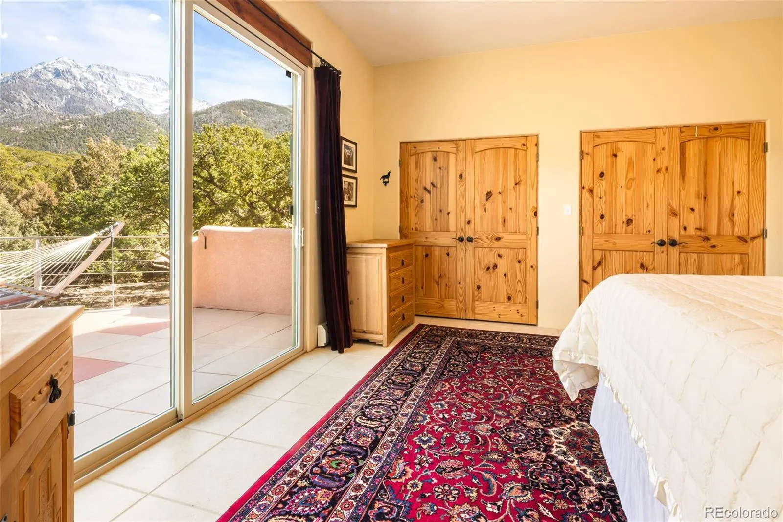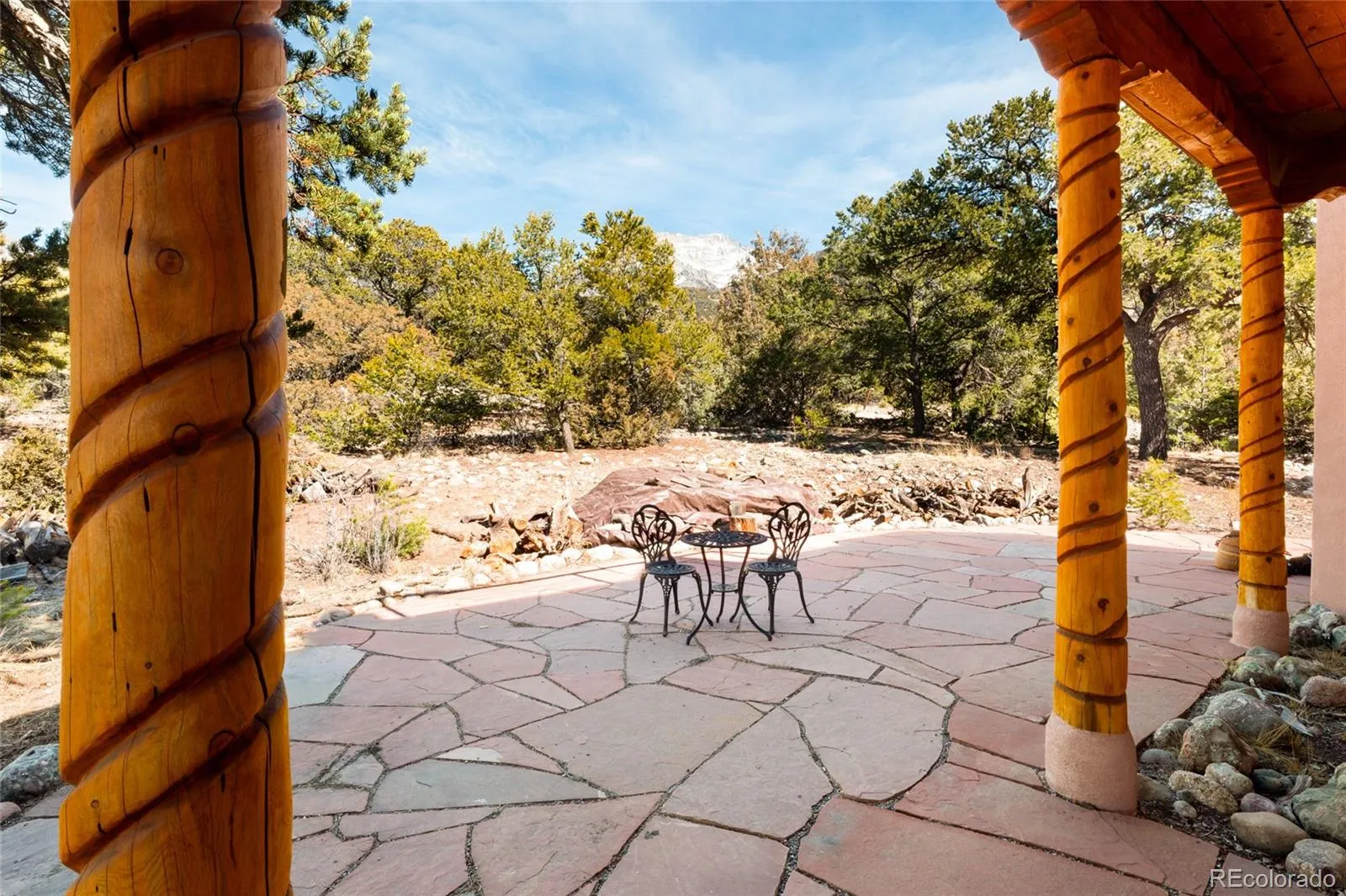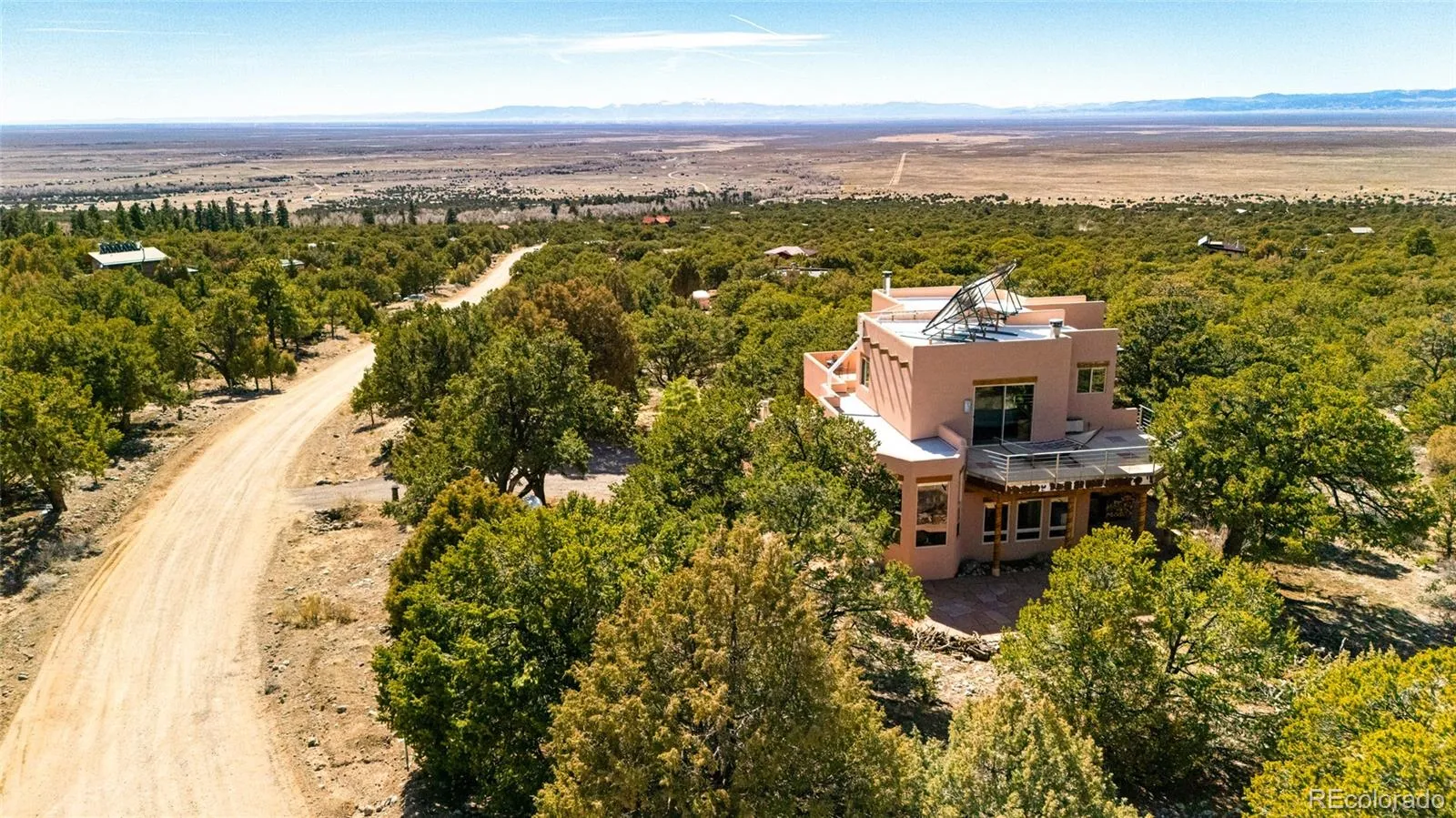Beautiful 3bd/3ba Lee Mitchell Home designed and built home on 2.29 acres backing greenbelt and across the street from Willow Creek, and remodeled with architectural designs by Tokyo artist/designer Hisa Ota. The expansive mountain and valley views are witnessed in all directions of this beautiful layout, and protected from neighbors by the acreage and trees. The house sits perched in the foothills of the Sangre De Cristo mountains, and is surrounded by an impressive flagstone patio on three sides. New Solar Thermal Drainback system for radiant floors, keeping the heating costs very low. Downstairs the open, natural light filled floorpan accommodates a sizable Spanish tiled foyer opening into the living room, fitted with a large kiva fireplace and a glass wall leading to the sunroom. The dining room enjoys huge widows with mountain views, leading to the ample cabinet lined kitchen and glass-fronted pantry. Stainless appliances are all new within the last 3 years, and a whole house filter keeps the water as pure as possible. Down the hall include two ample sized bedrooms, full bath, and cork-floored flex room (currently used as library/yoga studio/office space) leading into insulated two car garage. Up the oak stairs to the window surrounded landing/seating, to the primary suite, complete with two double sets of closets, sliding doors leading to private 300 sqft mountainview balcony, and a lovely 5 piece bathroom with bathtub views and Toto bidet. Across the hall, the expansive views of the valley surround the Kiva heated space, and open in two directions/sliding doors to a 800 sqft tile deck and pristine 4 person hot tub. Outside, tiered landscaping provides easy opportunity for a gardener to enjoy. Membrane roof on majority of the home replaced last year with 20-40 yr lifespan, and new synthetic stucco with 20+ year lifespan 5 years old. This home is a must see gem, check out via virtual tour or in person!