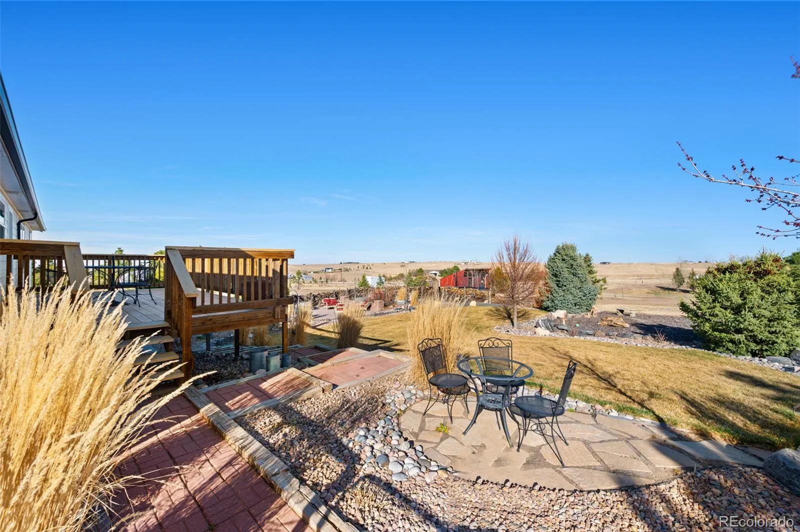 Experience the best of Colorado country living on this stunning 5-acre property with no HOA, room for all your toys, and Pikes Peak views. This beautifully maintained and thoughtfully updated 5-bedroom, 3-bathroom home offers the perfect blend of comfort, functionality, and outdoor space. The professionally landscaped and fully irrigated lot features over 200 trees, creating a private, serene setting. Enjoy outdoor living at its finest with a stamped concrete front porch, covered patio, new decking, and an additional concrete paver patio complete with fire pit — perfect for entertaining or relaxing while taking in the views. A hot tub hookup is ready for your future spa retreat. This home shines with new Andersen windows, new exterior paint, and a new roof. The main level boasts updated hardwood floors, while the finished walk-out basement features new carpet. The updated kitchen is both stylish and functional with stainless steel appliances, concrete countertops, farmhouse sink, built in buffet/bar area, and under-cabinet lighting. Car enthusiasts and hobbyists will love the heated, oversized 3-car garage with 10-foot doors, 15-foot ceilings, and side-mount openers – designed with a future vehicle lift in mind. Equestrian-ready amenities include a 2-stall loafing shed, plus an additional storage shed for all your tools and equipment. Located in Elbert County, but within the highly sought-after Douglas County School District and only 20 minutes to downtown Parker or Southlands, this property delivers the peace of rural living with convenient access to nearby amenities. If you’re looking for space, views, and freedom—this is Colorado living at its finest in this move in ready home!