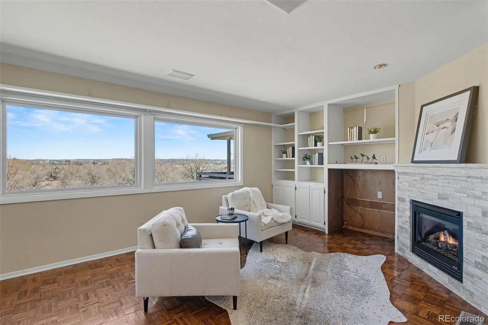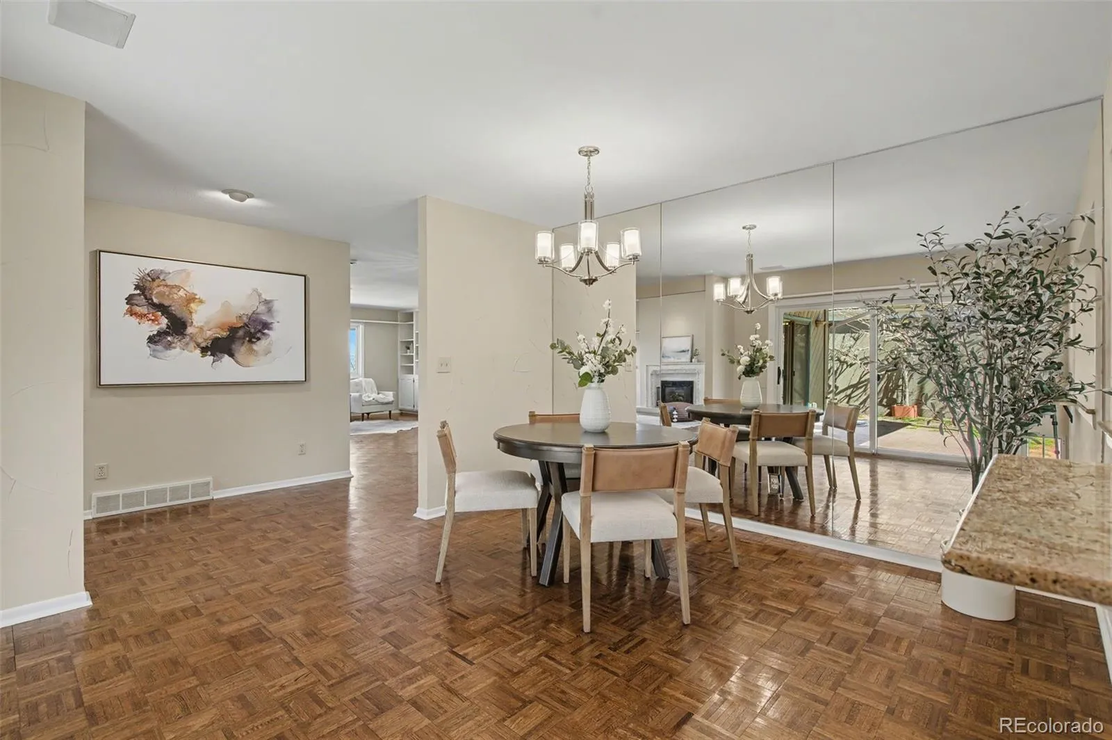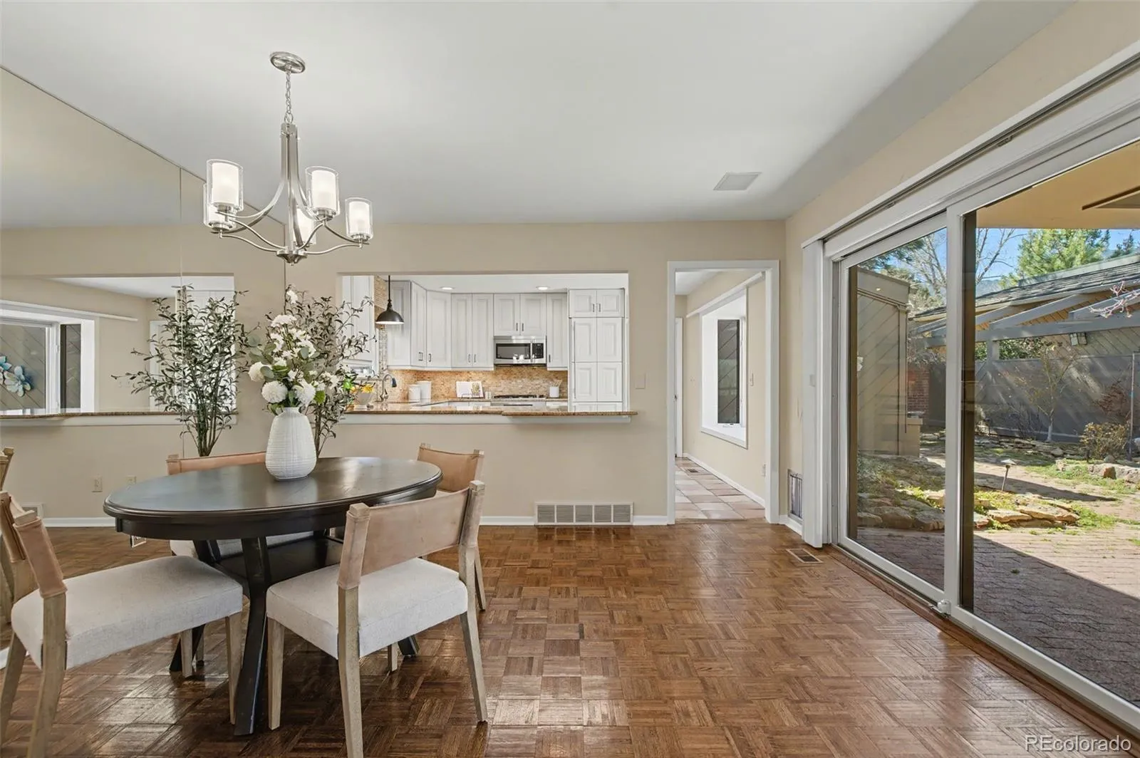 Tucked within the coveted and gated Spring Grove community, this exceptional residence captures the essence of Colorado living and perfectly positioned on a north-facing lot with breathtaking mountain views and open space to the rear, offering both privacy and serenity. From the moment you step inside, natural light pours through expansive windows, framing the home’s tranquil setting and creating seamless connections to multiple outdoor living spaces. Elegant beamed ceilings pair beautifully with rich parquet flooring, setting a warm and refined tone throughout. The formal great room, anchored by a gas fireplace, flows effortlessly to a charming courtyard. This intimate oasis is complete with a soothing water feature. A covered patio extends the living experience year-round, ideal for quiet mornings or evening gatherings. A thoughtfully designed main-level den, adorned with custom built-ins and a second fireplace, offers a cozy and inviting retreat and a perfect nook for reading, relaxing, or working from home. At the heart of the home, the remodeled kitchen is both stylish and functional, opening gracefully to the dining area and creating an ideal environment for entertaining and everyday living. The lower level reveals a private primary suite designed for ultimate relaxation, featuring a third fireplace and walk-out access to a peaceful flagstone patio. The spa-inspired bathroom elevates the experience with a steam shower, jetted soaking tub, and an expansive walk-in closet. Guests are equally well accommodated with their own ensuite retreat. Additional highlights include new neutral paint, a heated two-car garage with built-in storage, air conditioning, and a host of thoughtful upgrades throughout. This is a rare opportunity to enjoy refined comfort, exceptional privacy, and timeless design in one of Spring Grove’s most desirable settings. Additionally, the neighborhood lends itself to leisurely walking trails, access to restaurants, shopping.