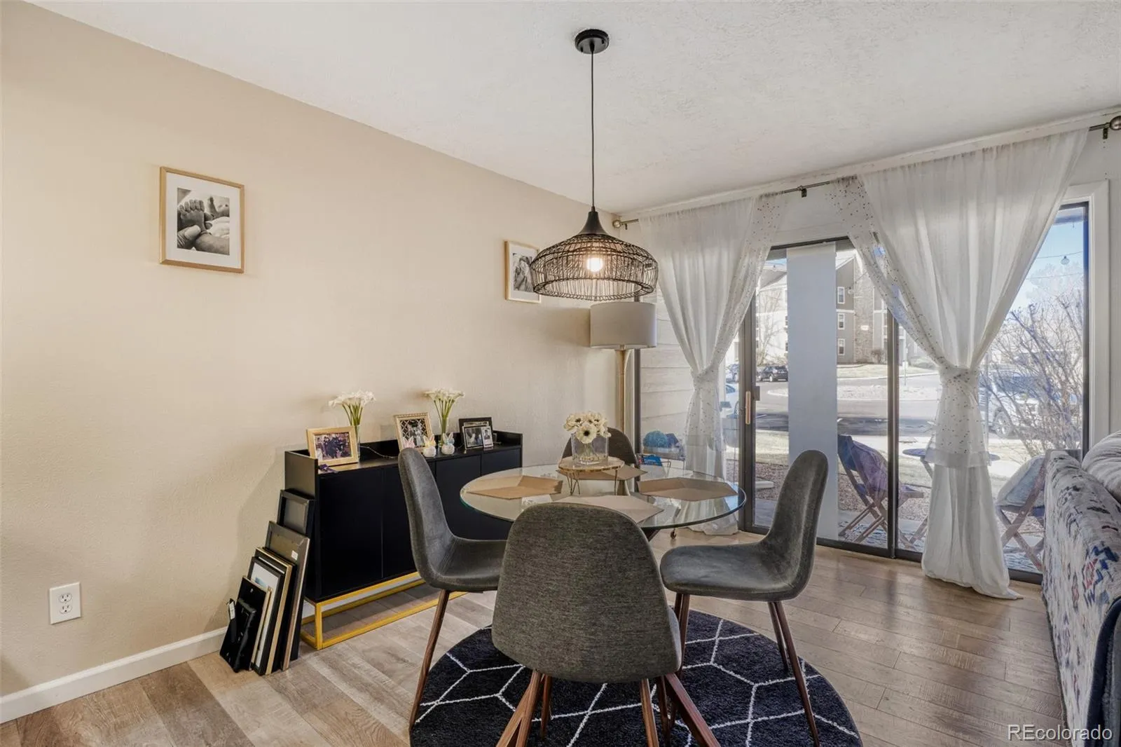 Truly a remarkable remodel with designer-inspired touches throughout, this beautifully updated condominium offers the perfect blend of style, comfort, and convenience. GROUND LEVEL + END UNIT. A bright and inviting open floor plan seamlessly connects the living, dining, and kitchen areas, creating an ideal space for both everyday living and entertaining. The kitchen features crisp white cabinetry, sleek quartz countertops, stainless steel appliances, and a striking herringbone tile backsplash, complemented by a modern undermount sink, high-arc faucet, and contemporary lighting. The updated bathroom showcases clean, modern finishes with a stylish vanity, matte black hardware, framed mirror, upgraded lighting, and eye-catching patterned tile flooring, along with a classic tiled tub/shower surround. A generously sized bedroom, ample storage, and the convenience of in-unit laundry enhance the home’s functionality, while a private covered patio provides the perfect place to relax and enjoy Colorado’s beautiful weather. Ideally located within walking distance to the community pool and just minutes from shopping, dining, and everyday amenities, this move-in ready Appletree West gem offers low-maintenance living in a prime location and is sure to impress.