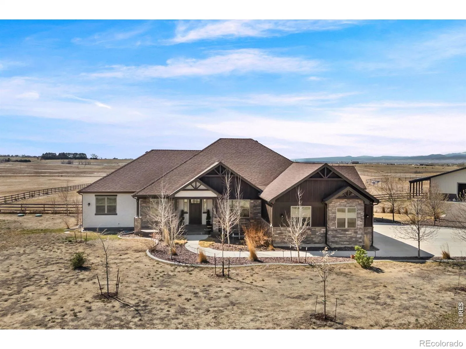 Custom 4-bedroom, 4-bath home set on over 10 acres, offering the perfect blend of comfort, craftsmanship, and elbow room. The open-concept floor plan is enhanced by vaulted ceilings with exposed beams in the kitchen, living room, and primary suite, creating a warm and inviting atmosphere. The gourmet kitchen features high-end Decor appliances, beautifully complemented by rustic hickory flooring and rich knotty alder cabinetry, trim, and doors throughout the home. A stunning stone fireplace anchors the main living space, while the basement is already prepped for a wet bar-ideal for future entertaining. Designed with equestrian living in mind, the property includes an impressive 48×36 barn that offers four rubber-matted stalls, a full concrete floor, and heated automatic waterers for year-round convenience, plus shared irrigation water rights, vinyl horse fencing, and is thoughtfully divided into two pastures with a riding arena.