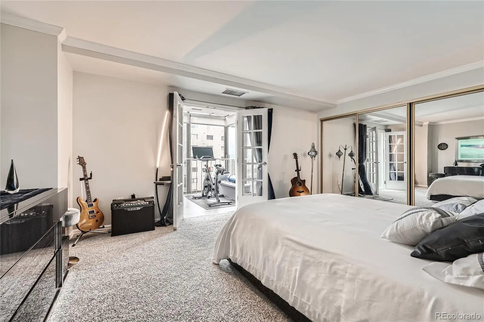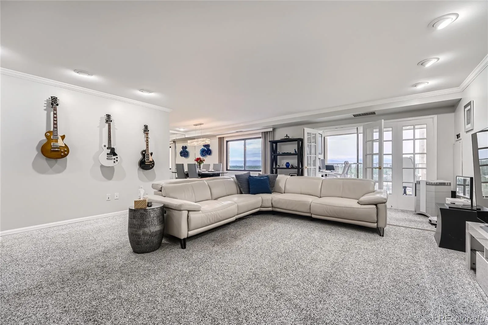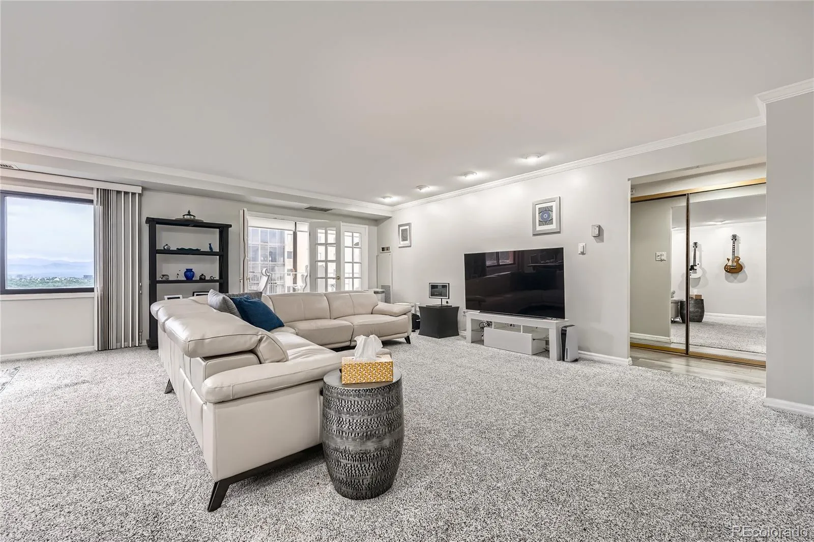 Unit 1207 is a west-facing corner unit perched on the 12th floor, delivering Rocky Mountain views that stretch across the entire Front Range. While most units in the building have open industrial ceilings, this one features finished ceilings with crown molding throughout — an upgrade that sets it apart immediately.