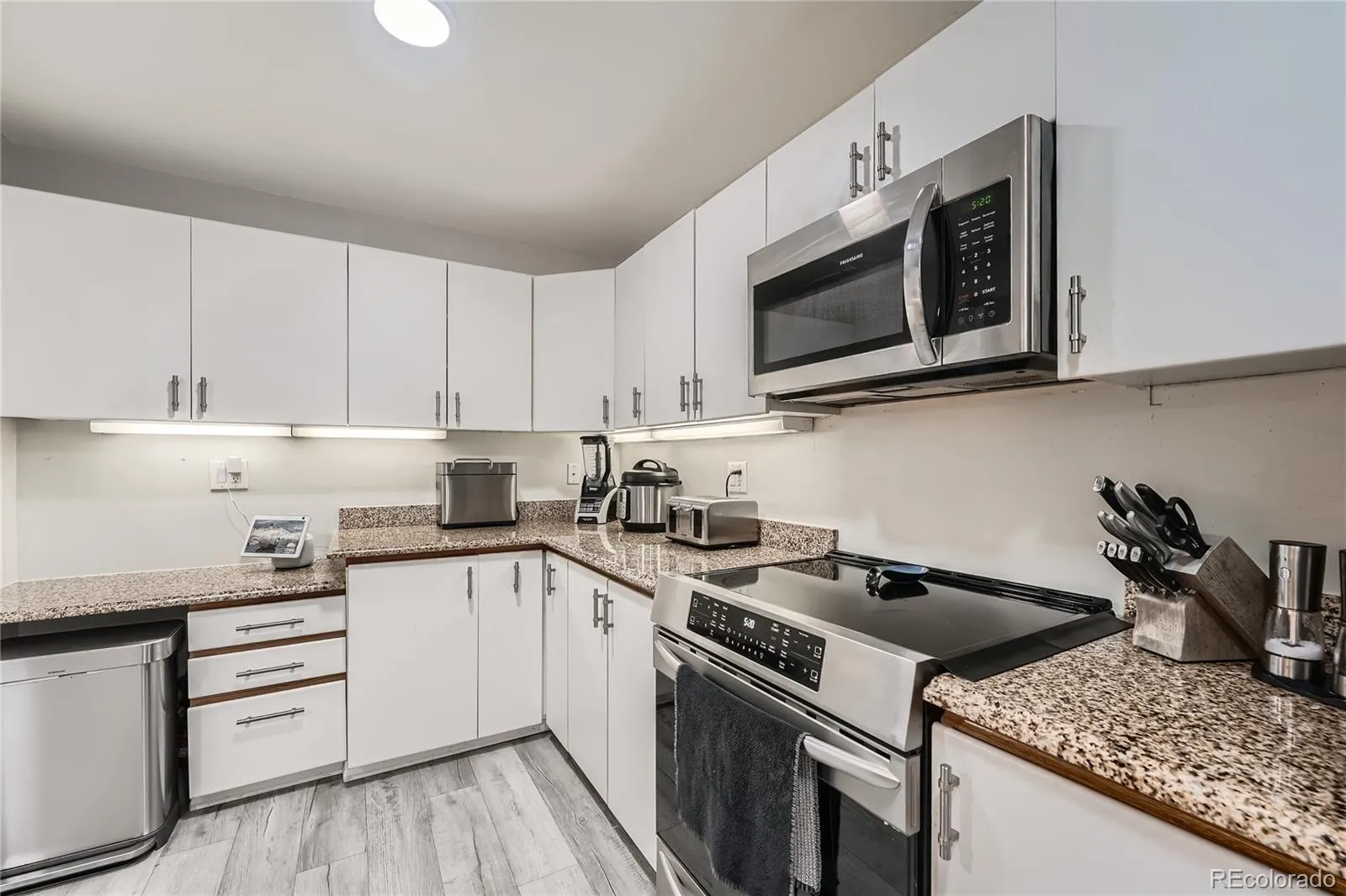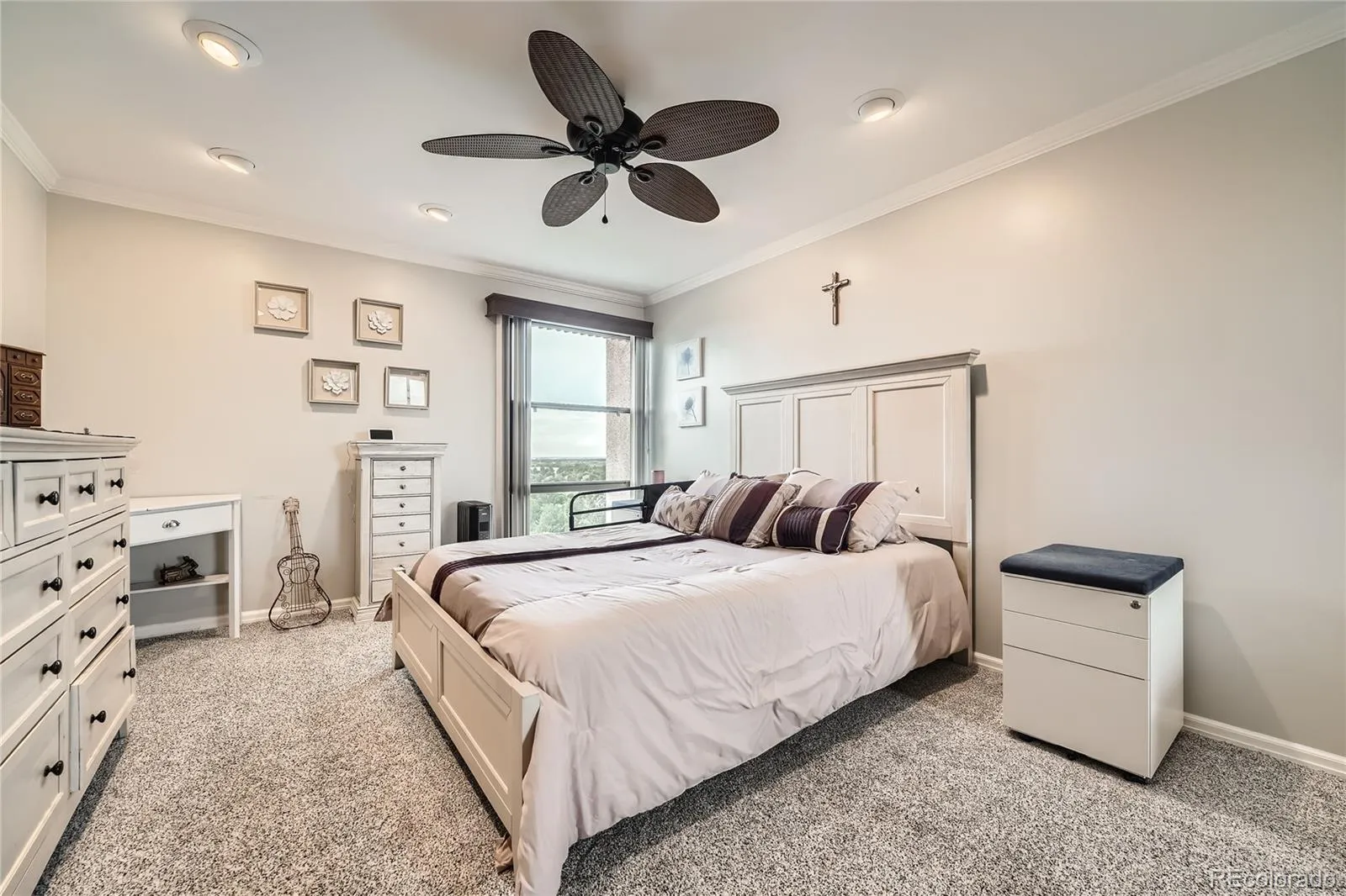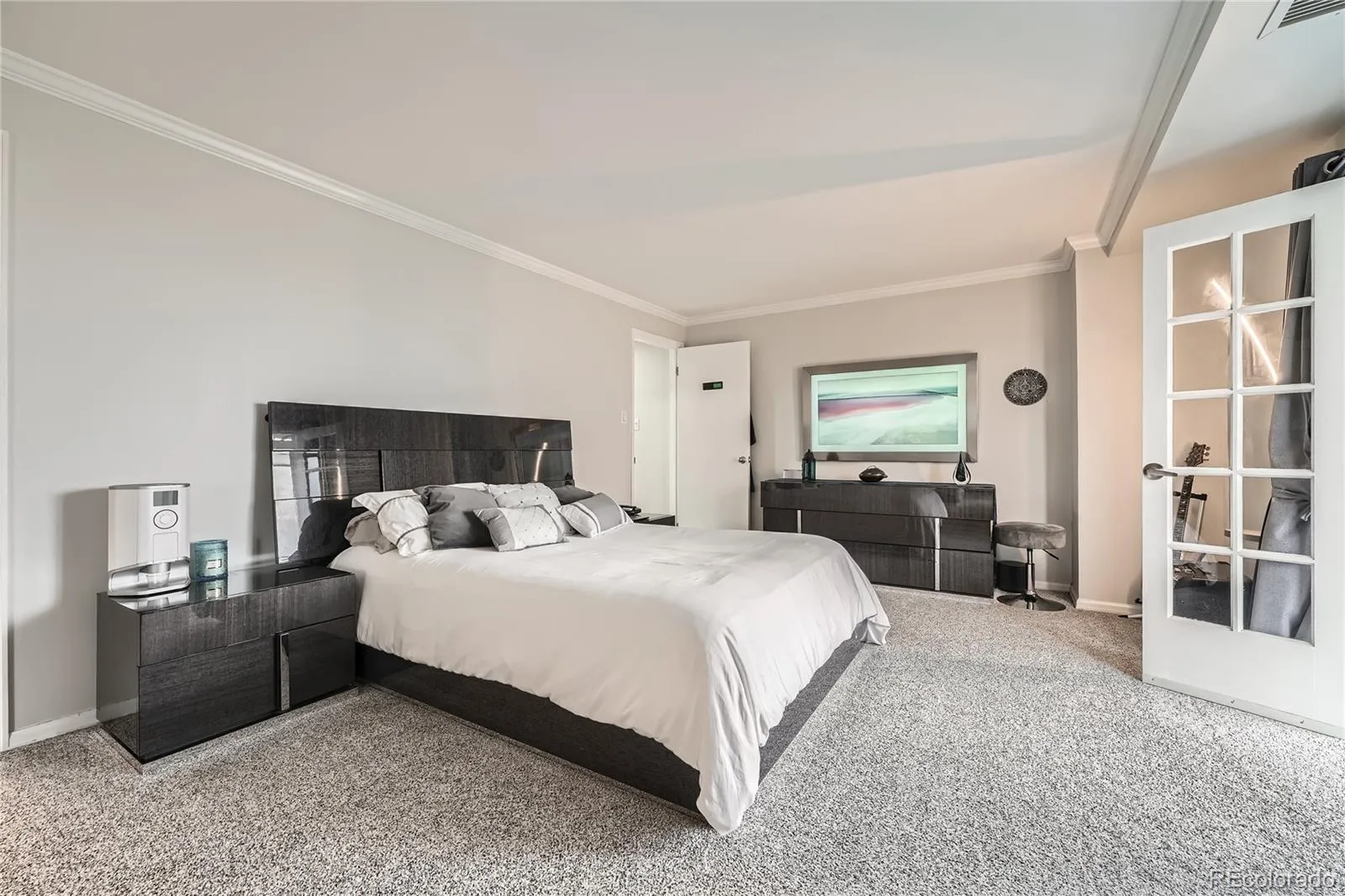 Unit 1207 is a west-facing corner unit perched on the 12th floor, delivering Rocky Mountain views that stretch across the entire Front Range. While most units in the building have open industrial ceilings, this one features finished ceilings with crown molding throughout — an upgrade that sets it apart immediately.