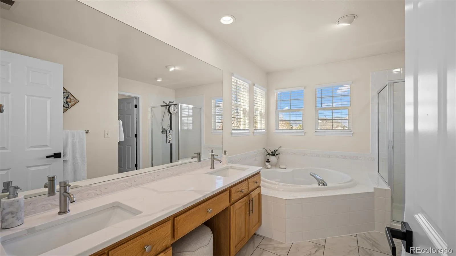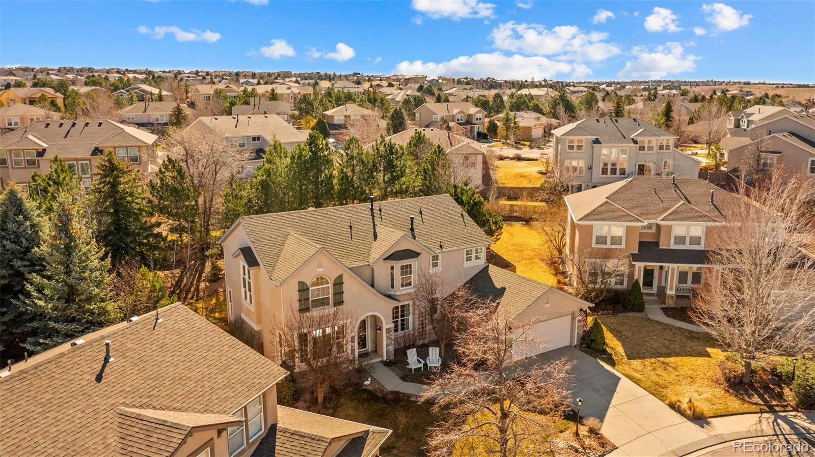Located in the highly sought-after Pine Creek community, this spacious two-story home offers 5 bedrooms, 4 bathrooms, and nearly 4,000 finished square feet, combining comfort, functionality, and an exceptional location within Academy District 20. Enjoy the rare convenience of being able to walk to both the elementary and middle school without crossing a street. The main level features a bright and inviting layout with vaulted ceilings, abundant natural light, and multiple living spaces, including a formal living room, separate dining room, and a cozy family room with a gas fireplace. The beautifully updated kitchen is designed for both everyday living and entertaining, showcasing new maple cabinetry, quartz countertops, ample storage, a large breakfast bar, pantry, and an eat-in dining area with walk-out access. Upstairs, the primary suite provides a relaxing retreat with a 5-piece bath, double vanity, soaking tub, and walk-in closet. Three additional bedrooms upstairs offer plenty of space, including one with its own walk-in closet. The finished basement expands your living options with a large second family room, wet bar, additional bedroom, and full bathroom, making it perfect for guests, entertaining, or multi-generational living. Situated on a level cul-de-sac lot with mountain views, the property features a fully fenced yard, mature landscaping, and space to enjoy outdoor living. Additional highlights include central A/C, a 3-car tandem garage, sprinkler system, and included extras such as a pool table, mini fridge, and backyard swing. Conveniently located near parks, shopping, and dining, this home offers the perfect combination of space, updates, and lifestyle in one of Colorado Springs’ premier neighborhoods.