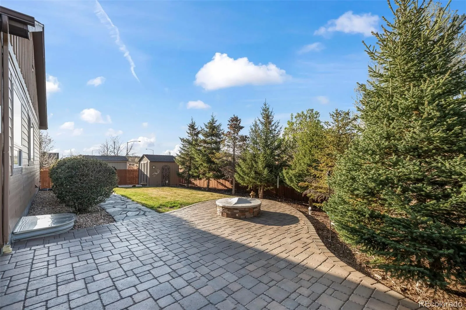 The backyard is fully fenced and beautifully landscaped, featuring a paved area with a built-in gas grilling station, a grassy lawn, and a storage shed. Conveniently located near shopping and dining options with easy access to I-25 and E-470, commuting to Denver, Boulder, and DIA is easy.