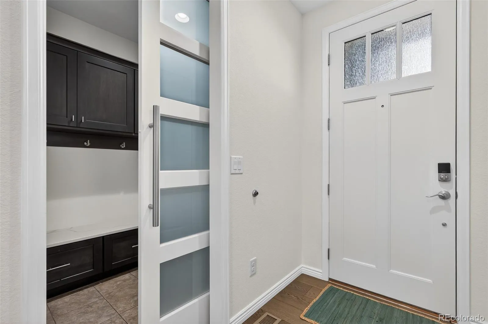 Ssshhh… Your neighbors will be jealous to know your electric utility cost from day one can be 73% less! This home comes with a fully paid-off solar system which produced a savings $1759 for the 2025 calendar year! This masterfully updated ranch-style home is designed for the modern entertainer, the open-concept main floor features soaring high ceilings and rich engineered hardwood flooring throughout. The gourmet kitchen is a chef’s dream, anchored by gleaming granite countertops, custom deluxe cabinetry with dovetail joints, soft-close hinges, under-cabinet lighting, and convenient pull-outs ensure a seamless culinary experience. From the kitchen step through the retractable screen door to your covered back patio—an idyllic sanctuary for morning coffee or sunset wine while overlooking the greenbelt. Inside, the great room centers around a stunning custom gas fireplace, creating a warm and sophisticated focal point for gatherings. The Owner’s Retreat is functional with a spacious ensuite bathroom featuring custom tile work in an oversized shower, flowing directly into a generous walk-in closet. For ultimate convenience, the closet connects directly to the laundry room, which is fully equipped with a utility sink. A second bedroom currently serves as a refined home office, complete with a built-in Murphy bed for guests. Stay organized with a dedicated mudroom featuring quartz-topped bench seating and ample storage. The basement offers a large family & game room, a third large bedroom, and a clever walk-in storage closet currently utilized as a second office. An unfinished gym area provides endless storage or fitness potential.